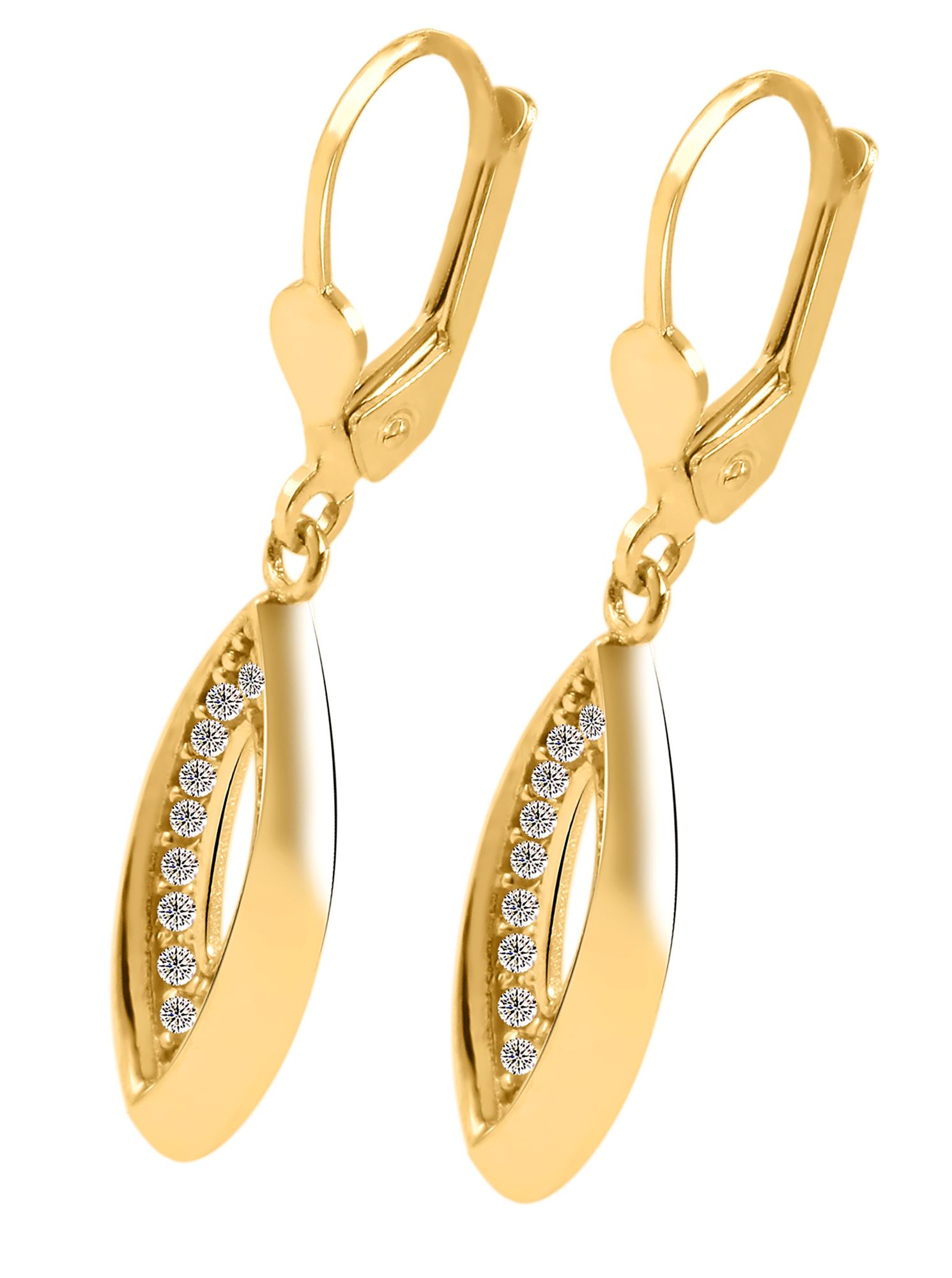 Die femininen Ohrringe sind aus 333er (8 Karat) oder 375er (9 Karat) Gold hergestellt. Die Ohrringe sind Gelbgold und zusätzlich mit jeweils 16 funkelnden Zirkoniasteinen verziert. Der weiße Besatz bildet dabei einen ansprechenden Kontrast. Verschlossen werden die Goldohrringe mit einer praktischen Klappschließe, die ebenfalls aus Echtgold besteht, sich leichthändig bedienen lässt und für sicheren Halt am Ohrloch sorgt. Rundum sind diese Ohrringe schöne Accessoires und das perfekte Geschenk für die moderne Frau von heute. Die Maße ergeben sich aus einer Länge von 16 mm, einer Breite von 7 mm und einer Materialstärke von 2 mm. Dieses Produkt wird auf einem weißen Schmuckkärtchen geliefert. Es hat eine Maße von 38 x 54 mm und eignet sich ideal zum Präsentieren in dem dazu geeigneten Display oder zum Verpacken als Geschenk.