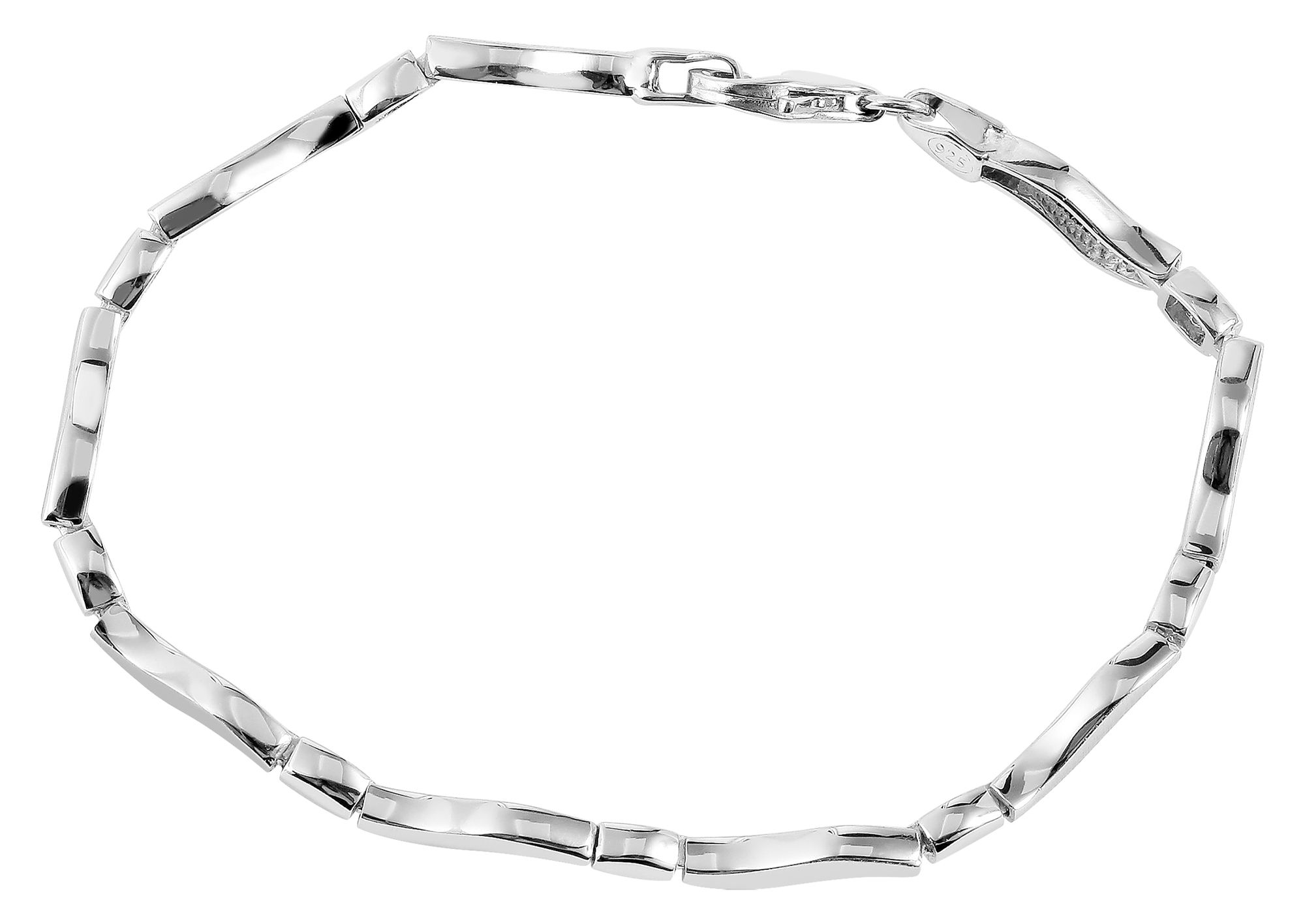 Das Schmuckarmband in besonderer Formgebung wurde aus 925/- Sterling Silber gefertigt. Es hat eine Länge von 17,5 cm, eine Breite von 4 mm und eine Kettenstärke von 3 mm. Mit einem klassischen Karabinerhaken wird es verschlossen und so am Handgelenk gesichert. Das gesamte Armband ist rhodiniert. Das heißt, es ist mit einer hochwertigen Edelmetallschicht überzogen, die das Schmuckstück vor dem Anlaufen schützt. Außerdem hebt das Rhodium den Silberton hervor und verleiht einen perfekten Glanz. Die Besonderheit des Silberarmbandes ist die besondere Form der einzelnen Kettenelemente. Diese sind wellenförmig gestaltet und mit einem kugelförmigen Element unterbrochen. Diese Elemente sind poliert, die wellenförmigen Glieder sind poliert und ergeben im Ganzen ein harmonisches Gesamtbild.