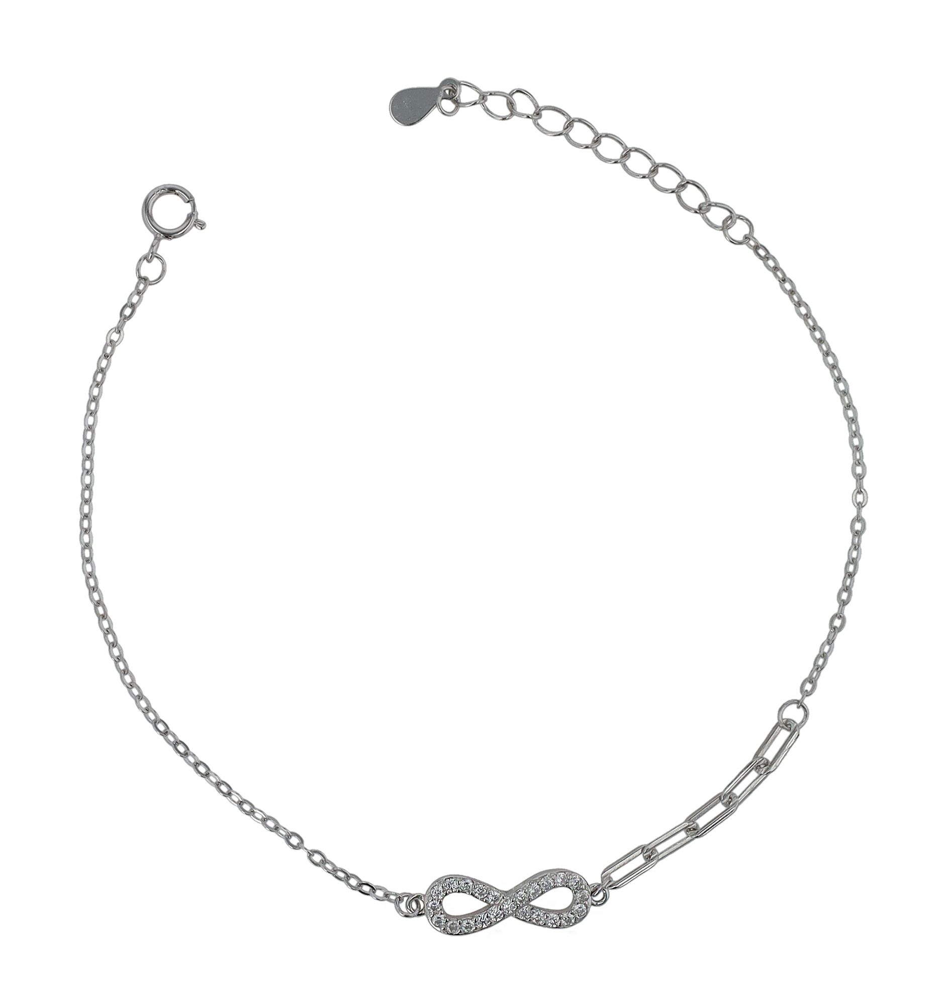 Gefertigt aus 925/- Sterlingsilber und durch eine rhodinierte Beschichtung veredelt, bietet dieses Armband nicht nur einen außergewöhnlichen Glanz, sondern auch eine erhöhte Beständigkeit gegen Anlaufen. Die Rhodinierung sorgt für eine langanhaltende Schönheit und macht das Armband zu einem langlebigen Begleiter. Es zeichnet sich durch zwei unterschiedliche Kettenarten aus, die harmonisch ineinanderfließen und in der Mitte ein Infinity-Symbol tragen. Dieses Symbol ist mit eleganten Zirkoniasteinen besetzt, die für einen beeindruckenden Glanz sorgen.