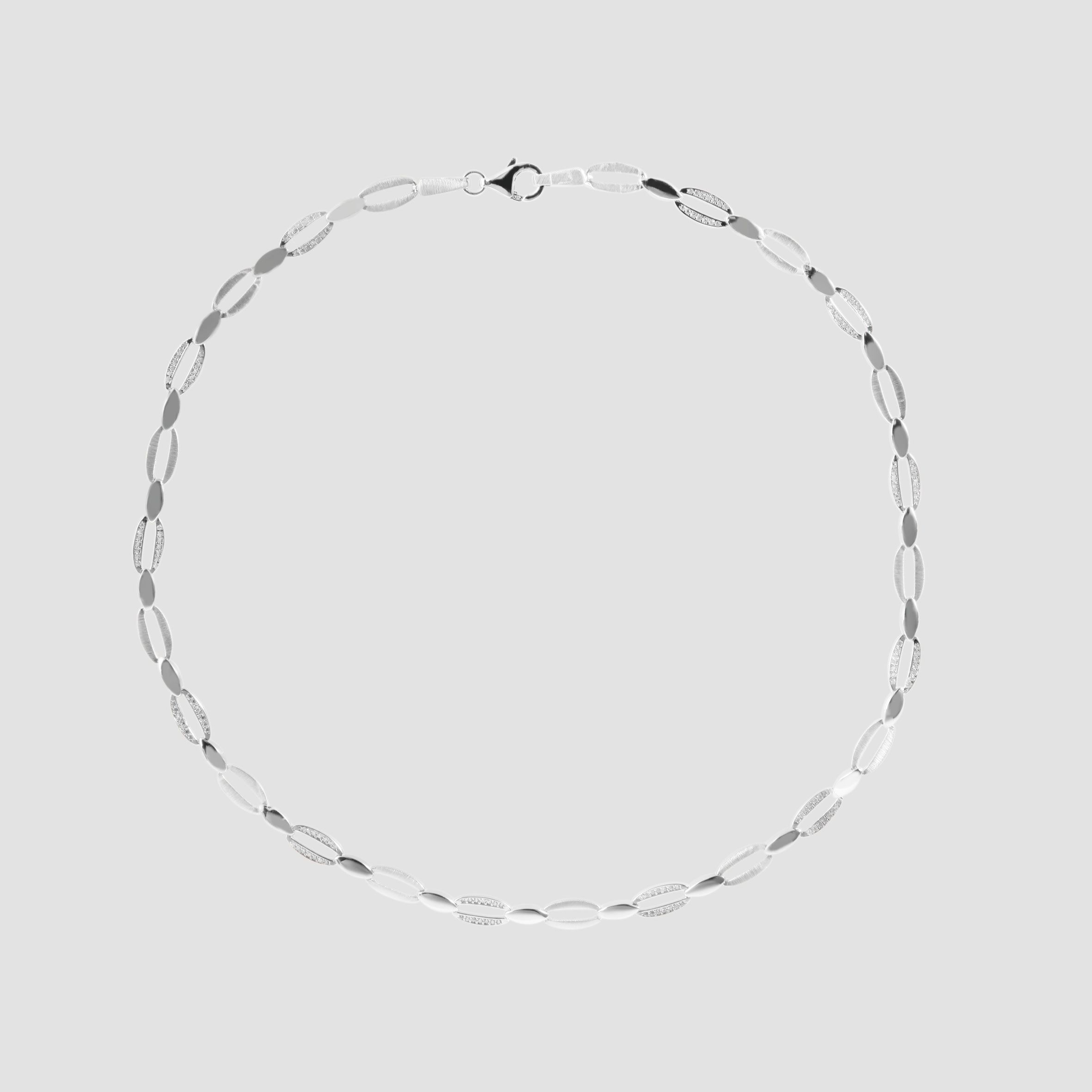 Die Schmuckkette wurde aus 925/- Sterling Silber gefertigt und zusätzlich rhodiniert. Das heißt, sie ist mit einer hochwertigen Edelmetallschicht überzogen, die das Schmuckstück vor dem Anlaufen schützt. Außerdem hebt das Rhodium den Silberton der Kette hervor und verleiht einen perfekten Glanz. Zudem sind die Elemente der Kette in wechselnden Abständen sowohl poliert, als auch mattiert und mit funkelnden Zirkoniasteinen besetzt. Dieses Design verleiht dem Schmuckstück einen edlen und einzigartigen Look. Sie besteht aus ovalen Kettenösen und länglichen Elementen und lässt sich mit einem klassischen Karabinerhaken an Hals sichern. Die Länge beträgt 45 cm, sie hat eine Breite von 6 mm und eine Kettenstärke von 1 mm.
