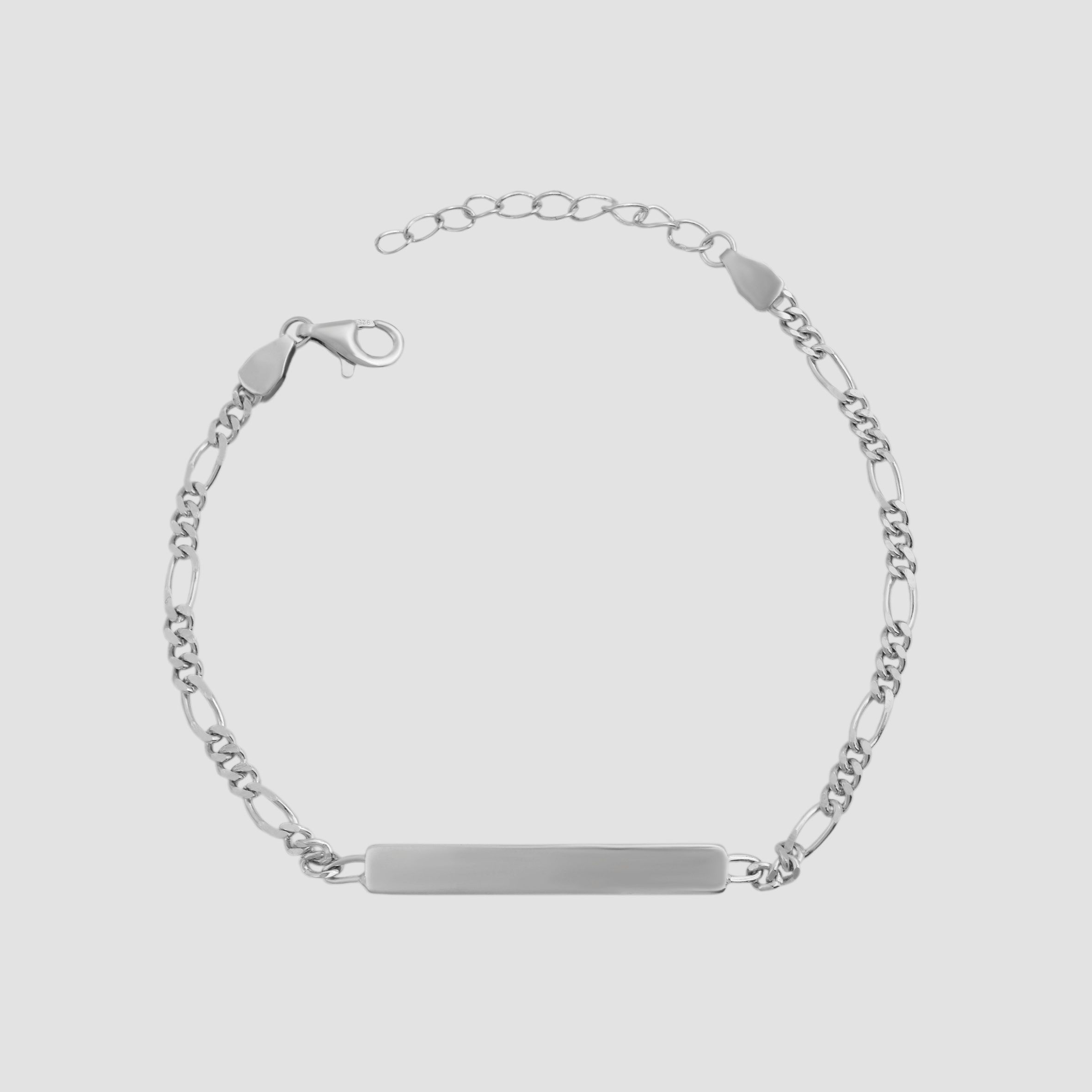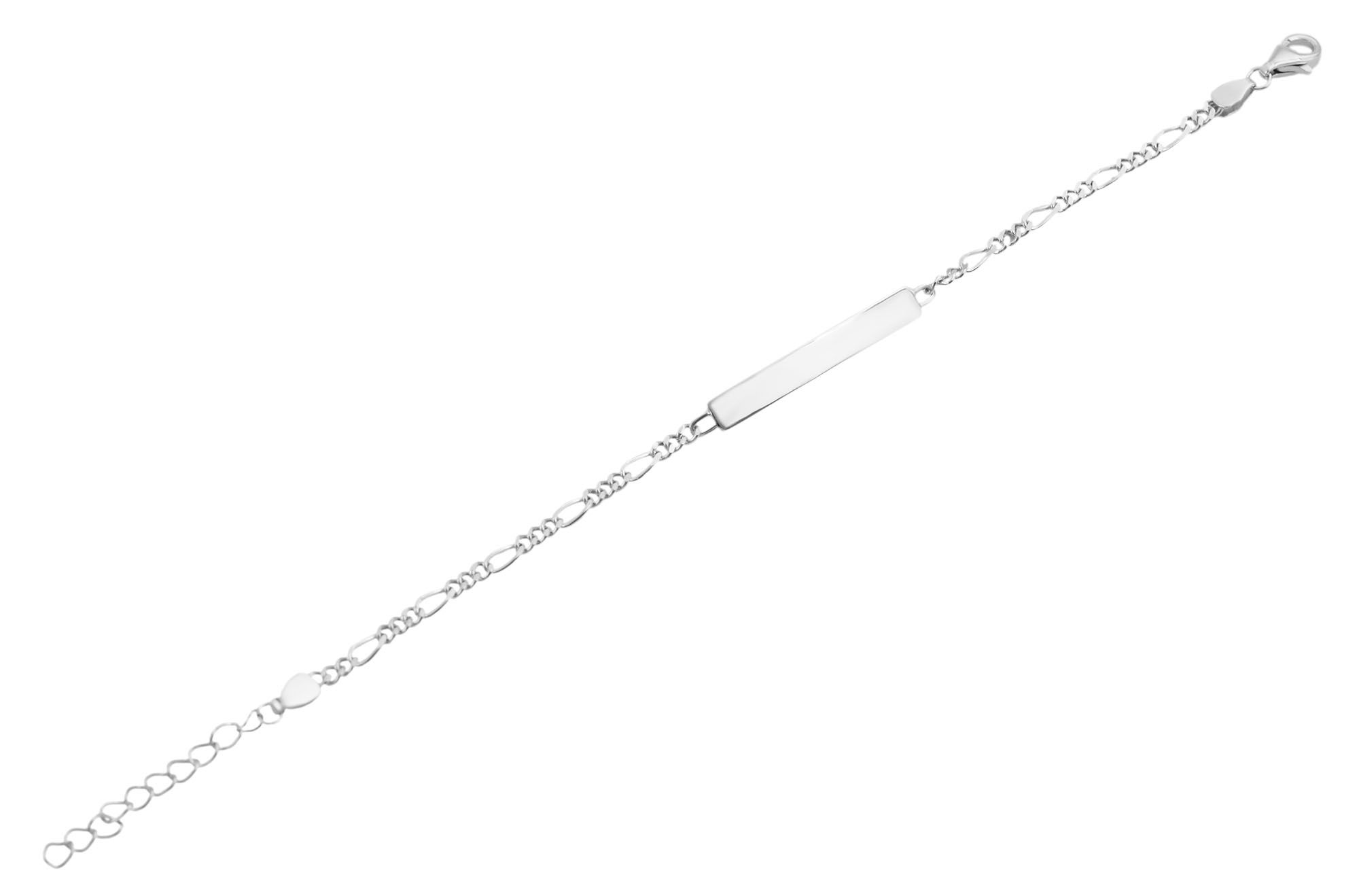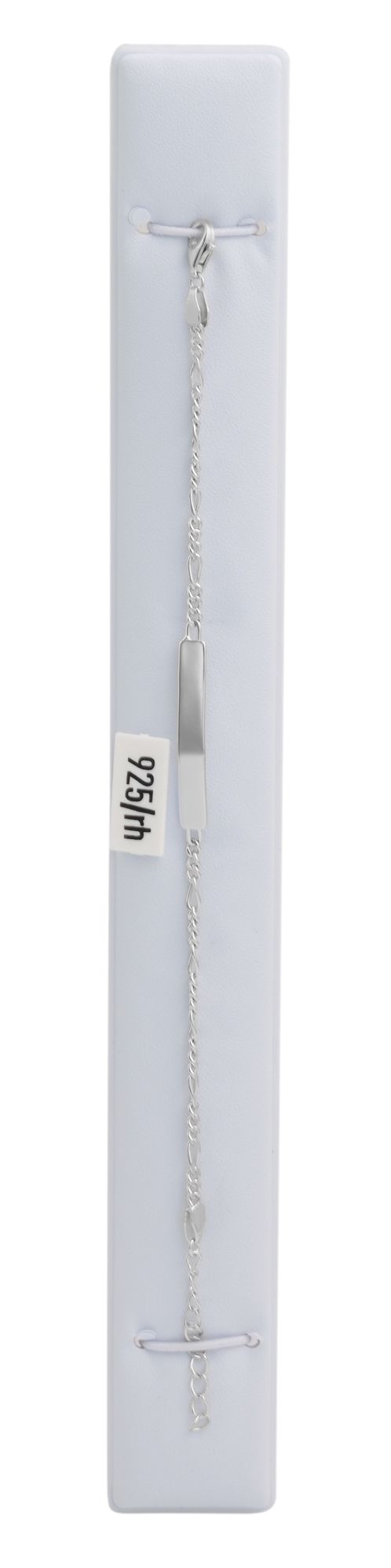 Das Armband im Figarokettenmuster mit integrierter Identplatte besteht aus 925/- Sterlingsilber und ist zusätzlich mit einer Rhodiumbeschichtung veredelt. Diese Beschichtung schützt das Material vor dem Anlaufen und sorgt zusätzlich für einen strahlenden Glanz. Das Identband ist für Gravuren aller Art geeignet, sodass man dem schlichten Band eine personalisierte Note verleihen kann. Das Band hat eine Länge von 17 cm und kann um 3 cm verlängert werden. Die Gravurplatte ist 22 mm lang, 4 mm breit und 1 mm dick.