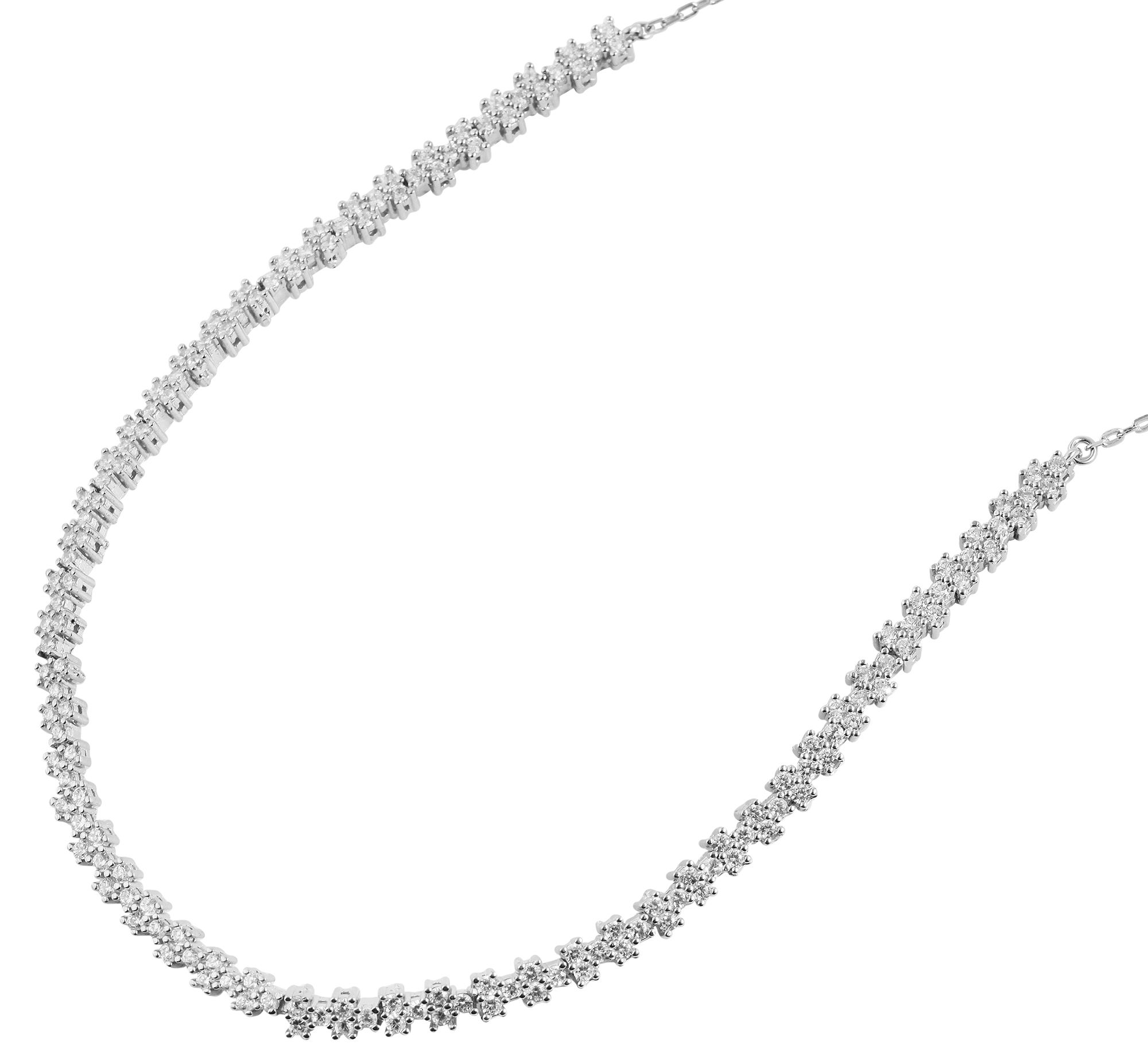 Die Kette wurde aus 925 Sterlingsilber hergestellt und ist zusätzlich rhodiniert. Diese hochwertige Beschichtung schützt das Schmuckstück vor dem Anlaufen und garantiert einen langanhaltenden Glanz. Durch ihrer Collierform betont die Kette das weibliche Dekolleté und bietet durch die 4 mm großen Zirkoniasteine einen besonders eleganten Blickfang. Die Kette ist 42 cm lang, 1 mm breit und 1 mm dick- An der Kette ist an einem Ende eine 3 cm lange Verlängerungskette angebracht, mit der die Länge individuell verlängert werden kann. Das Schmuckstück lassen sich mit einem Karabinerverschluss öffnen und schließen. Dieser ist ebenfalls aus 925er Sterlingsilber gefertigt.