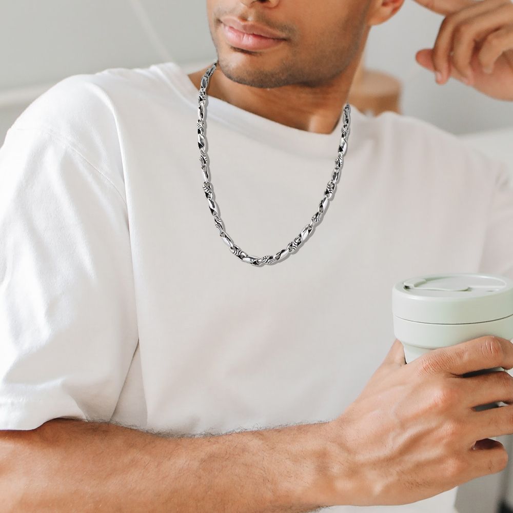 Diese 925er Echt Silber Herren-Kette vereint zeitlose Eleganz mit maskulinem Design. Das hochwertige Sterlingsilber sorgt für einen edlen Glanz, der jedes Outfit aufwertet. Mit einem sicheren Karabinerverschluss ausgestattet, lässt sich die Kette bequem anlegen und bietet gleichzeitig zuverlässigen Halt. Die robuste Kettengliederung verleiht ihr eine moderne, markante Optik, die sowohl zu lässigen als auch zu eleganten Looks passt. Ein stilvolles Accessoire für den modebewussten Mann, das durch Qualität und Langlebigkeit überzeugt.