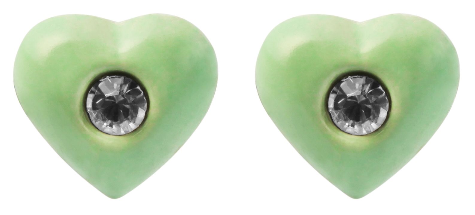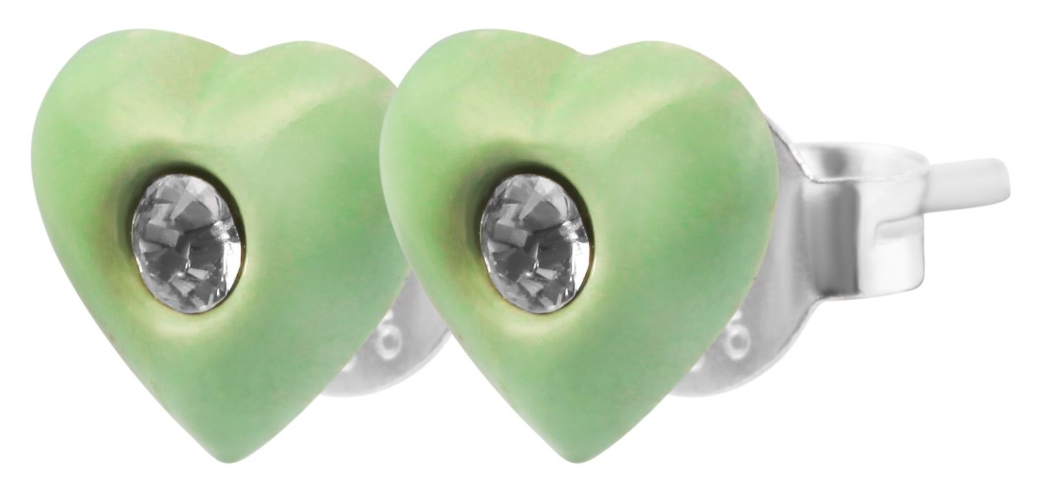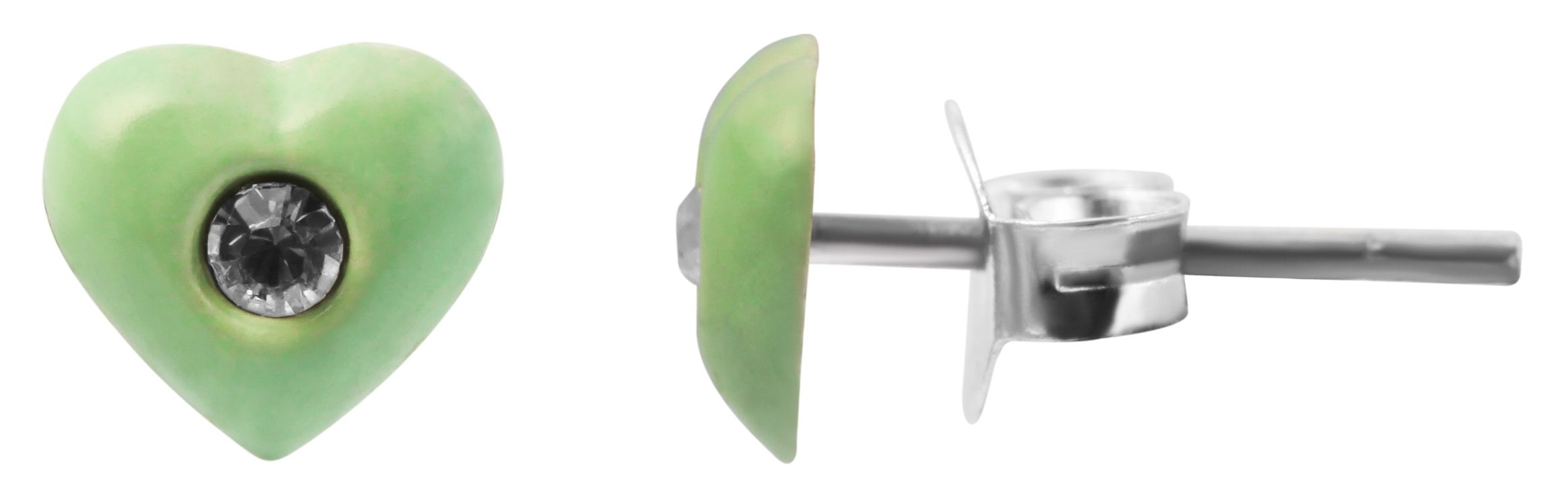 Die niedlichen Kinder-Ohrstecker in Form von kleinen Herzen sind aus 925er Sterlingsilber gefertigt und mit hellgrüner Epoxidfarbe überzogen worden. Gekonnt setzt sich mittig ein funkelnder Similistein in Szene, der das Design vollkommen macht. Die Ohrstecker lassen sich mit einer Flügelschraube aus echtem Silber schließen, diese verhindert ein Herausfallen und lässt sich leichthändig An-und Ablegen. Die Maße der Ohrringe ergeben sich aus einer Länge und Breite von 6 mm und einer Stärke von 2 mm. Klein aber fein kommt dieser mädchenhafte Ohrschmuck daher und wird dabei zum absoluten Blickfang.
