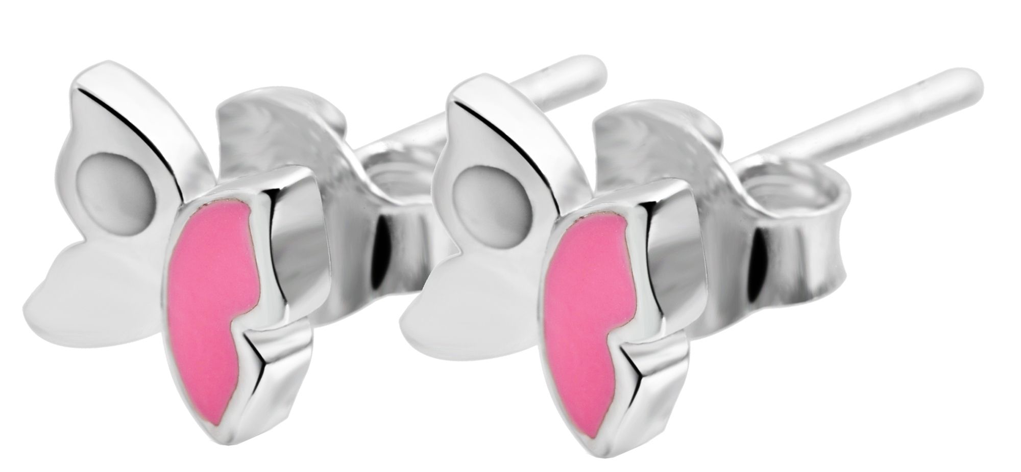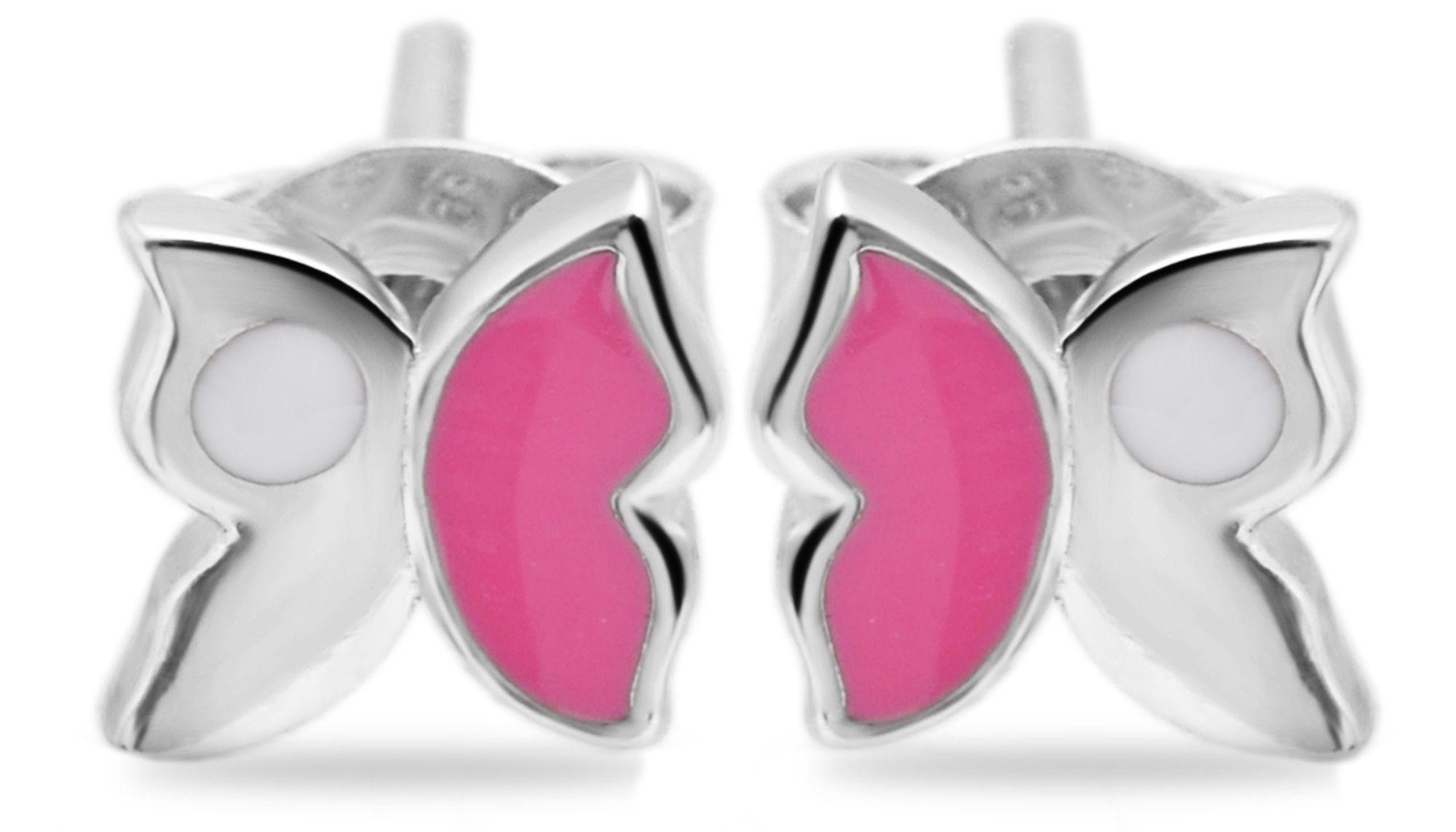 Die niedlichen Kinder-Ohrstecker in Form von Schmetterlingen aus 925er Sterlingsilber sind rhodiniert, somit anlaufgeschützt und mit strahlendem Glanz versehen. Die Flügel sind mit weißer und rosafarbene Emaille gefüllt und verpassen dem Ohrschmuck einen mädchenhaften Look, der Kinderaugen zum strahlen bringt. Mit einer praktischen Flügeslschraube, ebenfalls aus Echtsilber hergestellt, werden die Stecker am Ohrloch gesichert. Zudem lassen sich sich leichthändig An-und Ablegen. Die Maße des Artikels betragen: Länge 6 mm, Breite 6 mm und Stärke 1,5 mm.