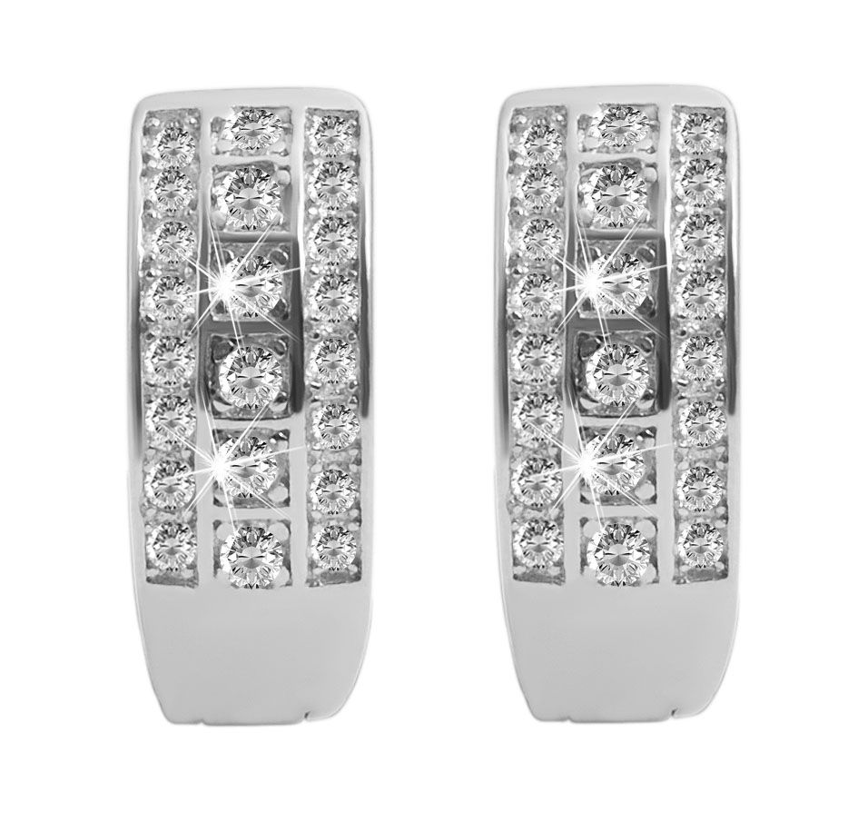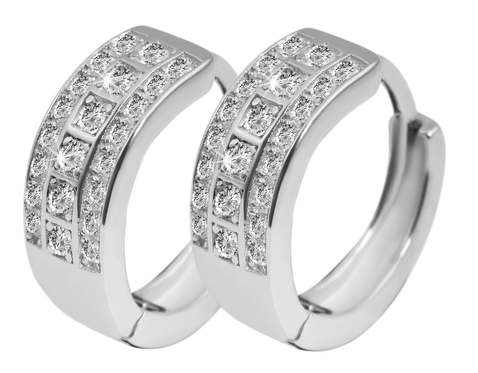 Die Klappcreolen wurden aus 925/- Sterlingsilber hergestellt und sind mit 22 weißen Zirkoniasteinen in dreireihiger Aufteilung auf der Vorderseite besetzt. Zudem wurden sie zusätzlich rhodiniert. Die hochwertige Beschichtung aus Rhodium schützt das Material vor dem Anlaufen und sorgt für lang anhaltenden Glanz der Schmuckstücke. Der Verschluss ist ein Klappverschluss, der ein leichthändiges An- und Ablegen garantiert und für sicheren Halt am Ohrloch sorgt. Die Größe ergibt sich aus einem Durchmesser von 10 mm, einer Breite von 5 mm und einer Stärke von 2 mm. Die Creolen sind zeitlos und lassen sich zu allen Anlässen tragen. Zudem eignen sie sich ideal zum Verschenken um einer ganz besonderen Person eine Freude zu machen.