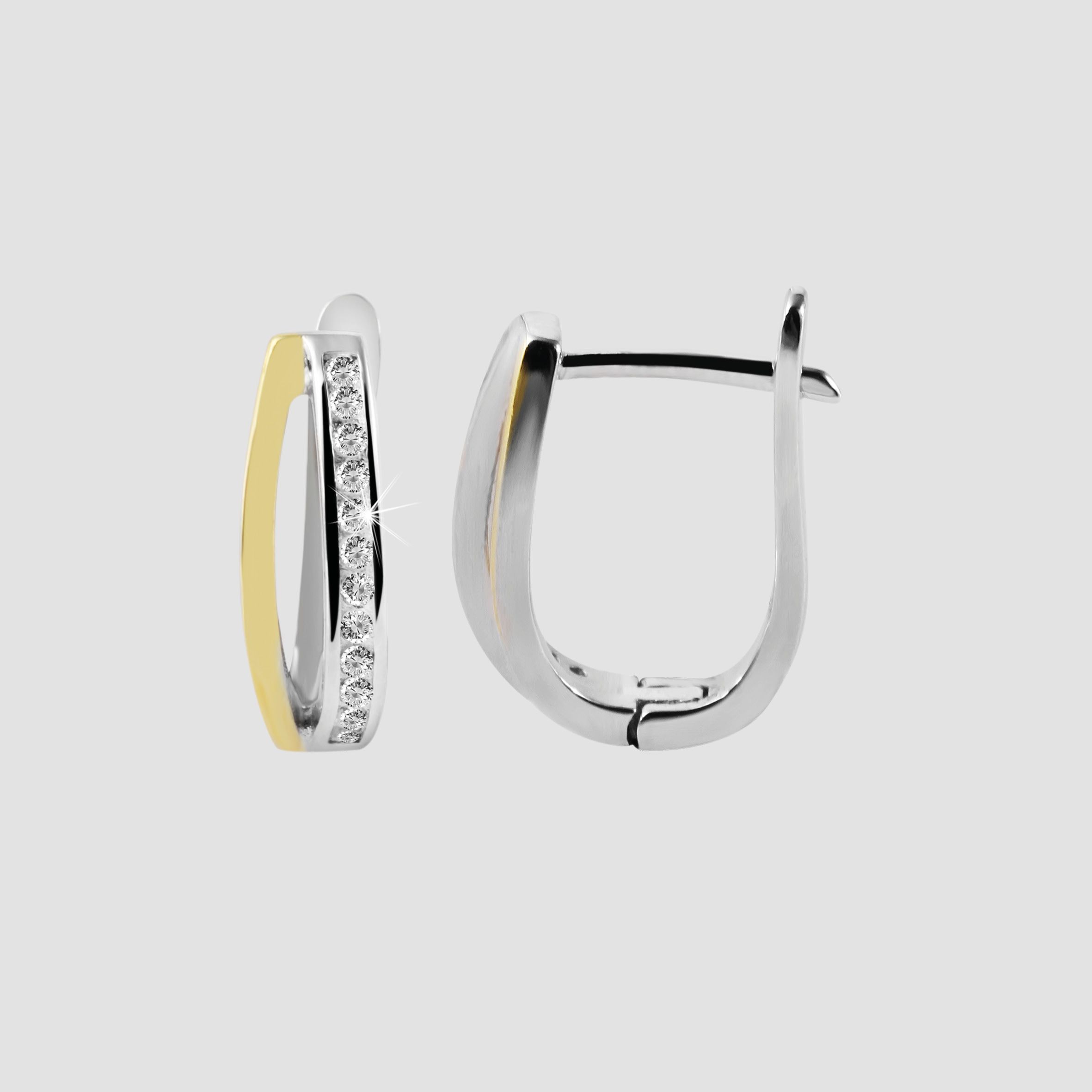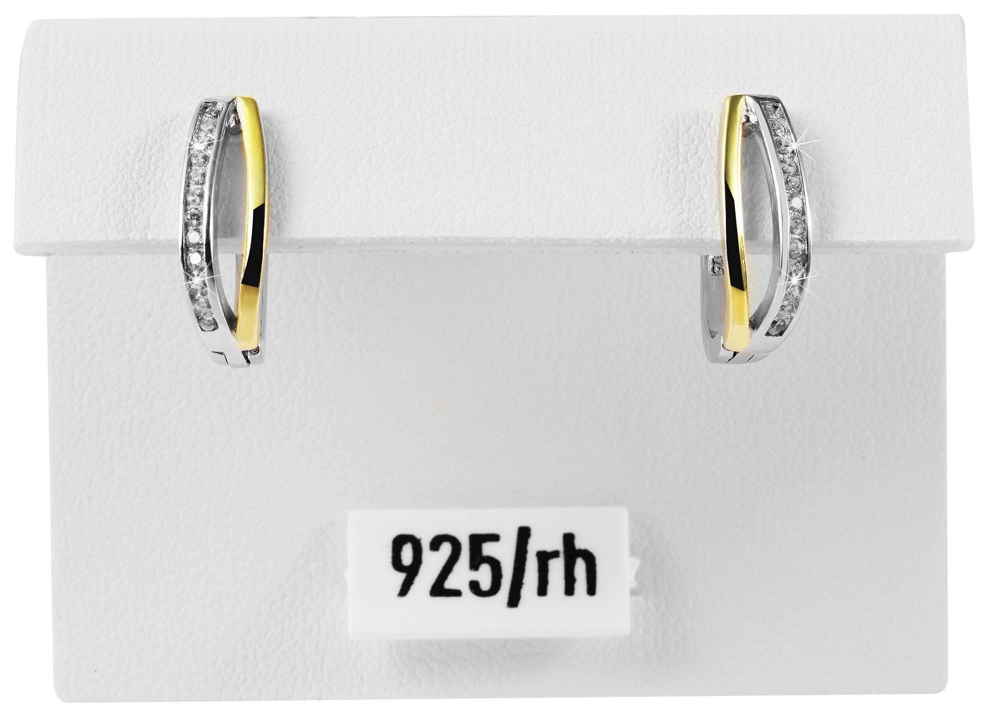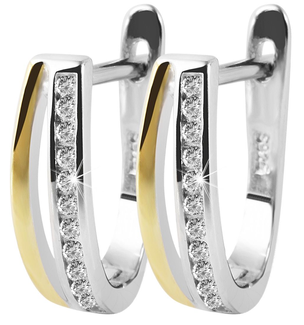 Die femininen Klappcreolen in U-Form wurden aus 925er Sterlingsilber hergestellt und zusätzlich rhodiniert. Die hochwertige Beschichtung aus Rhodium veredelt das Material, schützt es vor dem Anlaufen und sorgt zudem für lang anhaltenden und strahlenden Glanz. Die Creolen sind farblich aufgeteilt, eine Hälfte ist vergoldet, die andere zeigt sich in Silber, verziert mit jeweils zwölf funkelnden Zirkoniasteinen. Mittig werden die Ohrringe optisch durch eine dünne Ausfräsung unterbrochen. Der Verschluss ist ein praktischer Klappverschluss, der ein leichthändiges An-und Ablegen garantiert. Die Größe ergibt sich aus einer Länge von 14 mm, einer Breite von 4,5 mm und einer Stärke von 2 mm. Dieses Produkt wird auf einem weißen Schmuckkärtchen geliefert. Es hat eine Maße von 35 x 55 mm und eignet sich ideal zum Präsentieren in dem dazu geeigneten Display oder zum Verpacken als Geschenk.