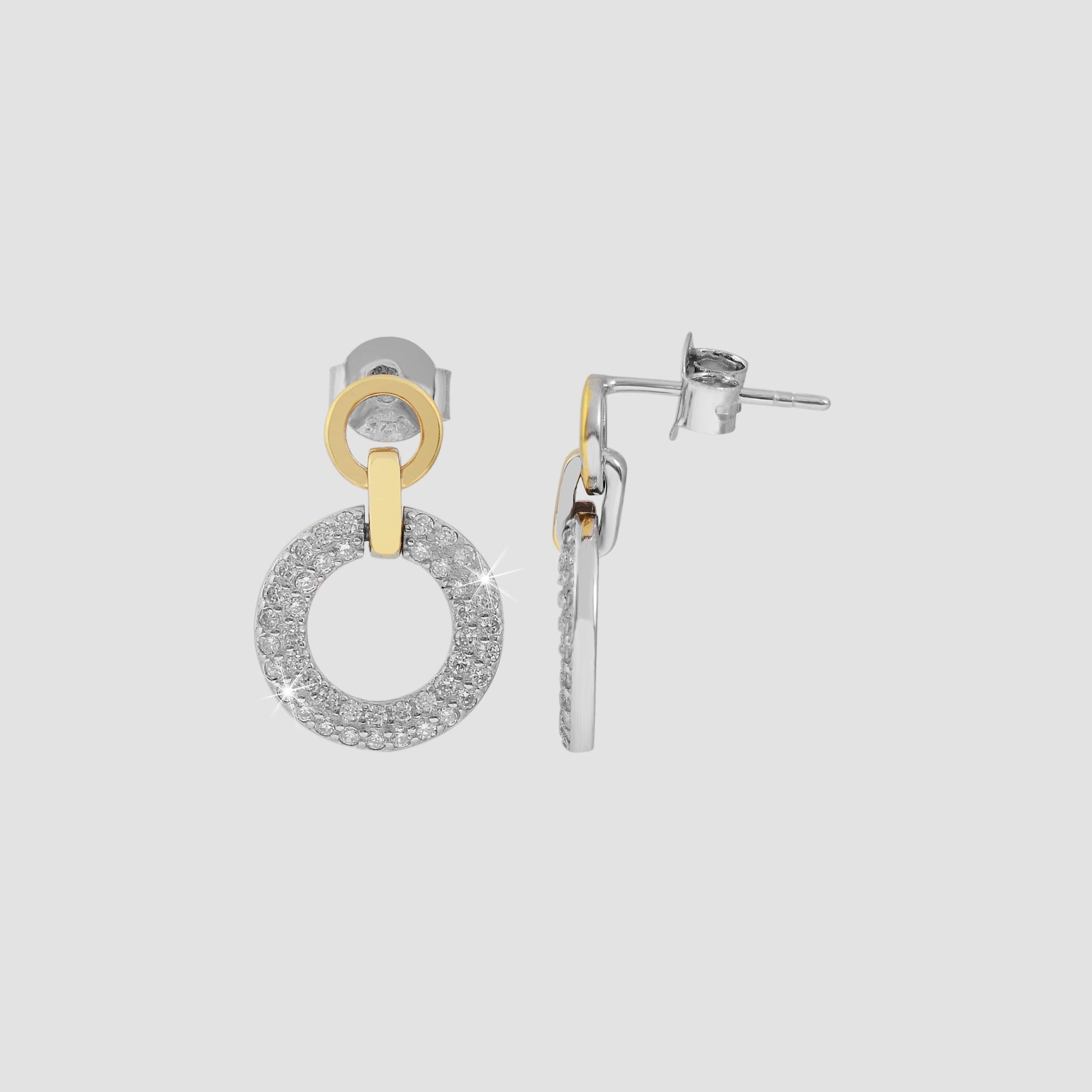 Die eleganten Damenohrstecker wurden aus 925/- Sterlingsilber hergestellt und sind zusätzlich rhodiniert. Diese hochwertige Beschichtung versiegelt das Material, schützt es vor dem Anlaufen und sorgt für einen strahlenden Glanz. Glamourös und elegant - so zeigen sich die hübschen Ohrstecker in bicolor. An einem 6 mm runden und offenen Stecker ist durch eine längliche Öse ein weiteres rundes Element angebracht. Dieses Element ist ebenfalls mittig offen und schwingt elegant bei jeder Bewegung mit. Des Weiteren wird es rundum von jeweils 52 Zirkoniasteinen in zweireihiger Platzierung geschmückt. Rundum sind die Ohrringe tolle Accessoires und mit viel Liebe zum Detail gefertigt. Verschlossen werden die Ohrstecker mit einer praktischen Flügelschraube, die ein bequemes und leichthändiges An- und Ablegen garantiert und für einen sicheren Halt sorgt. Die Größe der Ohrringe ergibt sich aus einer Länge von 18 mm, einer Breite von 12 mm und einer Stärke von 1,5 mm.