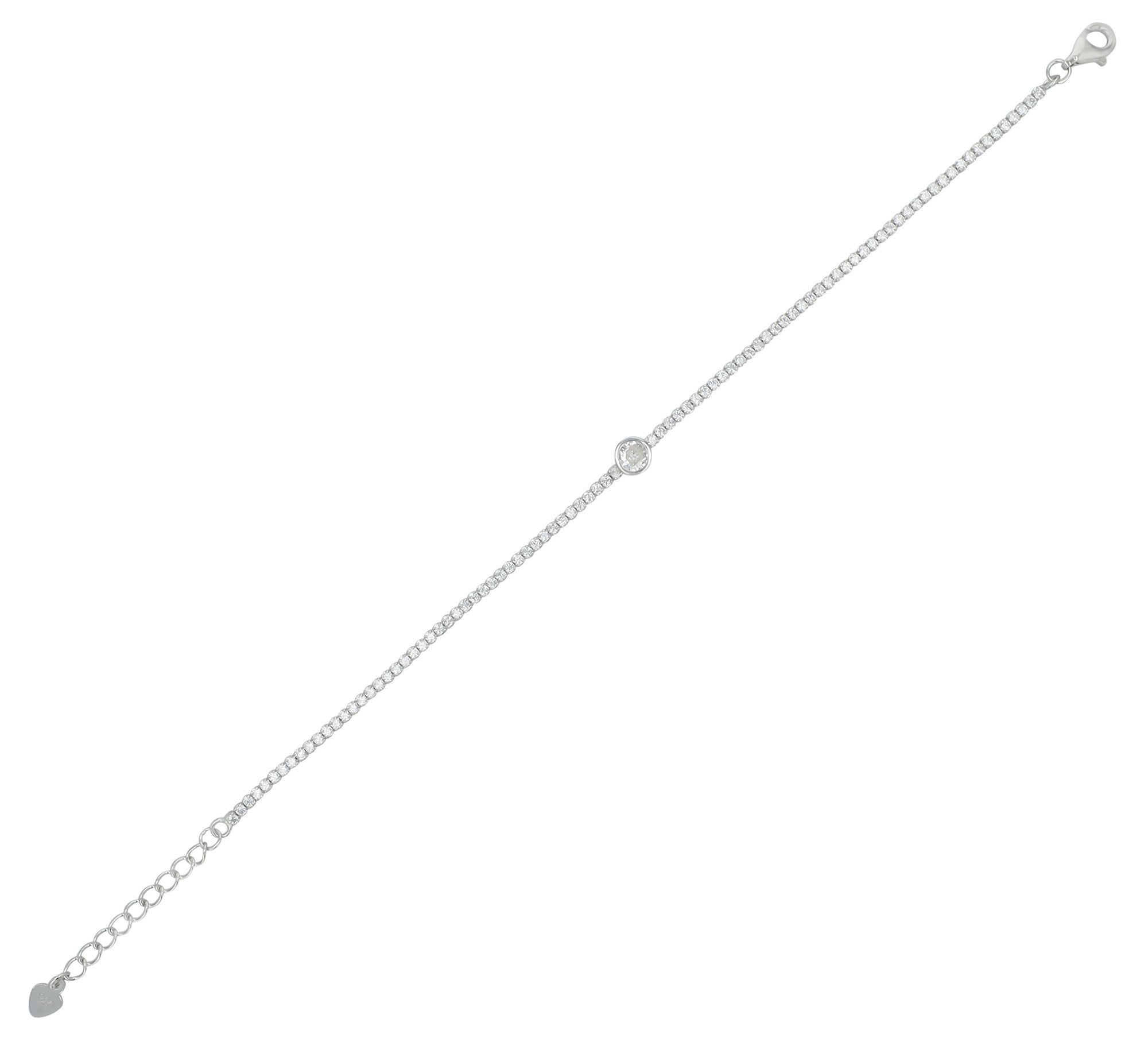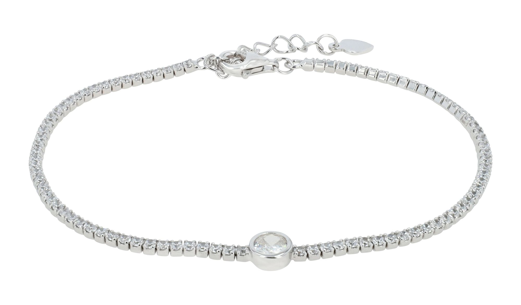 Dieses Armband, aus hochwertigem 925er Sterlingsilber gefertigt und rhodiniert, kombiniert schimmernde Eleganz mit einem hochwertigem Material. Es besteht aus aneinandergereihten Zirkoniasteinen präzise in Fassungen eingearbeitet. Als Blickfang dient ein weiterer Zirkoniastein mit einem Durchmesser von 4,5 mm. Ein Karabinerverschluss sorgt dafür, dass es zuverlässig am Handgelenk bleibt. Mit einer Länge von 17 cm, die durch ein zusätzliches 3 cm langes Verlängerungselement ergänzt wird, passt dieses Armband bequem um die meisten Handgelenke.