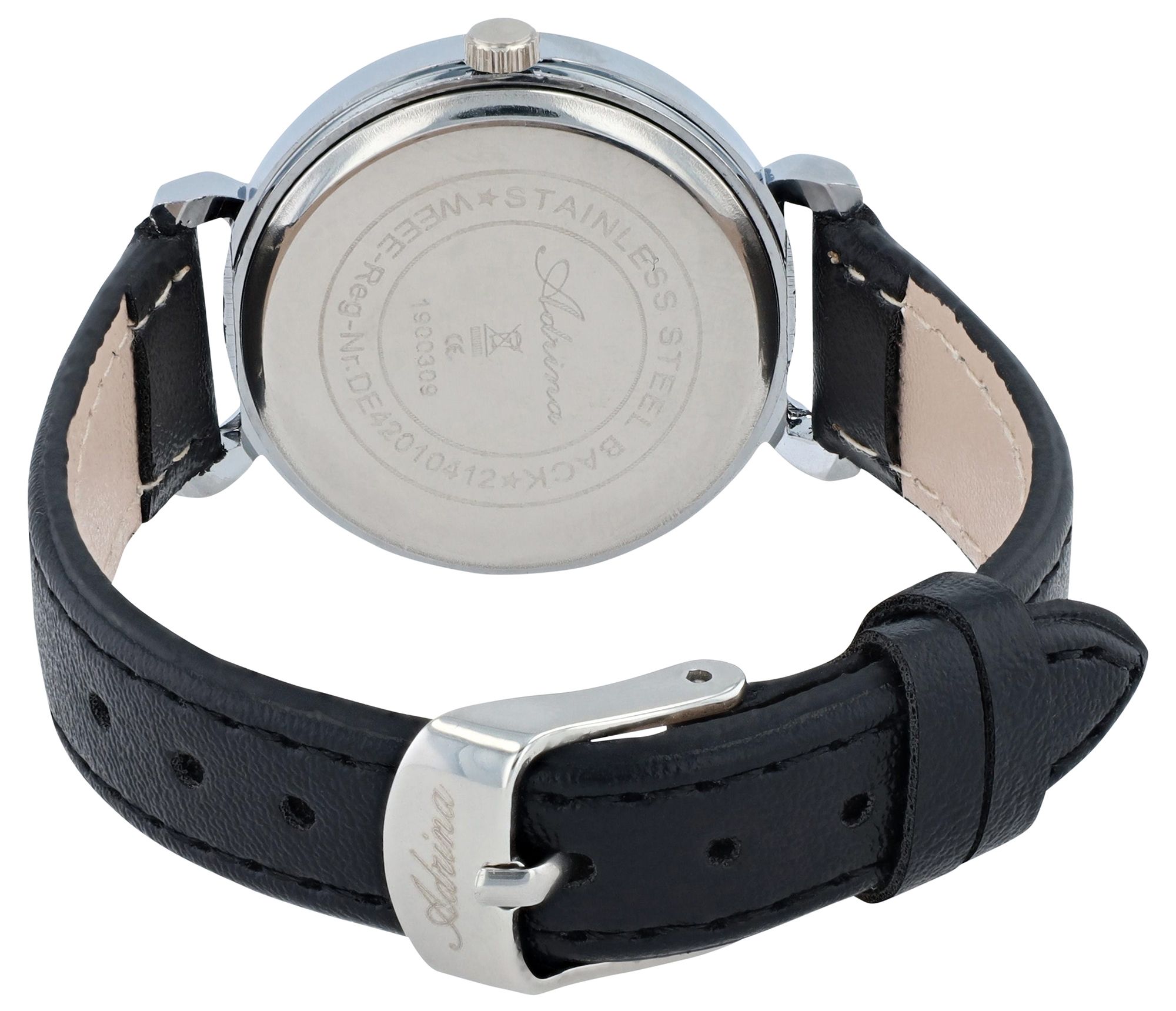 Produktinformationen "Adrina Damenuhr, Lederimitationsband, Ø 32,5 mm, schwarz/silberfarben"