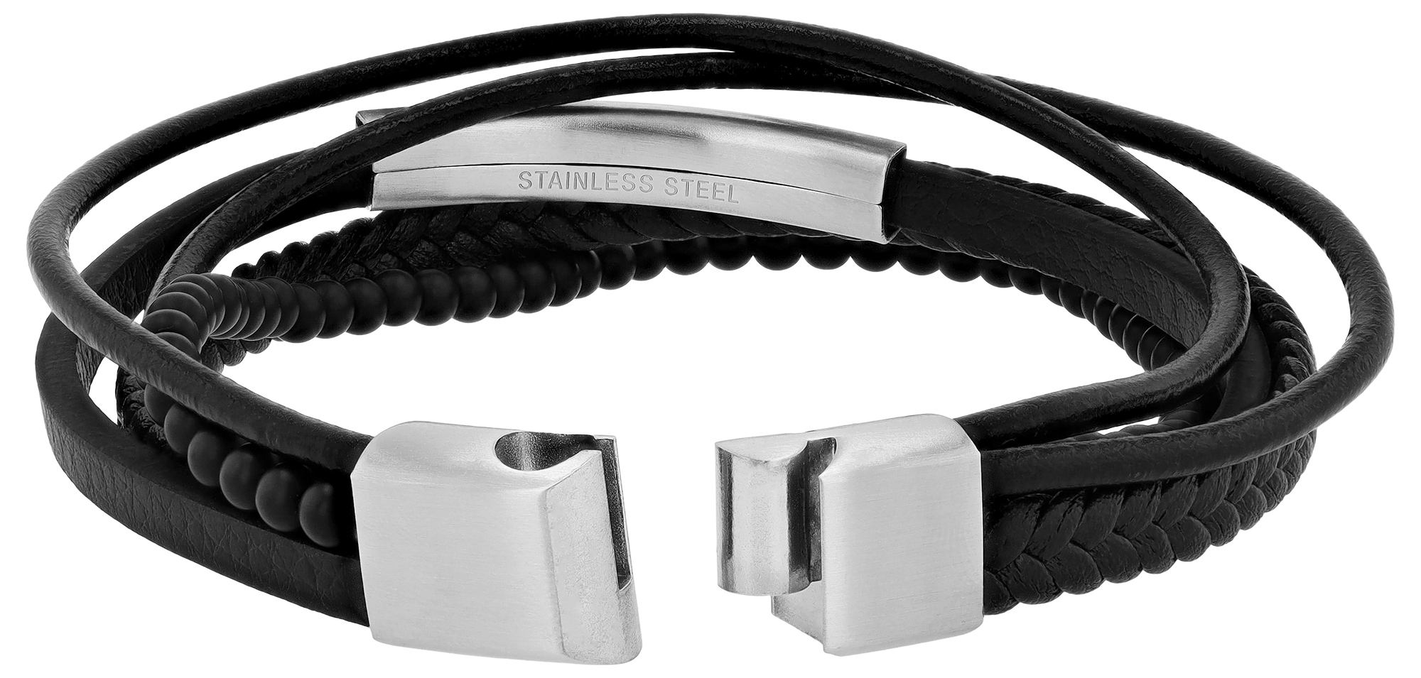 Dieses schwarze Armband der Marke Akzent ist ein echtes Statement-Piece für den modernen Mann. Durch die geschickte Kombination aus hochwertiger Lederimitation, robustem Edelstahl und matten Onyxperlen entsteht ein einzigartiger Lagen-Look, der sowohl lässig als auch elegant wirkt.
