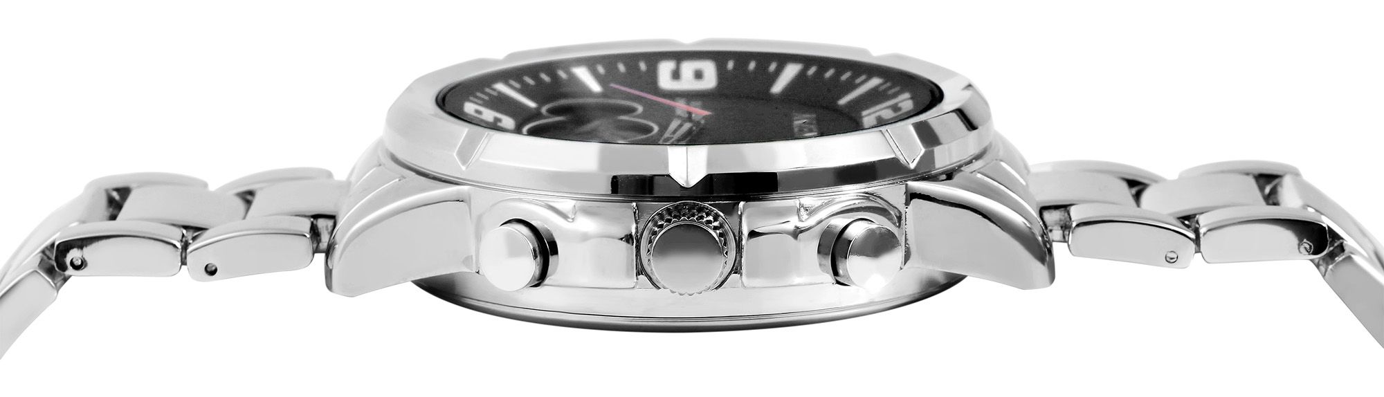 Die analog-digitale Herrenarmbanduhr der Marke Akzent verfügt über ein hochwertiges 3-Zeiger Quarzuhrwerk und über ein hochwertiges Digitaluhrwerk. Das silberfarben Edelstahlarmband ist am Anstoß 24 mm breit und lässt sich mit einer Edelstahlfaltschließe öffnen und schließen. Aufgrund der herausnehmbaren Elemente lässt sich das Armband beliebig jedem Handgelenkumfang anpassen. Die Gesamtlänge der Uhr beträgt 22 cm. Das silberfarbene Metallgehäuse mit Mineralglas hat eine Abmessung von 48 mm im Durchmesser und einer Gehäusehöhe von 15 mm. Der Gehäuseboden ist aus Edelstahl gefertigt und die Uhr hat eine Wasserdichtigkeit von 3 bar. Einstellen lässt sich die analoge Uhrzeit über eine Krone, die digitale Uhrzeit über die vier Drücker, die auf zwei, vier, acht und zehn Uhr platziert sind. Über die Drücker lassen sich auch noch alle weiteren Funktionen wie die Stoppfunktion, die Alarmfunktion und die Beleuchtung des Displays bedienen. Das schwarze Zifferblatt ist ausgestattet mit einem Digitalfeld, bei dem sich die Ansicht je nach eingestelltem Modus ändert. Zusätzlich verfügt die Uhr über eine Datums- und Wochentagsanzeige. Die analog-digitale Herrenarmbanduhr ist ein sportlicher und zuverlässiger Begleiter, der dank der vielen Funktionen vielseitig nutzbar und zudem noch ein absoluter Blickfang an Ihrem Handgelenk ist.