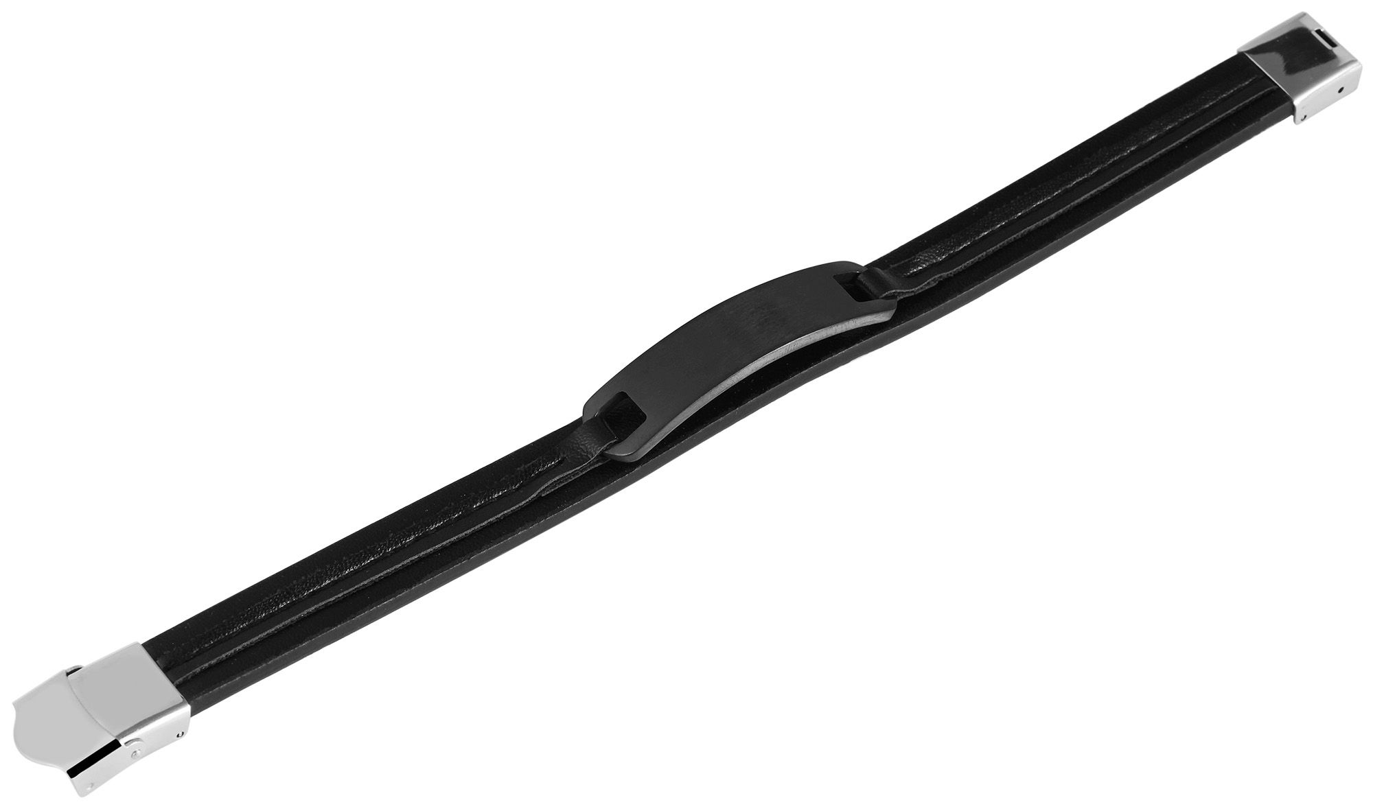 Das schwarze Armband der Marke Akzent wurde aus Echtleder gefertigt und ist zusätzlich mit einem schwarzen Edelstahlelement versehen. Der Verschluss ist ein Hakenverschluss, der ebenfalls aus Edelstahl gefertigt ist. Die Oberfläche der Edelstahlelemente ist mattiert. Das Armband besteht aus einem Lederriemen, auf den ein weiterer dünnerer Riemen mit einer Naht befestigt ist. Dieser Riemen hält mittig eine Gravurplatte mit einer Länge von 47 mm, einer Breite von 12 mm und einer Stärke von 3 mm. Die Maße des Lederarmbandes ergeben sich aus einer Gesamtlänge von 20,5 cm, einer Breite von 12 mm und einer Stärke von 5 mm.