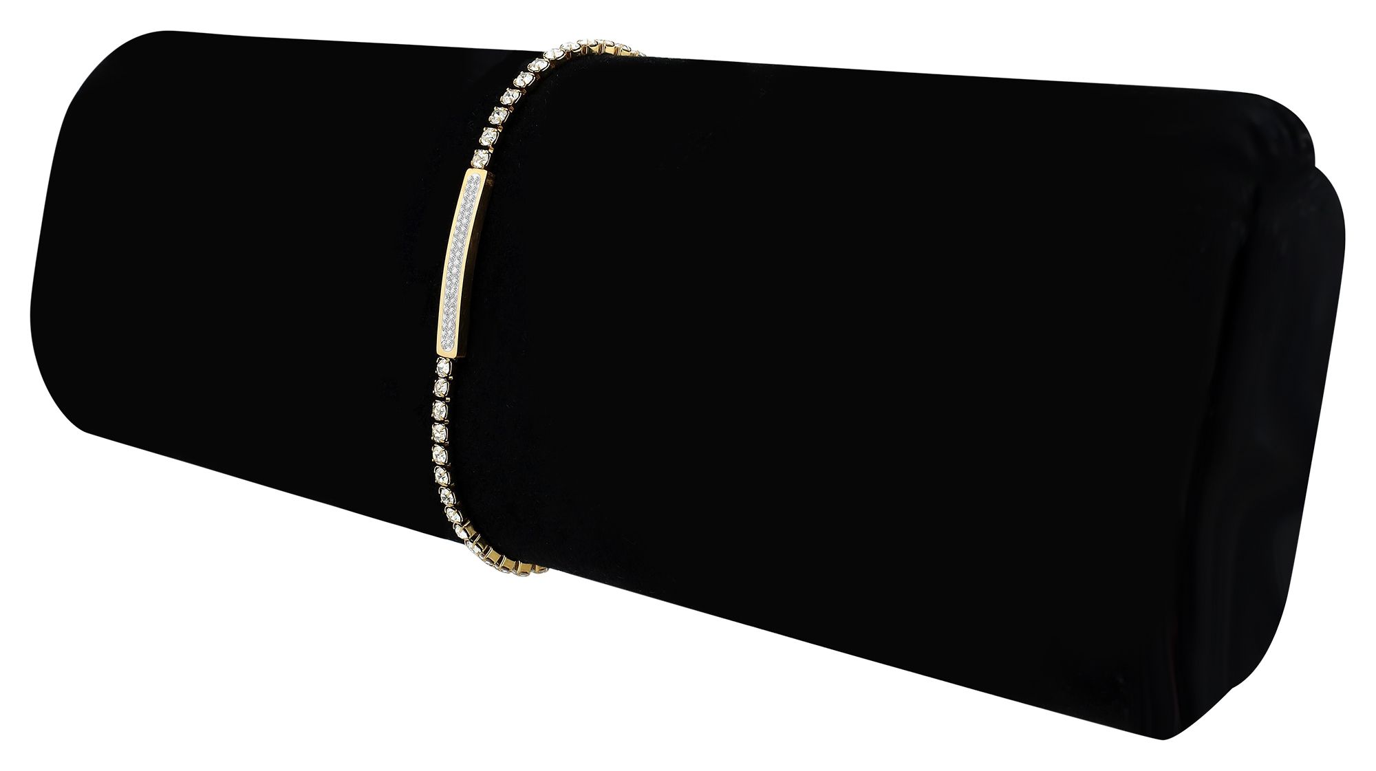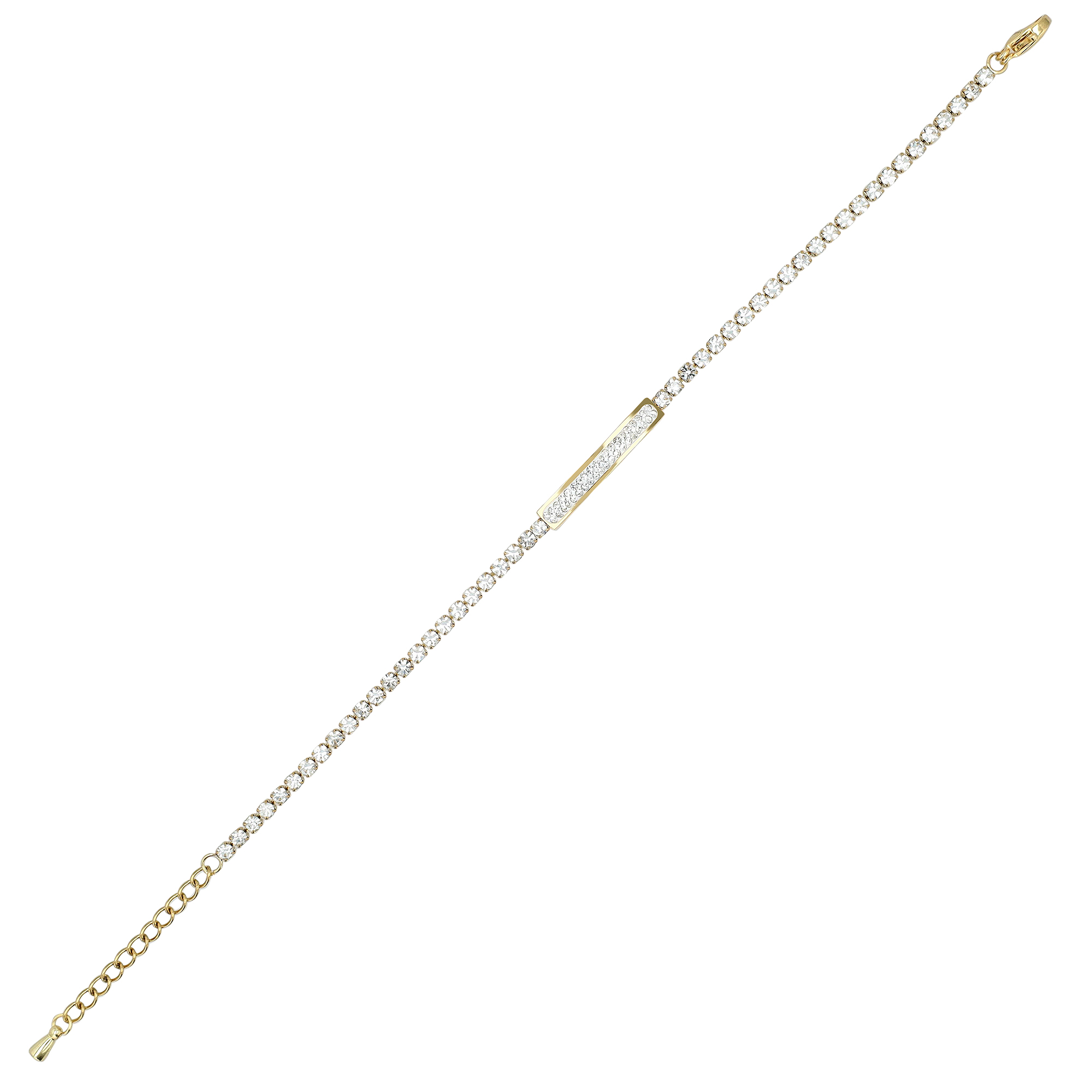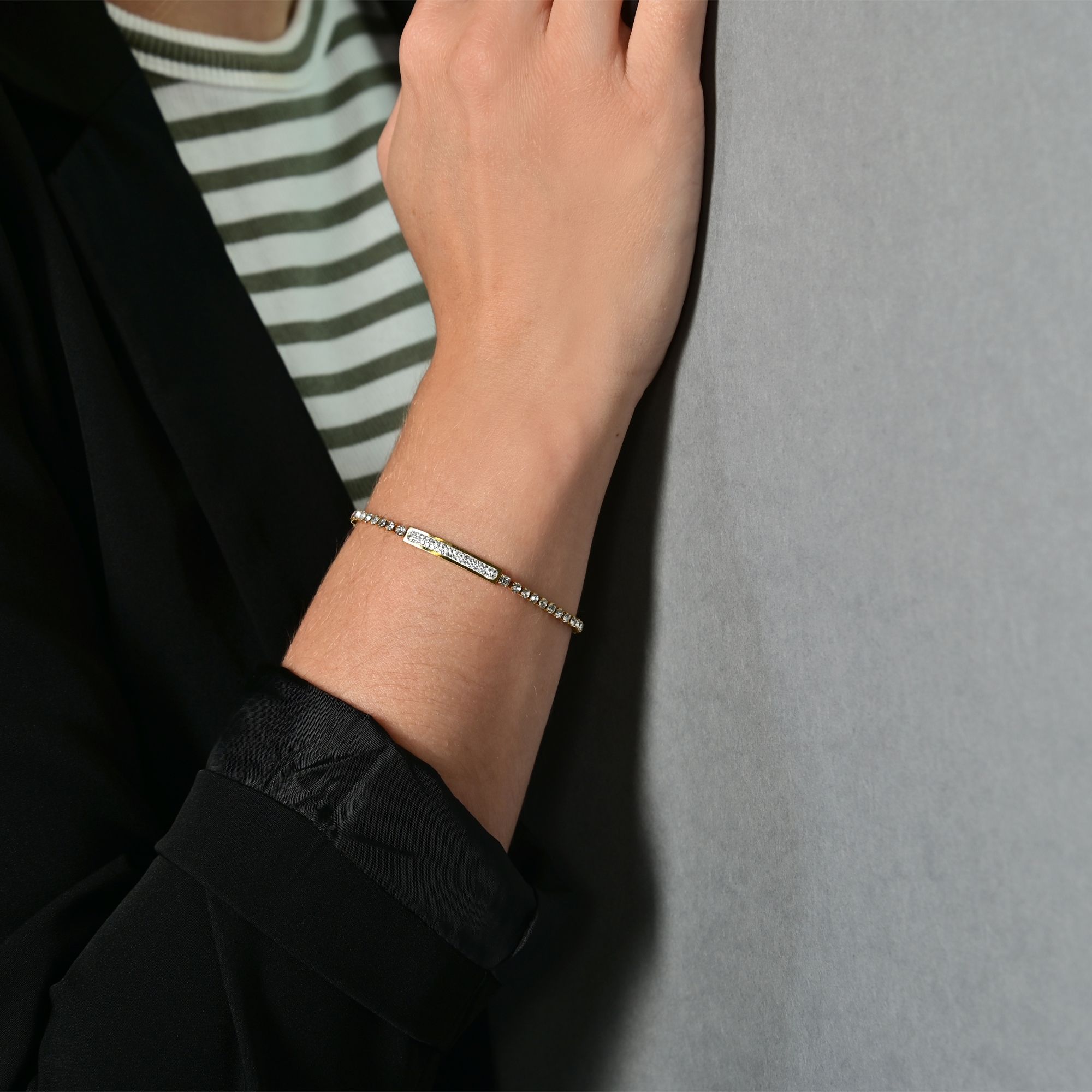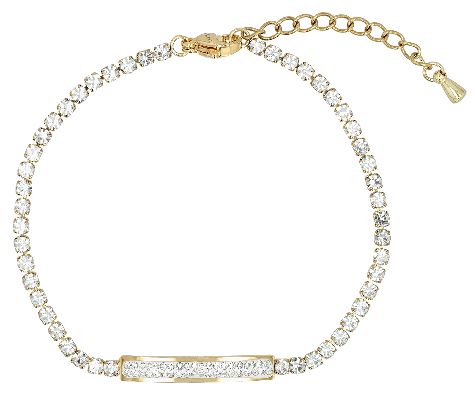Die goldfarbene Oberfläche wird durch ein hochwertiges Ion-Plating-Verfahren geschützt, was für eine langlebige Farbintensität und besonderen Glanz sorgt. Das Armband ist mit zahlreichen klaren Similisteinen besetzt, die für ein luxuriöses Strahlen am Handgelenk sorgen. Das filigrane Design wird durch ein längliches, ebenfalls mit Steinen besetztes Mittelstück harmonisch abgerundet.