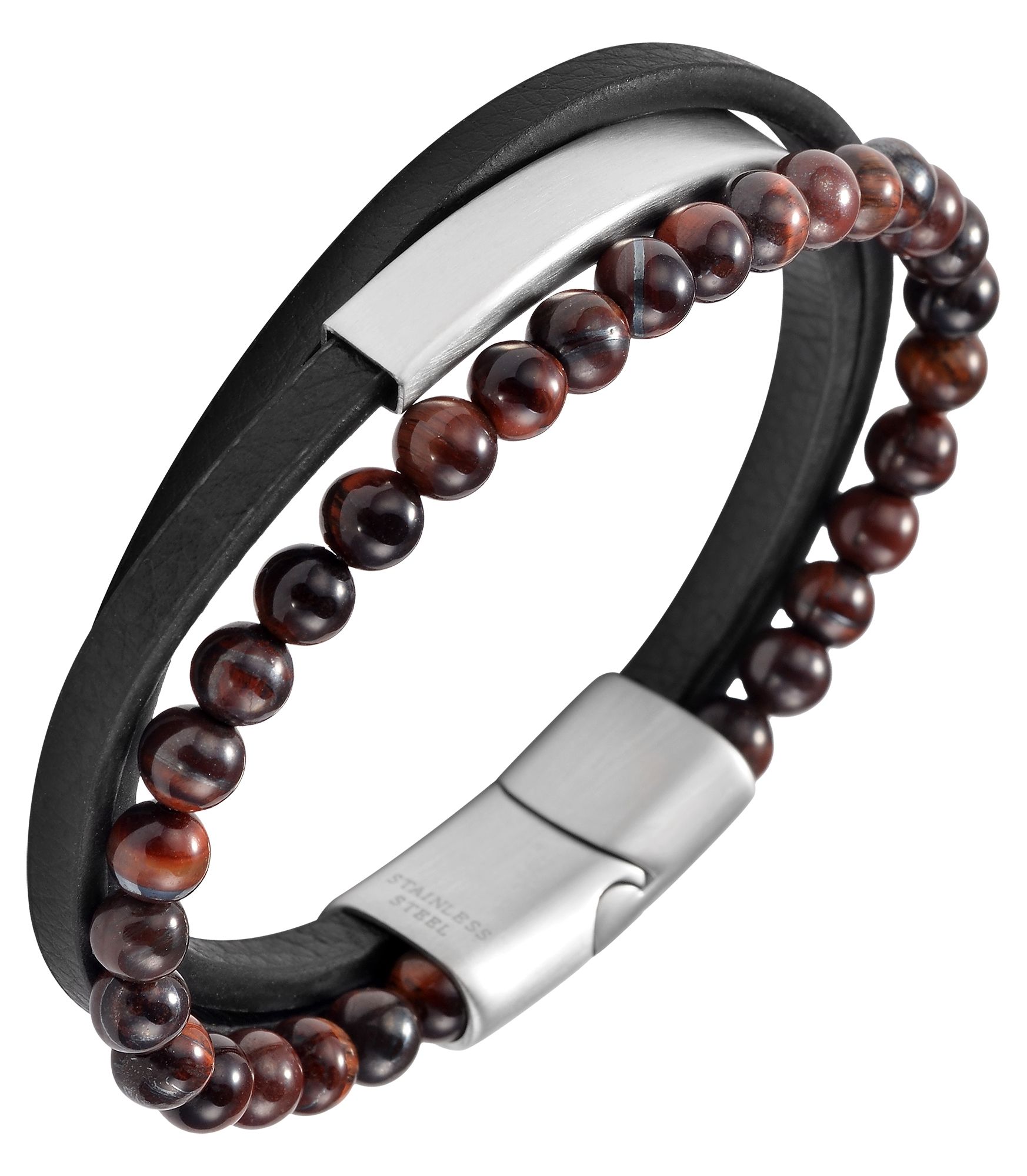Das schwarze Armband der Marke Akzent wurde aus Lederimitation und Natursteinkugeln gefertigt und hat eine Länge von 19 cm. Das dreireihige Armband besteht aus einem Perlenstrang aus Tigerauge und zwei Kunstlederriemen. Aufgrund der natürlichen Beschaffenheit des Mineral Quarz ist jede Perle ein Unikat und weist daher unterschiedliche Farbeffekte auf. Ein Riemen ist mit einer 41 x 7 mm großen, mattierten Identplatte ausgestattet, welche sich ideal für Gravuren eignet. Mit einem praktischen und massiven Magnetverschluss lässt sich das Armband leichthändig öffnen und schließen und lässt sich zudem ebenfalls mit kleinen Gravuren gestalten. Die Kombination aus unterschiedlichen Materialien lassen dieses Accessoire besonders wirken und es macht sowohl an weiblichen, als auch an männlichen Handgelenken eine gute Figur. Mit diesem Armband erhalten Sie das perfekte Accessoire, um Ihren Liebsten ein originelles Schmuckstück zu schenken oder um sich selbst eine Freude zu bereiten.