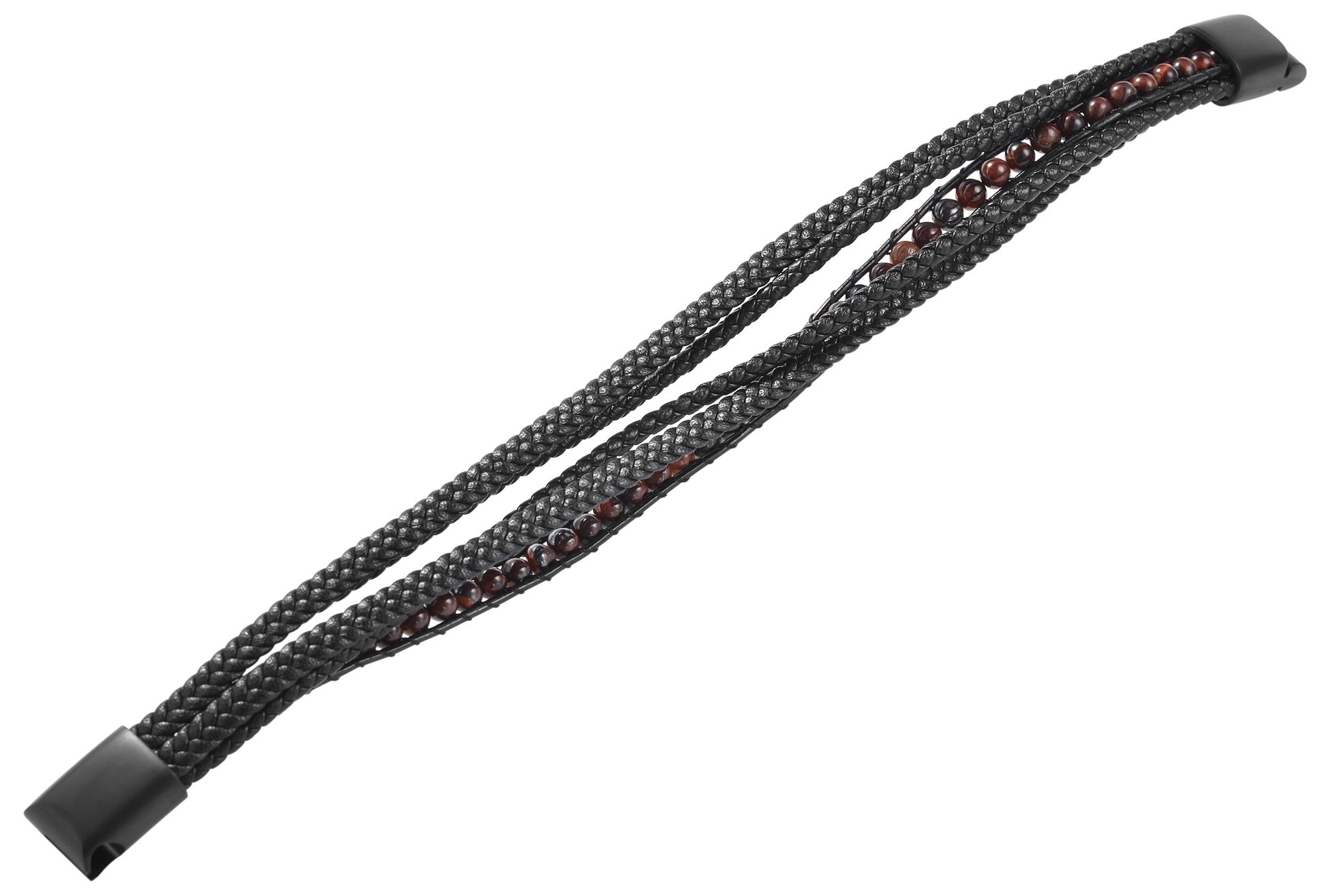 Das schwarze Armband der Marke Akzent wurde aus Lederimitation und Natursteinkugeln gefertigt und hat eine Länge von 19 cm. Das fünfreihige Schmuckarmband besteht aus zwei geflochtenen Kunstlederriemen- und Kordeln und einem Perlenstrang aus braunem Tigerauge. Aufgrund der natürlichen Beschaffenheit des Mineral Quarz ist jede Perle ein Unikat und weist daher unterschiedliche Farbeffekte auf. Mit einem praktischen und massiven Magnetverschluss lässt es sich leichthändig öffnen und schließen und zudem mit kleinen Gravuren individuell gestalten. Die mattierte Schließe ist aus Edelstahl gefertigt und mit einer hochwertigen Ionenplattierung veredelt. Mit diesem Produkt erhalten Sie das perfekte Accessoire, um Ihren Liebsten ein originelles Schmuckstück zu schenken oder um sich selbst eine Freude zu bereiten.