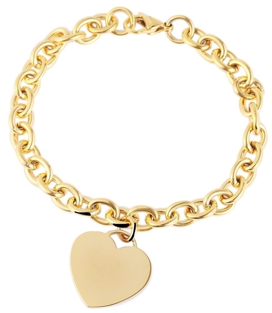 Das goldfarbene Bettelarmband der Marke Akzent ist aus Edelstahl im groben Ankermuster gefertigt. Die einzelnen Ösen, die das Ankermuster ergeben, haben eine Breite von 8 mm. Die Gesamtlänge des Armbandes beträgt 22 cm. An das Armband ist mittig ein 25 mm x 25 mm großes Edelstahlherz angebracht, dessen Oberfläche hochglanzpoliert ist. Das Herz kann beidseitig mit Gravuren aller Art versehen werden. Das Bettelarmband trägt seinen Namen, weil beliebig Charms hinzugefügt oder entfernt werden können. Öffnen und schließen lässt sich das besondere Schmuckstück mit einem Karabinerhaken, der ebenfalls aus Edelstahl gefertigt ist. Durch das robuste Material und die hochwertige Verarbeitung verspricht das Schmuckstück eine lange Lebensdauer. Zudem eignet es sich hervorragend als Geschenk.