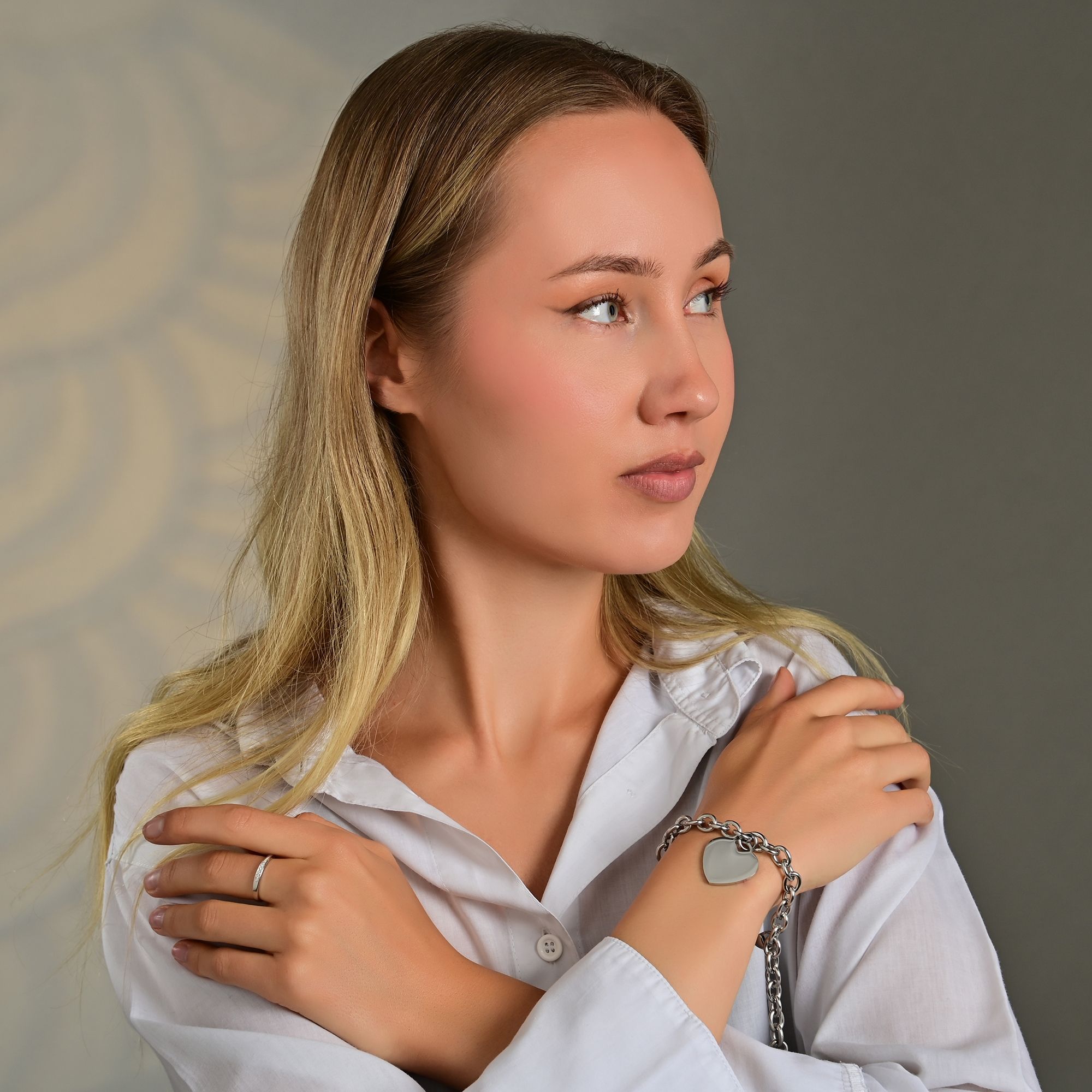 Das silberfarbene Bettelarmband der Marke Akzent ist aus Edelstahl im groben Ankermuster gefertigt. Die einzelnen Ösen, die das Ankermuster ergeben, haben eine Breite von 8 mm. Die Gesamtlänge des Armbandes beträgt 22 cm. An das Armband ist mittig ein 25 mm x 25 mm großes Edelstahlherz angebracht, dessen Oberfläche hochglanzpoliert ist. Das Herz kann beidseitig mit Gravuren aller Art versehen werden. Das Bettelarmband trägt seinen Namen, weil beliebig Charms hinzugefügt oder entfernt werden können. Öffnen und schließen lässt sich das besondere Schmuckstück mit einem Karabinerhaken, der ebenfalls aus Edelstahl gefertigt ist. Durch das robuste Material und die hochwertige Verarbeitung verspricht das Schmuckstück eine lange Lebensdauer. Zudem eignet es sich hervorragend als Geschenk.