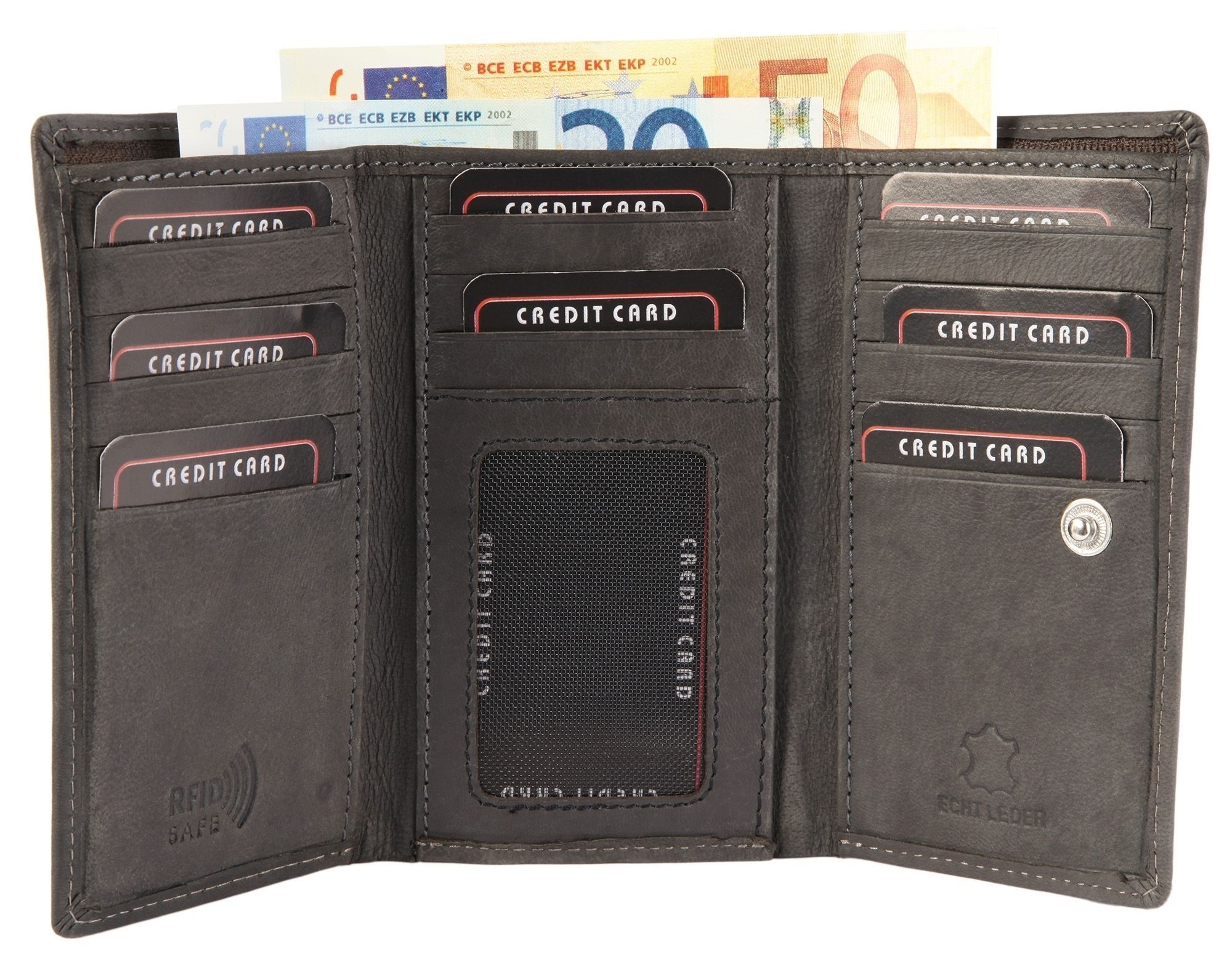 Die Damengeldbörse der Marke Akzent wurde im Querformat aus echtem Leder gefertigt und zeigt sich mit schlichten Blumenprint. Die Naht im Außen- und Innenbereich des Portemonnaies sorgt für eine gute Haltbarkeit und Stabilität. Die graue Geldbörse ist nicht nur optisch ein Hingucker, sonder auch ein wahres Platzwunder und bietet viel Stauraum für alle wichtigen Dokumente. Aufgeteilt ist die Börse in 14 Kreditkartenfächer, ein Ausweisfach, ein Geldscheinfach mit Reißverschluss, ein normales ohne Reißverschluss, ein Münzfach mit Einkaufschip und 3 Einsteckfächer. Verschlossen wird die Geldbörse mit einem praktischen Druckknopfverschluss im Außenbereich und einem Bügelverschluss am Kleingeldfach. Dank des integrierten RFID-Schutzes sind jegliche Chip-Karten vor Betrugsangriffen geschützt. Die Größe ergibt sich ungefüllt aus einer Länge von 9 cm, einer Breite von 14,5 cm und einer Höhe von 2,5 cm.