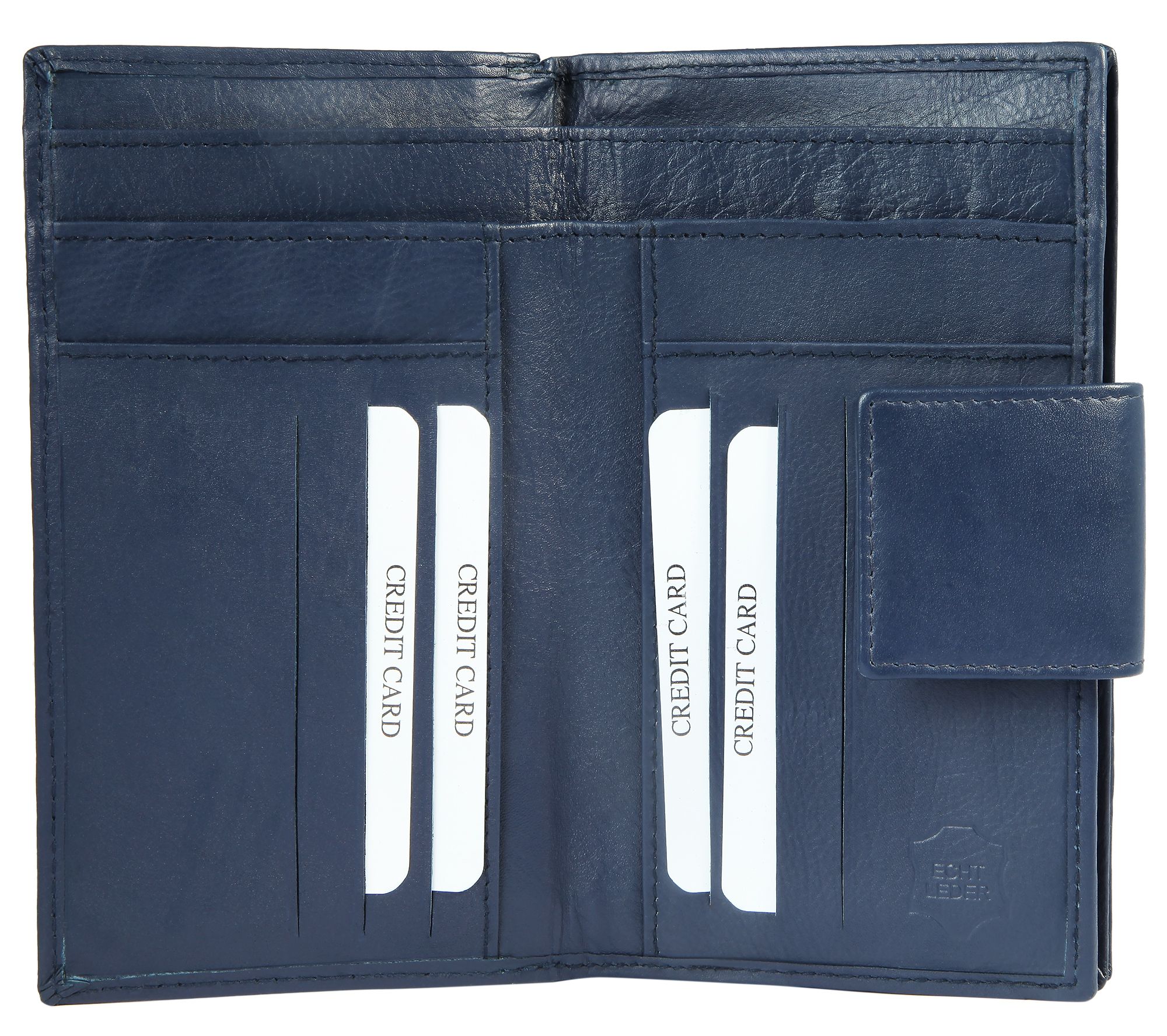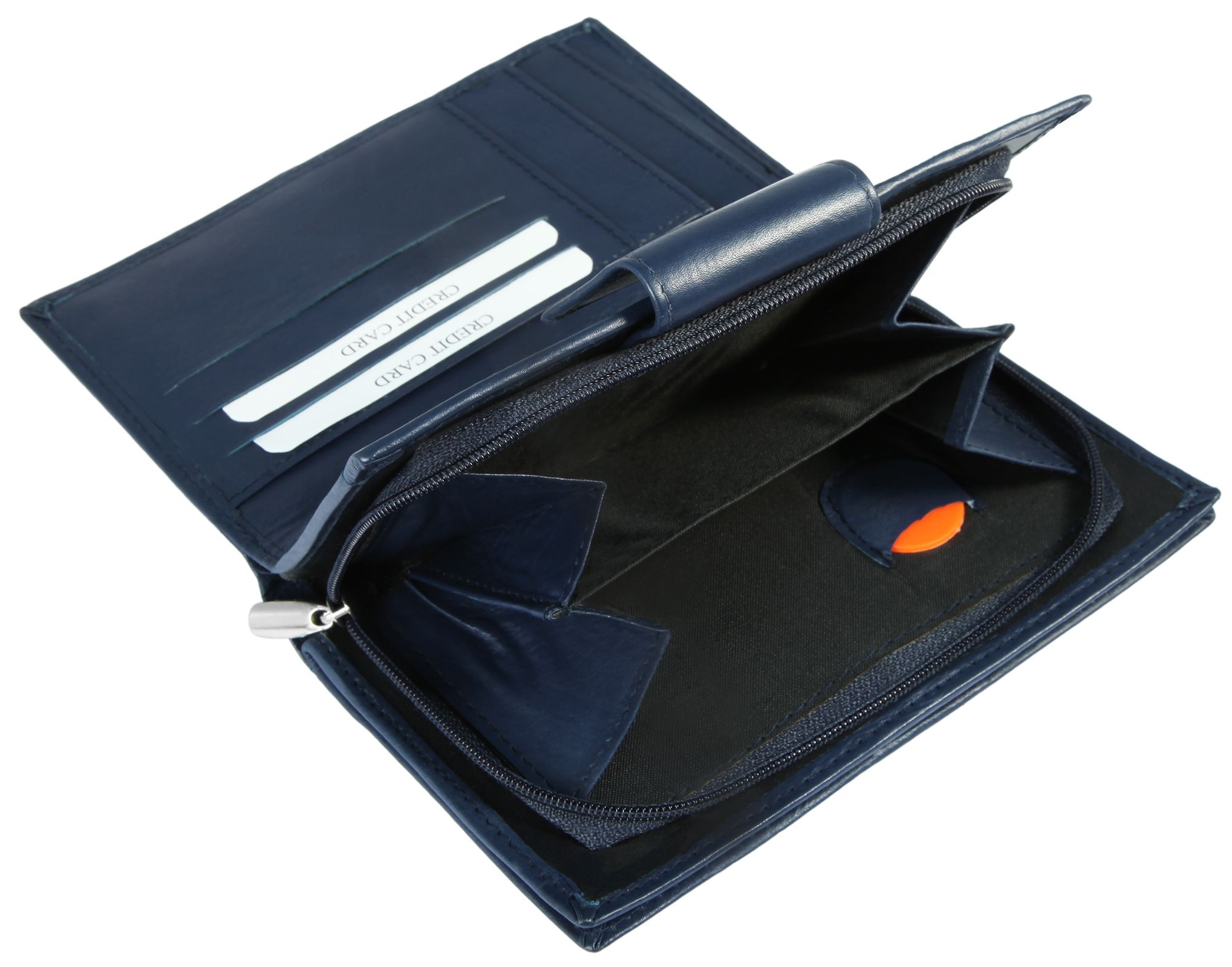 Akzent Damen Geldbörse aus Echtleder. Die Querformat-Geldbörse ist 16 cm breit und 10 cm hoch. Die Farbe ist Blau. Geschlossen wird die Echtleder-Geldbörse durch einen Druckknopfverschluss. Sie verfügt über 2 Geldscheinfächer, ein Kleingeldfach, 10 Kreditkartenfächer, und 2 transparente Ausweisfächer.