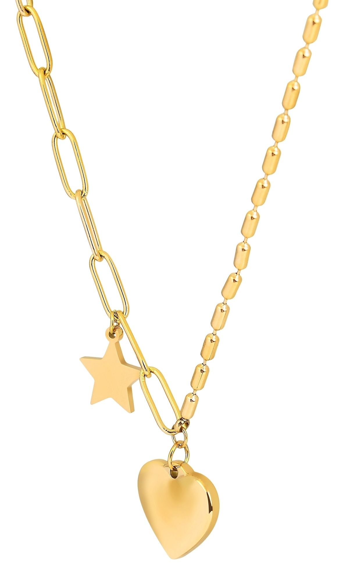 Die Edelstahlkette der Marke Akzent ist eine hochglanzpolierte Damenkette mit einer IP Gold-Beschichtung. Die Maße der Kette ergeben sich aus einer Länge von 43 cm, einer Stärke von 2,5 mm und eine Breite von 4 mm. Das Besondere an dieser Kette ist, dass sie aus zwei unterschiedlichen Kettenarten zusammengestellt ist. Die erste Hälfte der Kette ist eine Langpanzerkette, die zweite Hälfte eine Kugelkette aus länglichen Elementen. Diese werden mit einem gleichfarbigen Edelstahlanhänger in Herzform verbunden, der mit einer Gravur versehen werden kann. Die Abmessungen des Anhängers ergeben sich aus einer Länge von 16 mm, einer Breite von 18 mm und einer Stärke von 4,5 mm. An der Langpanzerkette hängt noch ein Anhänger in Sternform. Dieser ist 11,5 mm breit und hat eine Stärke von 1,5 mm. Die Kette kann auf 5 cm verlängert werden und lässt sich mit einem Karabinerverschluss öffnen und schließen.