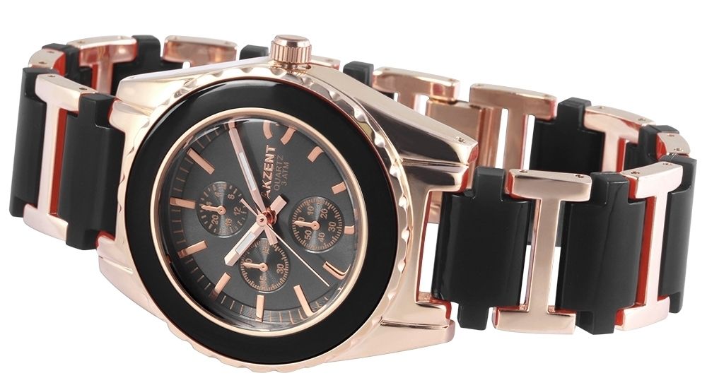 Die Analog Damenuhr der Marke Akzent verfügt über ein Hochwertiges Quarzwerk. Das Metallarmband ist 20 mm breit und wird mit einer Clipverschluss geöffnet. Die Gesamtlänge beträgt 21 cm. Das Metallgehäuse mit Mineralglas hat eine Abmessung von 39 mm und 13 mm Gehäusehöhe. Der Gehäusedeckel ist aus Edelstahl gefertigt. Die Uhr ist 3 ATM druckgeprüft. Weiteres Merkmal ist:Chronolook.