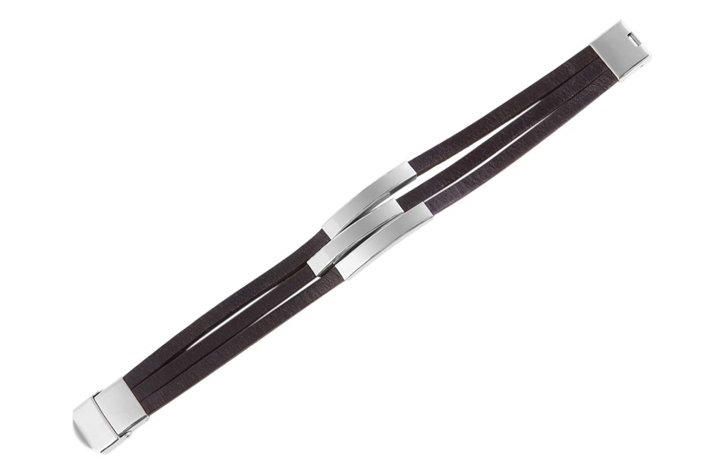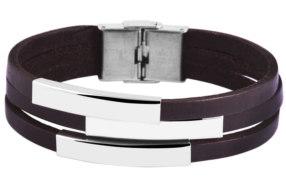 Das Schmuckarmband der Marke Akzent wurde aus drei braunen Echtlederriemen gefertigt. Diese sind 5 mm breit und haben eine glatte Oberfläche. An jeden Riemen ist ein silberfarbenes Edelstahlelement mit einer Länge von 41 mm, einer Breite von 6,5 mm und einer Stärke von 5 mm, angebracht, welches glänzend ist und sich gut für Gravuren eignet. Öffnen und schließen lässt sich das modische Armband mit einem silberfarbenen Hakenverschluss, der ebenfalls aus Edelstahl gefertigt ist. Die Maße des Lederarmbandes ergeben sich aus einer Länge von 21,5 cm, einer Breite von 20 mm und einer Stärke von 5 mm.