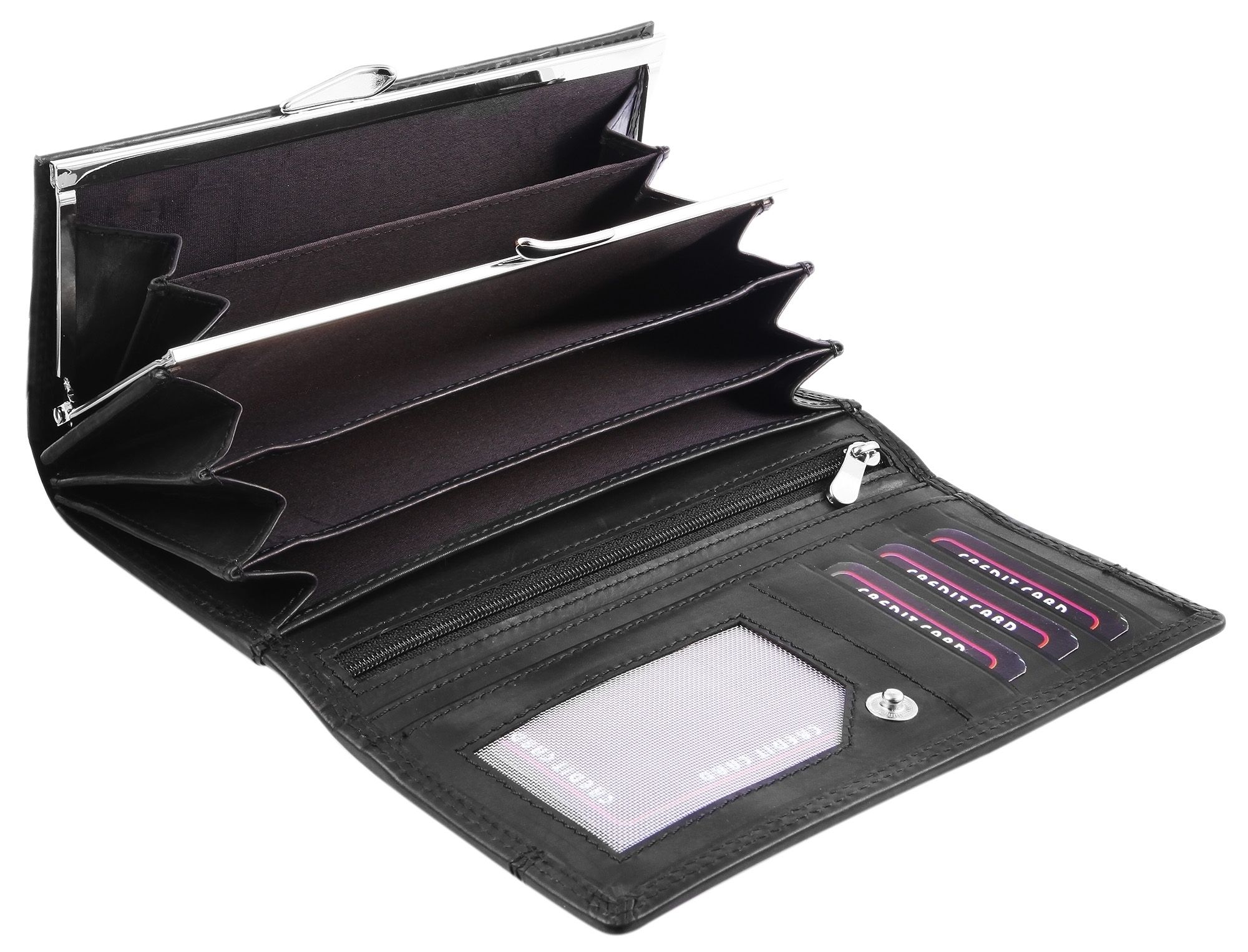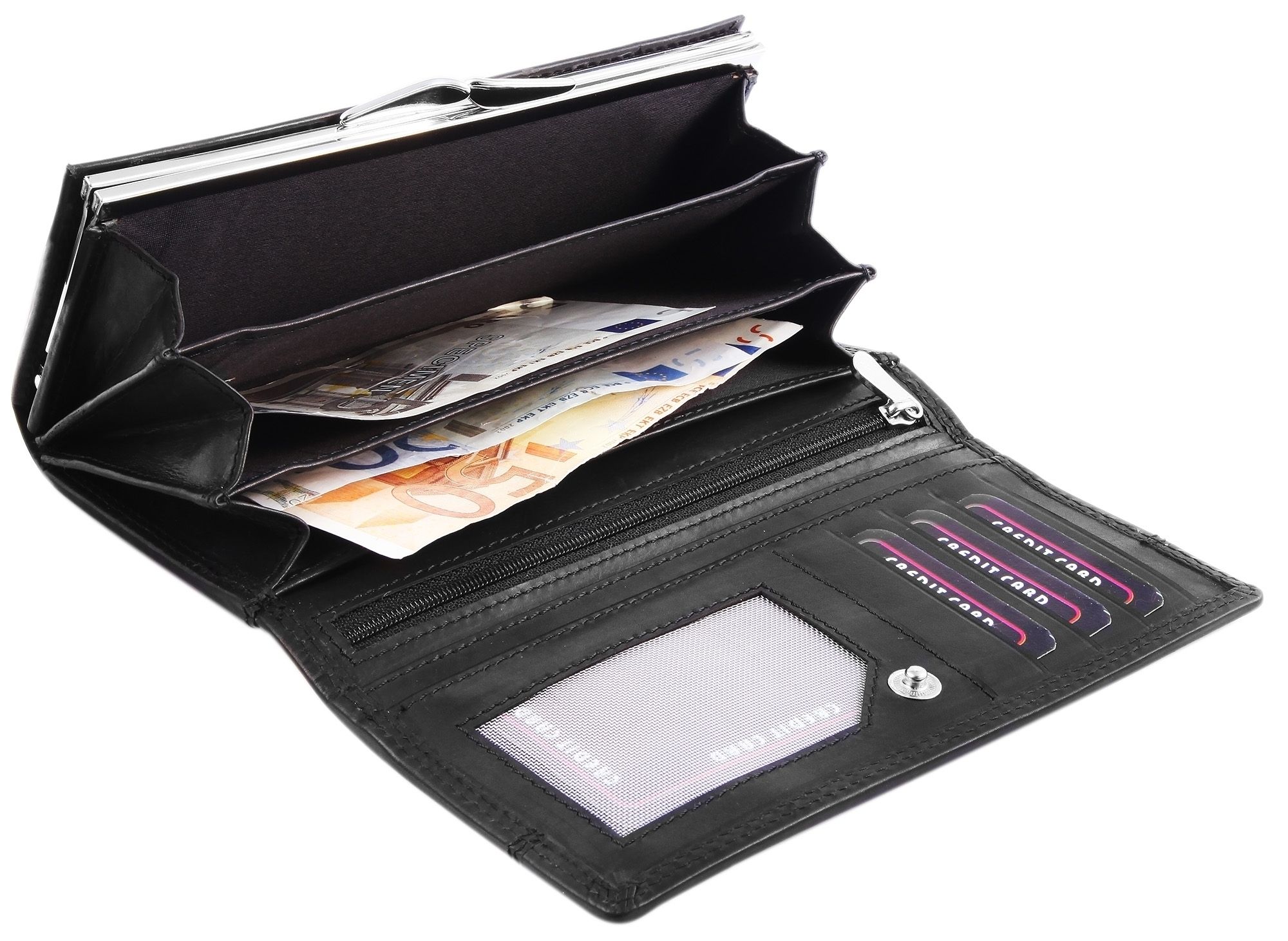 Die schwarze Geldbörse der Marke Akzent ist aus Echtleder im Querformat gefertigt. Die Besonderheit dieser Geldbörse ist, dass sie mit einem RFID-Schutz versehen ist. Dies ist eine Schutzschicht, die in das Portemonnaie eingearbeitet ist und verhindert, das Unbefugte Daten, wie zum Beispiel von der Kreditkarte, auslesen können. Die Börse lässt sich nach oben hin öffnen und verfügt auf der oberen Hälfte über vier Kartenfächer und ein Ausweisfach, das über ein transparentes Netz einsehbar ist. Unter den Kartenfächern befinden sich zwei Einsteckfächer, die über die gesamte Breite der Geldbörse reichen. Direkt unter den Einsteckfächern befindet sich ein Reißverschlussfach, das gut als Versteck für private Dinge dient und über die Fläche der unteren Hälfte der Geldbörse gefüllt werden kann. Die untere Hälfte des Portemonnaies lässt sich wie eine Zieharmonika nach vorne hin aufklappen und verfügt dort über ein weiteres Einsteckfach und drei Geldscheinfächer. An das vorderste Geldscheinfach grenzt ein doppeltes Münzfach, das sich separat mit einem Bügelverschluss, oder auch Clip, - oder Kussverschluss öffnen und schließen lässt. Zusätzlich befindet sich auf der Rückseite der Börse ein weiteres praktisches Einsteckfach. Die Maße der besonderen Geldbörse ergeben sich aus einer Länge von 10 cm, einer Breite von 18 cm und einer Höhe von 3 cm.