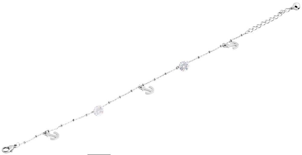 Das Fußkettchen der Marke Akzent besteht aus einer Ankerkette mit drei Anhängern in Form eines Ankers. Des Weiteren binden sich noch 2 weiße Steinchenanhänger an dem Fußkettchen. Öffnen und Schließen lässt sich das Fußkettchen mit Hilfe eines Karabinerhakens, der ebenfalls aus Edelstahl gefertigt ist. Durch die Verlängerung von 5 cm, lässt sich die Länge variieren. Die Maße ergeben eine Gesamtlänge von 27,5 cm und einer Kettenstärke von 1 mm. Die Anhänger haben eine Läge von 1,2 cm und eine Breite von 3 mm. Die runden Anhänger haben einen Durchmesser von 8 mm.