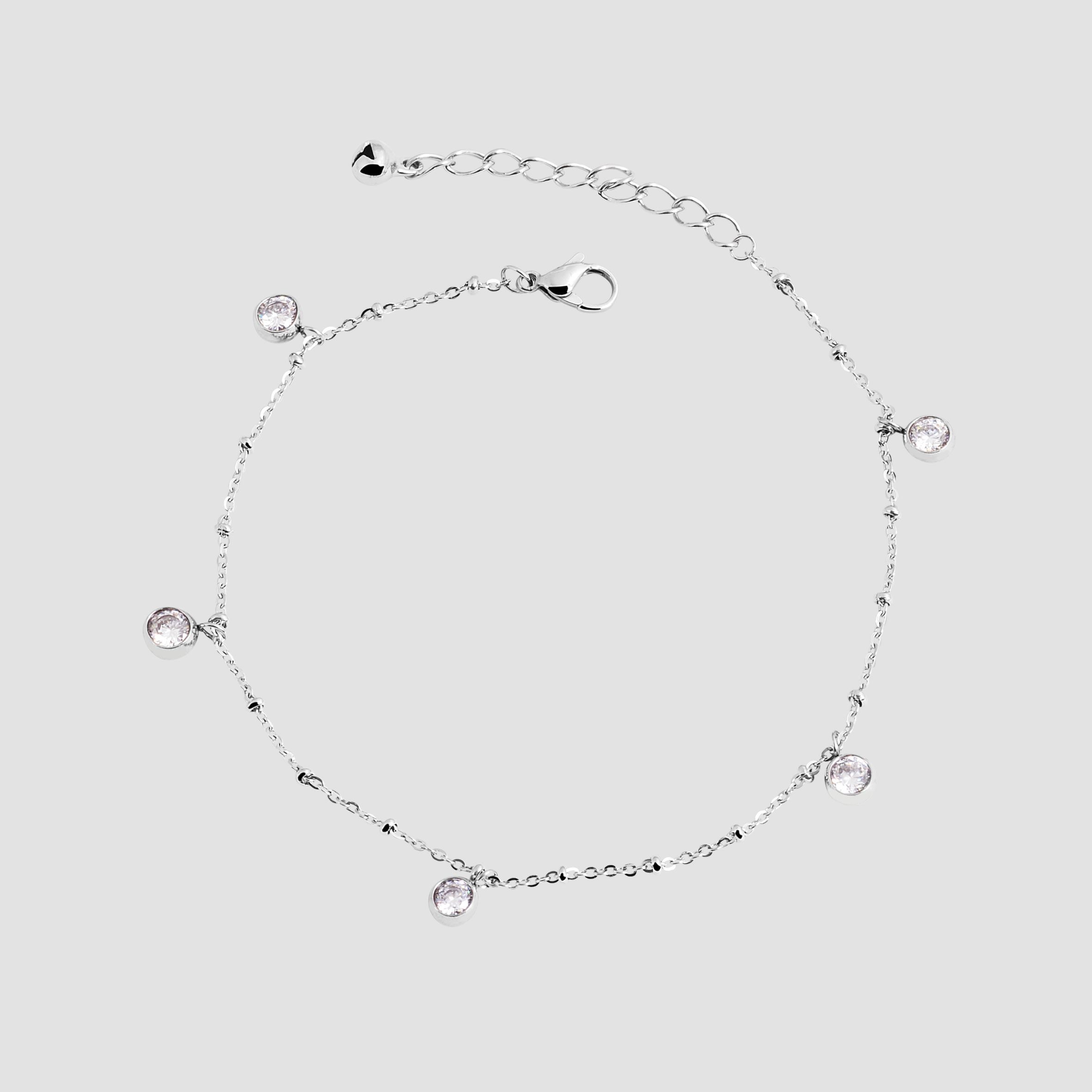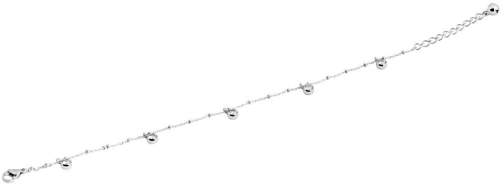 Das Fußkettchen der Marke Akzent besteht aus einer Ankerkette mit fünf Anhängern. Öffnen und schließen lässt sich das Fußkettchen mit Hilfe eines Karabinerhakens, der ebenfalls aus Edelstahl gefertigt ist. Durch die Verlängerung von 5 cm, lässt sich die Länge variieren. Die Maße ergeben eine Gesamtlänge von 27,5 cm und einer Kettenstärke von 1 mm. Die weißen runden Anhänger haben einen Durchmesser von 8 mm.
