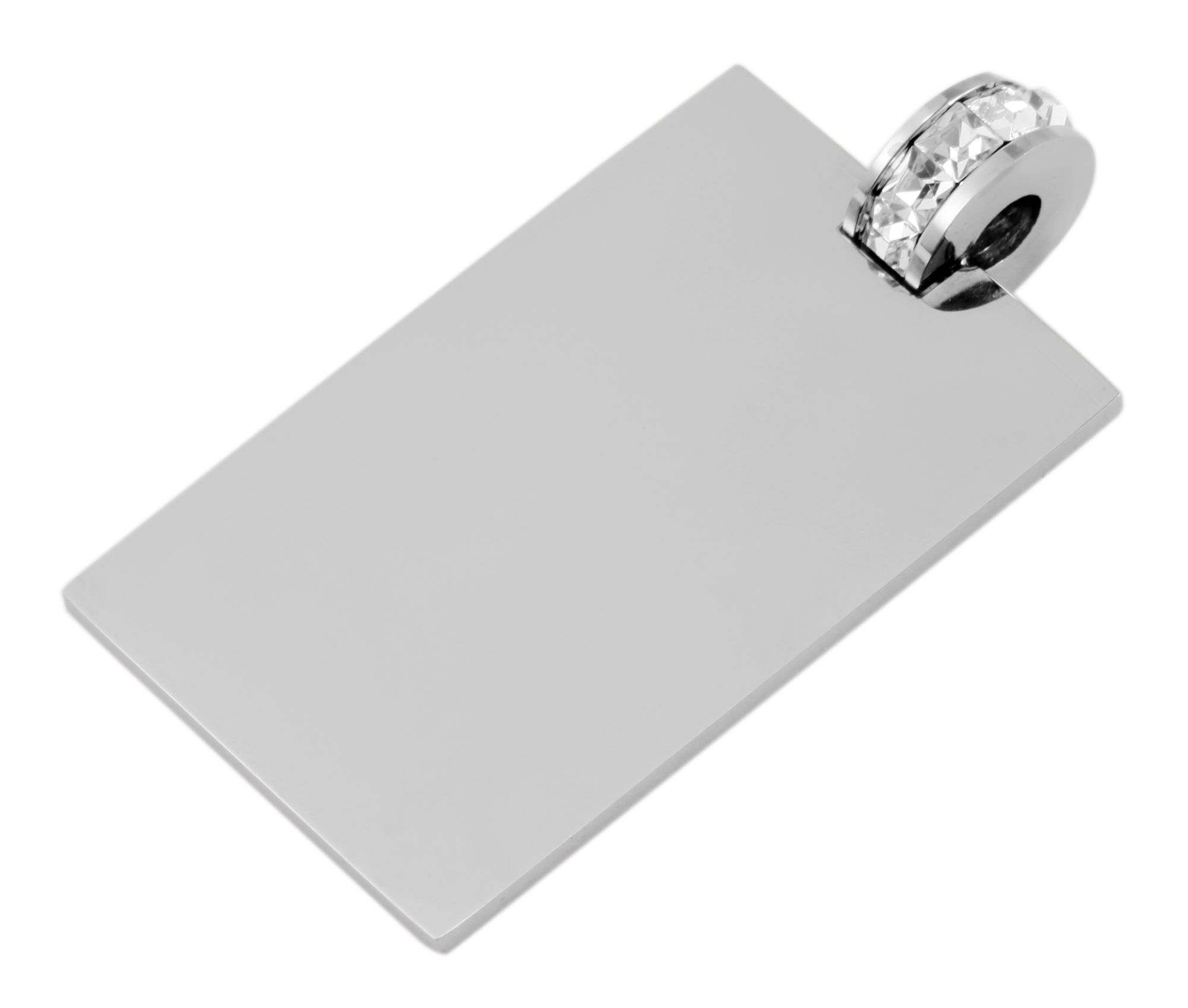 Der rechteckige Gravuranhänger, für Gravuren aller Art, der Marke Akzent besteht aus dem Material Edelstahl. Das Material verspricht eine lange Lebensdauer. Der Anhänger ist silberfarbig gehalten und hochglanzpoliert. Zusätzlich ist die Öse mit 12 Similisteinen besetzt. Das verleiht dem rechteckigen Gravuranhänger eine schlichte Eleganz. Die Maße betragen: Länge 28 mm, Breite 18 mm und Stärke 1 mm.