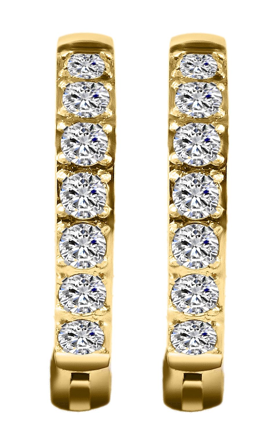 Die goldfarbigen Creolen der Marke Akzent wurden aus Edelstahl hergestellt und sind auf der Vorderseite mit jeweils sieben weißen Similisteinen besetzt. Sie haben einen Durchmesser von 10 mm und eine Breite sowie Materialstärke von 2 mm. Mit einem praktischen Klappverschluss aus Edelstahl lassen sich die Ohrringe am Ohrloch sichern, der Verschluss sorgt für sicheren Halt am Ohrloch und für ein einfaches An- und Ablegen. Die schlichten Klapp-Creolen sind ein toller Alltagsbegleiter, der sich zu jedem Outfit kombinieren lässt.