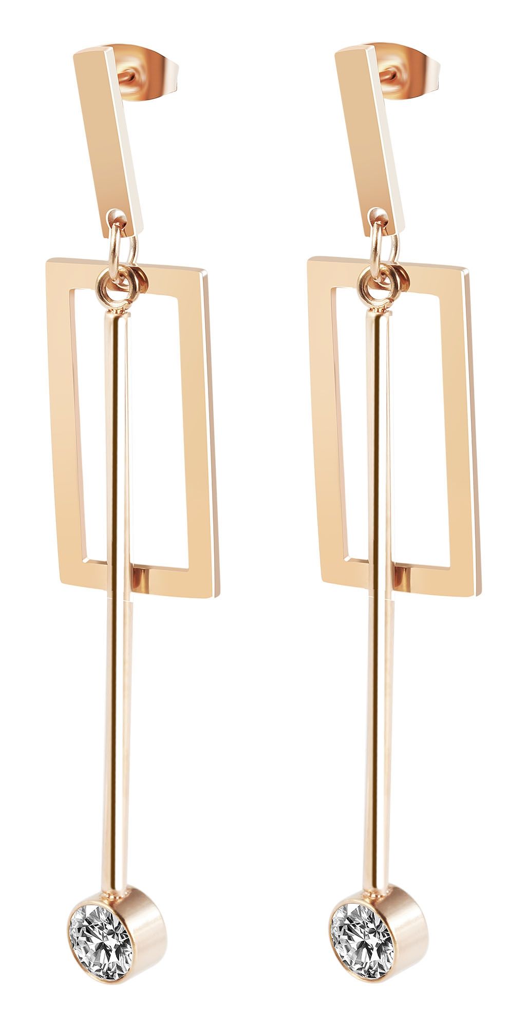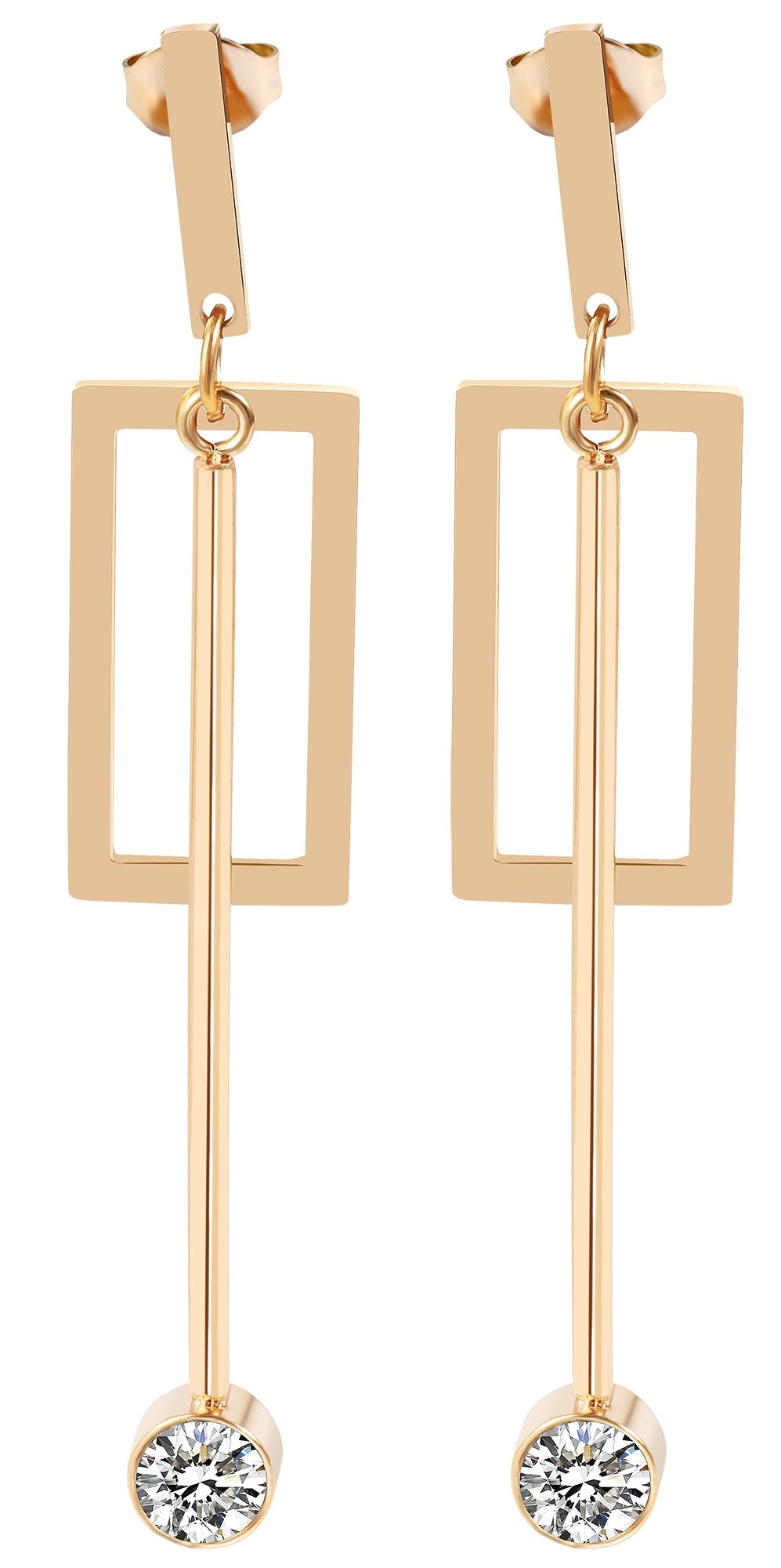 Akzent Ohrring aus Edelstahl in goldfarbig. Der Verschluss ist ein Steckverschluss. Die Beschaffenheit zeigt sich in Edelstahl glänzend. Der Artikel hat folgende Abmessungen: Länge: 7 cm, Breite: 1,3 cm und 0,4 cm. Aufgewertet wird der Ohrschmuck mit einem Swarovski Stein und einem offenen Rechteck als Anhänger.