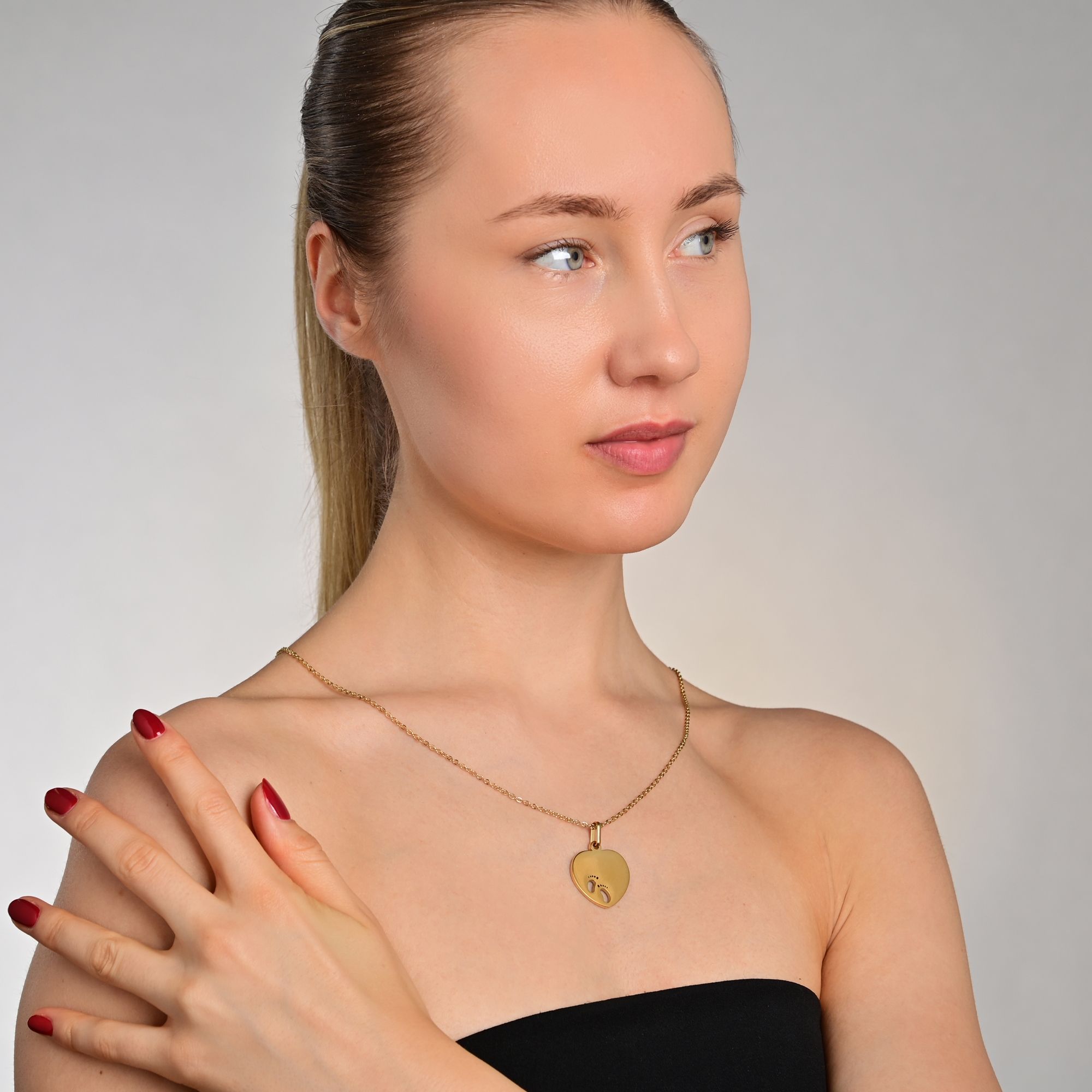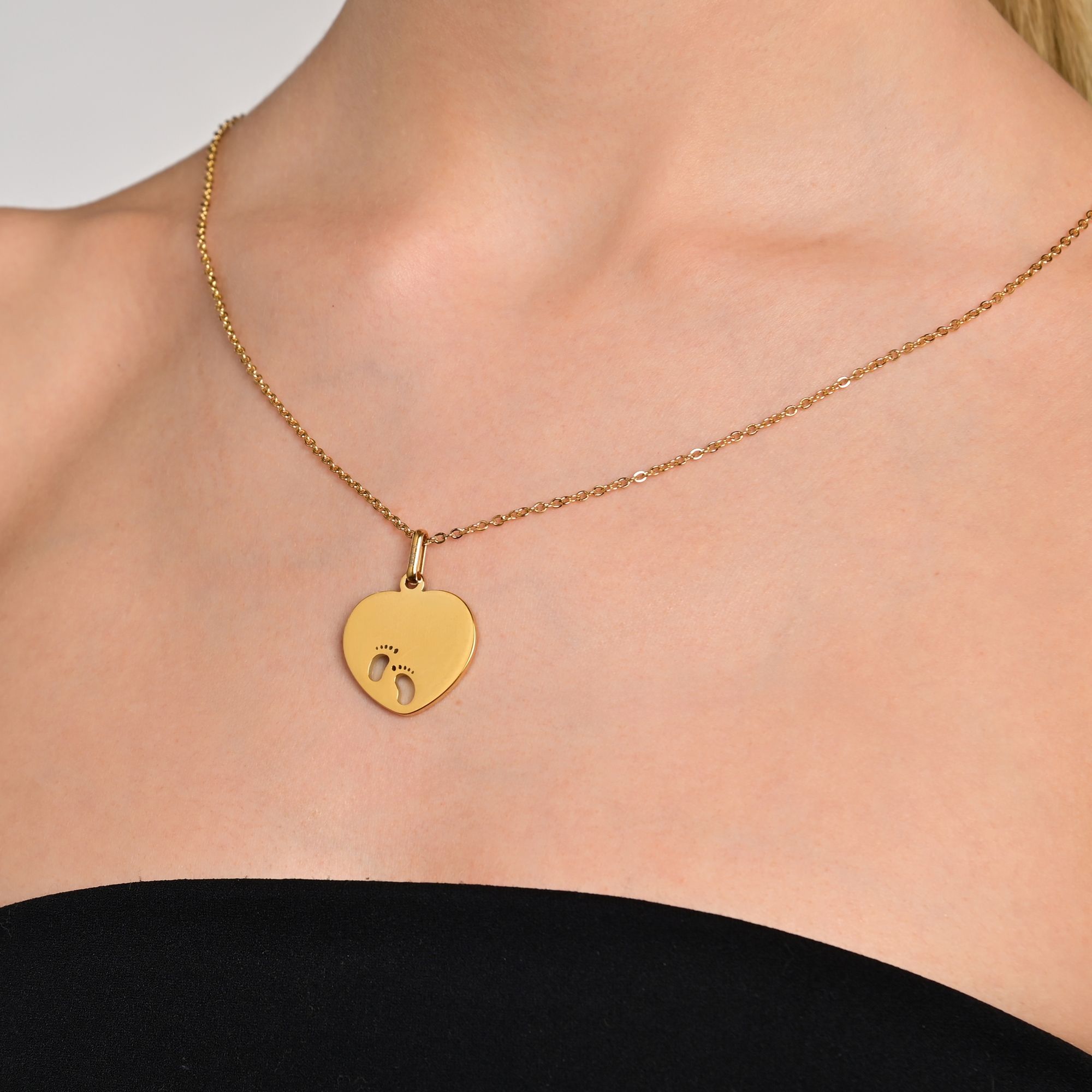 Der goldfarbene Gravuranhänger der Marke Akzent ist aus Edelstahl gefertigt und hat die Form eines Herzens. In das Herz wurden seitlich zwei kleine Fräsungen gemacht, die die Form von zwei kleinen Babyfüßen haben. Diese machen den Kettenanhänger zu einem besonderen Hingucker. Die restliche Fläche des Anhängers kann sowohl auf der Vorder- als auch auf der Rückseite mit Gravuren aller Art versehen werden. Die Oberfläche der Gravurplatte ist hochglanzpoliert. Die Maße des massiven Anhängers ergeben sich aus einer Länge von 26,5 mm, einer Breite von 25 mm und einer Materialstärke von 2 mm. Durch das robuste Material und die hochwertige Verarbeitung verspricht der Schmuckanhänger eine lange Lebensdauer.