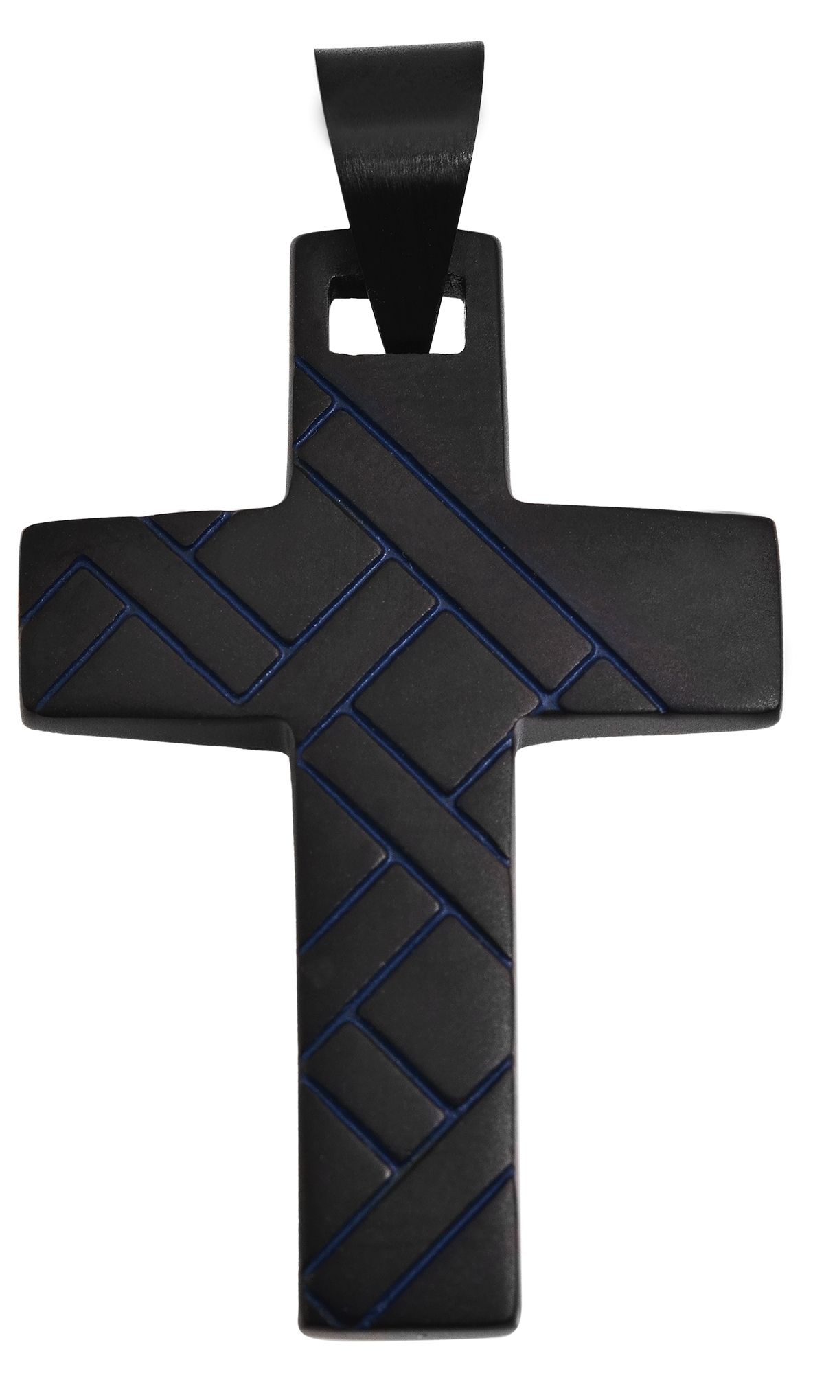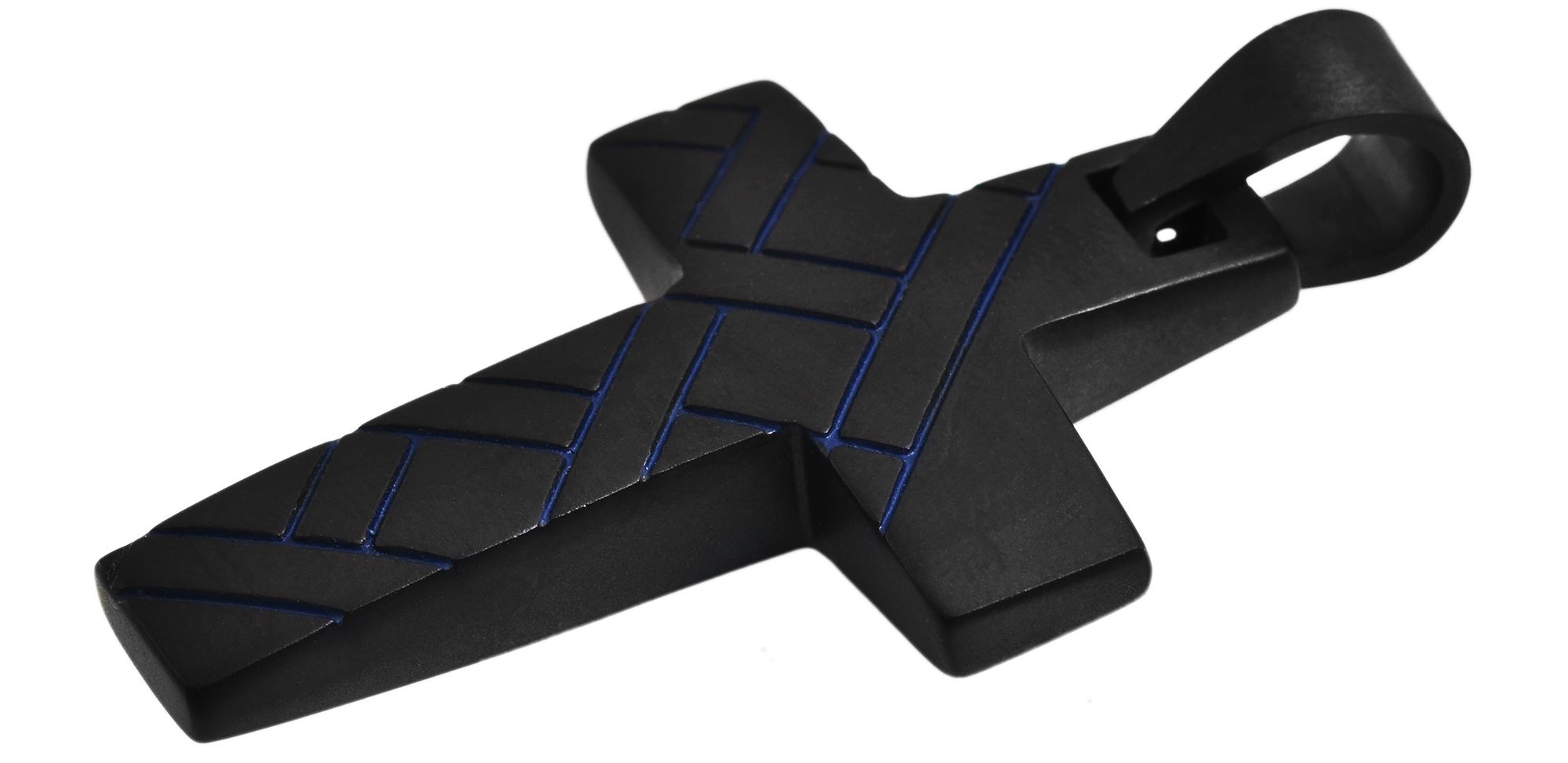 Der Anhänger der Marke Akzent in Form eines Kreuzes wurde aus Edelstahl hergestellt und ist mit einer Ionenplattierung versehen. Diese Beschichtung sorgt für eine besondere Optik des Materials. Die Oberfläche ist mattiert. Der Anhänger ist schwarz gehalten und ist mit kleinen Fräsungen versehen, die mit blauer Farbe gefüllt sind. Die Anhängergröße ergibt sich aus einer Länge von 35 mm, einer Breite von 24 mm und einer Stärke von 5 mm.