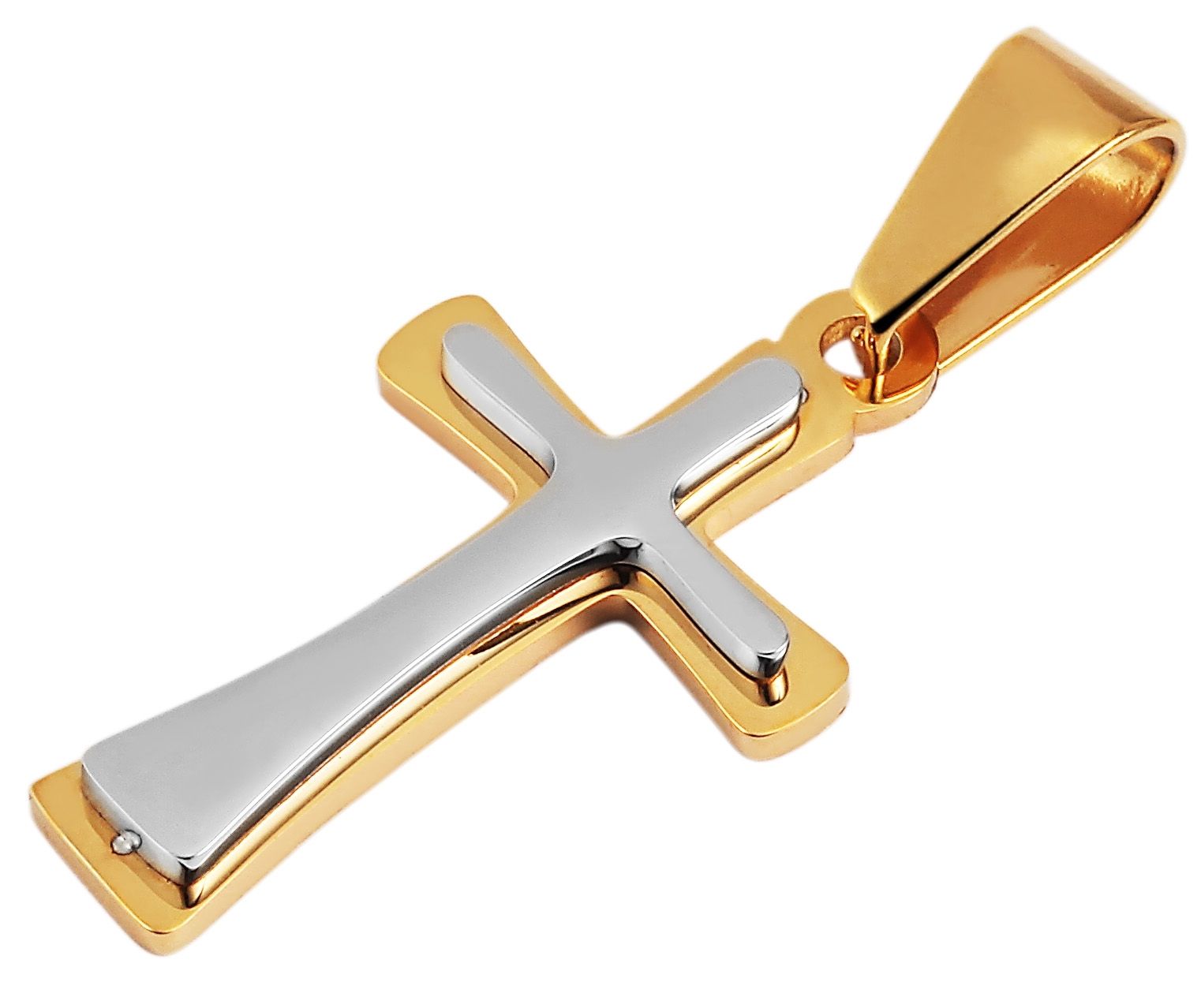 Der Anhänger der Marke Akzent in Form eines Kreuzes wurde aus Edelstahl gefertigt und ist zusätzlich mit einer Ionenplattierung versehen. Diese Beschichtung verbessert die Optik des Materials. Der Anhänger ist goldfarbig. Auf dem goldfarbigen Kreuz ist ein weiteres kleineres Kreuz in silberfarben aufgesetzt. Dieser sogenannte "Twinlook" macht den Anhänger zu einem optischen Highlight. Die Anhängergröße ergibt sich aus einer Länge von 28 mm, einer Breite von 16 mm und einer Stärke von 3 mm.