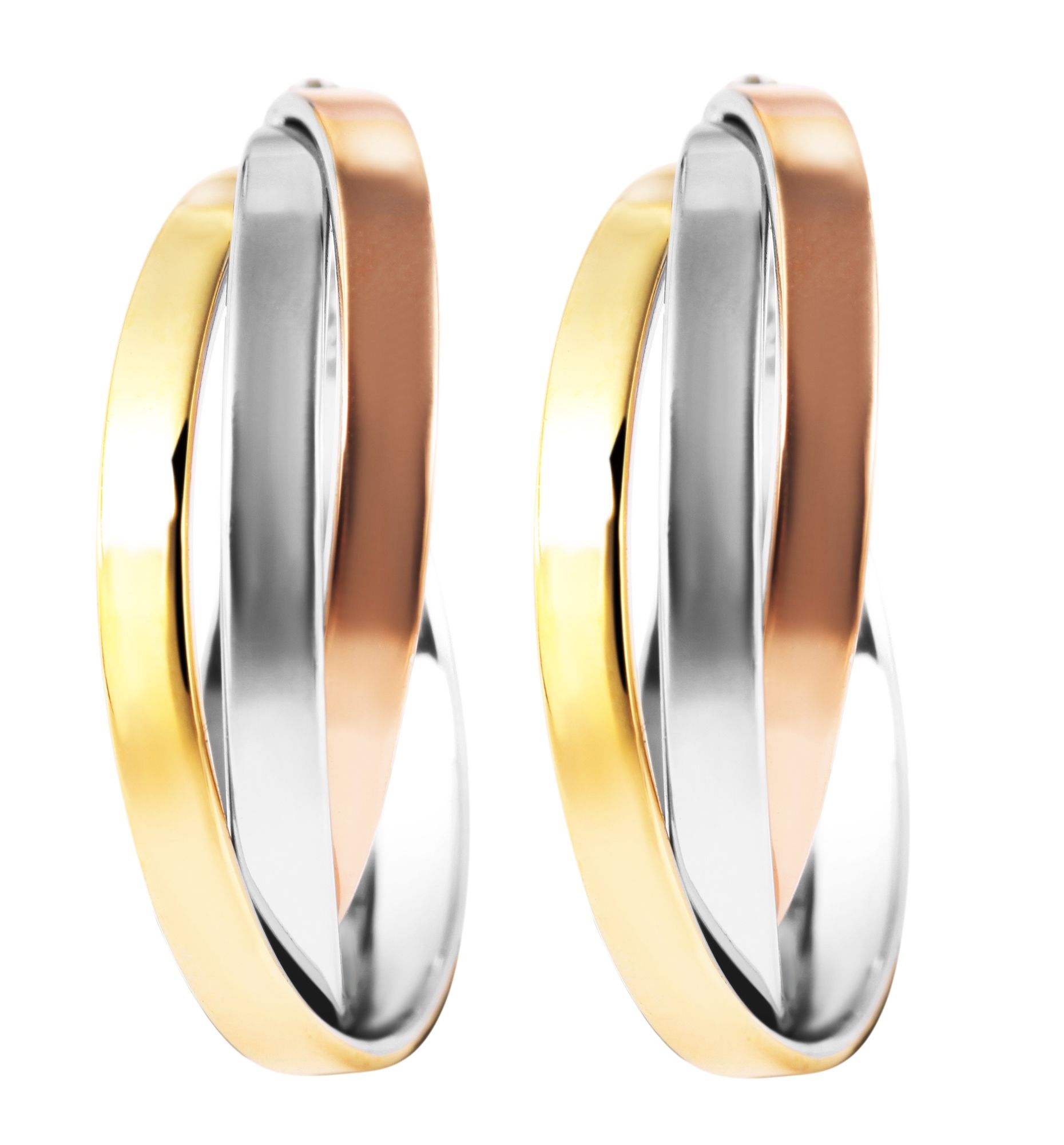 Die hochglanzpolierten Creolen der Marke Akzent sind aus Edelstahl gefertigt und lassen sich mit einem klassischen Bügelverschluss sicher verschließen. Die Tricolor-Ohrringe sind aus drei 3 mm breiten Reifen, die miteinander verschlungen sind, gefertigt. Silberfarben, goldfarben und roségoldfarben sind die drei Farben, die die Oberfläche der modernen Creolen verzieren. Zusammen geben sie ein harmonisches Gesamtbild ab und machen sie aufgrund der Vielfältigkeit mit jedem anderen Schmuckstück kombinierbar. An der breitesten Stelle sind die Creolen 9 mm breit und die Materialstärke beträgt 1,5 mm.