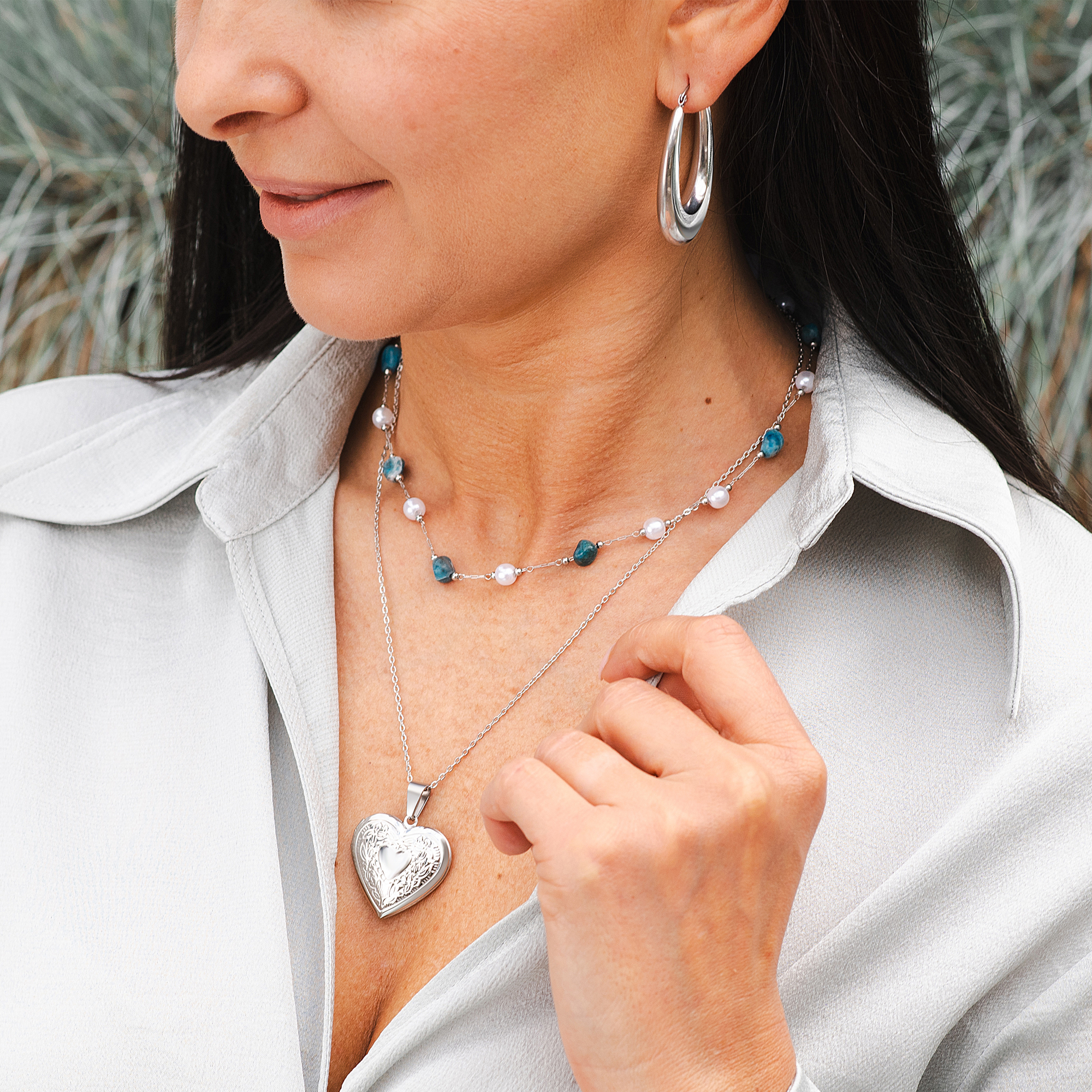 Mit einer Länge von 40 cm und einer Verlängerung von 5 cm bietet diese Kette eine perfekte Passform und viele Tragemöglichkeiten. Der Karabinerverschluss sorgt nicht nur für sicheren Halt, sondern auch für ein müheloses An- und Ablegen. Das Herzstück dieser Kette sind die zehn hellblauen Natursteine, jeder ein Kunstwerk der Natur mit individueller Schönheit. In verschiedenen Größen angeordnet, verleihen sie der Kette eine unvergleichliche Ästhetik und Tiefe. Ergänzt werden sie durch neun Süßwasserperlen, jede einzigartig und von zeitloser Schönheit. Gemeinsam schaffen sie eine harmonische Verbindung von Natürlichkeit und Eleganz.
