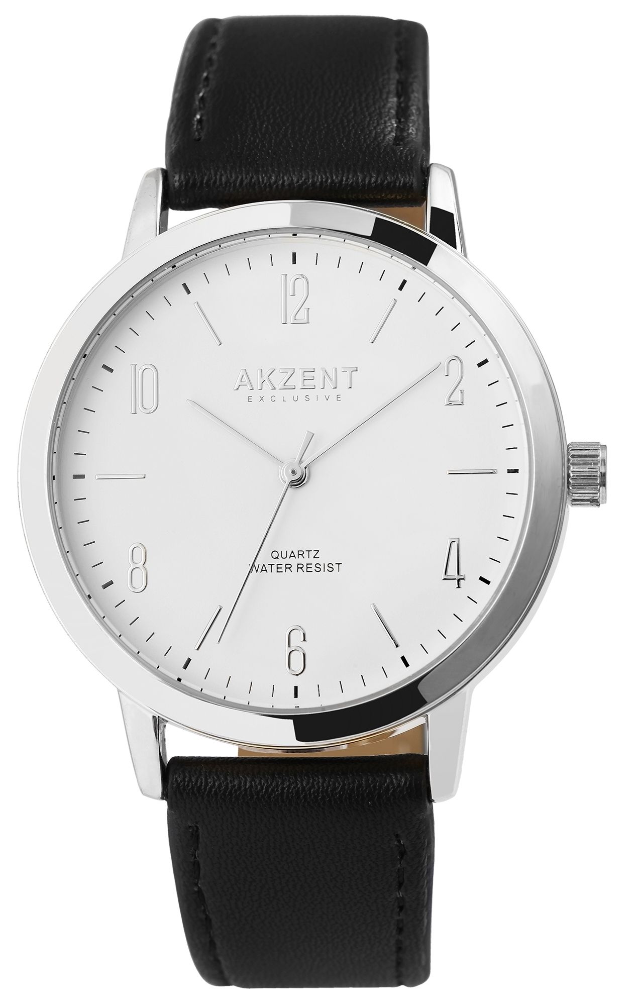 Die analoge 3-Zeiger Herrenarmbanduhr der Marke Akzent Exclusive verfügt über ein hochwertiges Quarzuhrwerk. Das schwarze Lederimitatarmband ist am Anstoß 20 mm breit und lässt sich mit einer silberfarbenen Dornschließe öffnen und schließen. Die Gesamtlänge der Uhr beträgt 24,5 cm. Das silberfarbene Metallgehäuse mit Mineralglas hat eine Abmessung von 42 mm im Durchmesser und einer Gehäusehöhe von 9 mm. Der Gehäuseboden ist aus Edelstahl gefertigt und die Uhr hat eine Wasserdichtigkeit von 3 bar. Das Zifferblatt ist weiß und die Zeiger und Ziffern anthrazitfarben. Die Uhr überzeugt mit schlichter Eleganz und ist vielseitig kombinierbar.