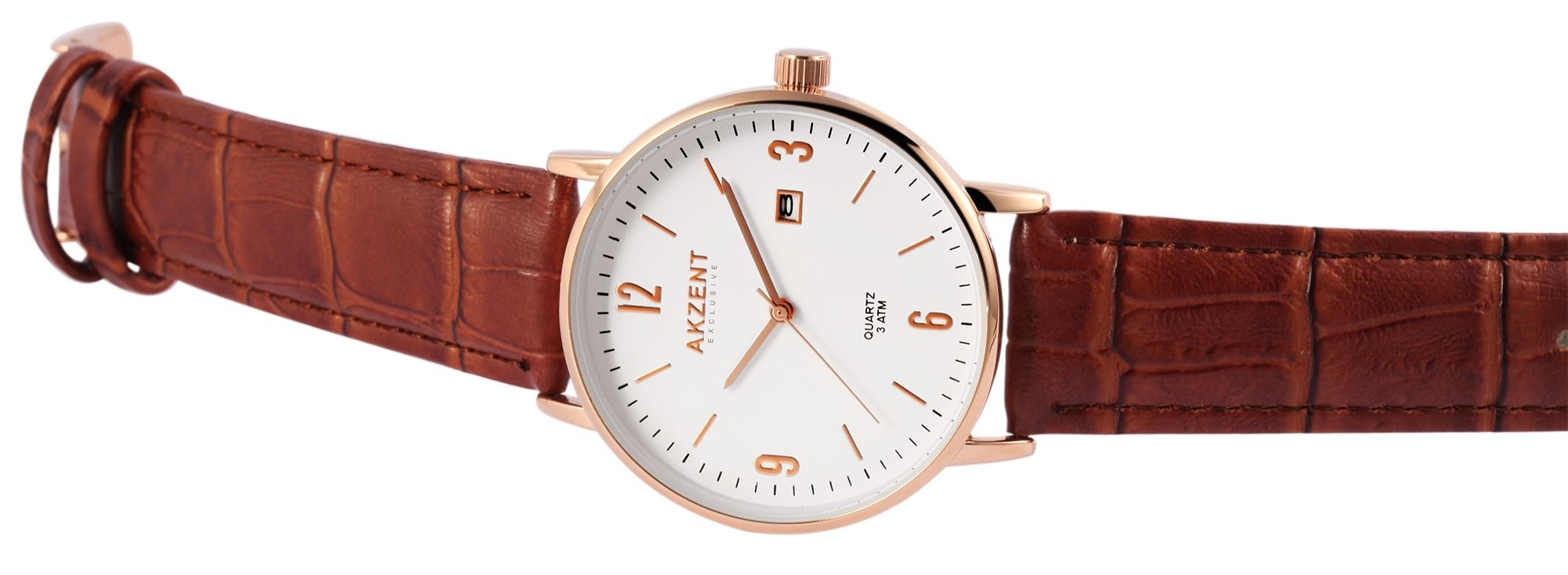 Die analoge 3-Zeiger Herrenarmbanduhr der Marke Akzent Exclusive verfügt über ein hochwertiges Quarzuhrwerk. Das braune Lederimitatarmband ist am Anstoß 20 mm breit und lässt sich mit einer roségoldfarbenen Dornschließe öffnen und schließen. Die Gesamtlänge der Uhr beträgt 25 cm. Das roségoldfarbene Metallgehäuse mit Mineralglas hat eine Abmessung von 40 mm im Durchmesser und einer Gehäusehöhe von 10 mm. Der Gehäuseboden ist aus Edelstahl gefertigt und die Uhr hat eine Wasserdichtigkeit von 3 bar. Das Zifferblatt ist weiß und die Zeiger und Ziffern sind roségoldfarben. Die Uhr überzeugt mit schlichter Eleganz und ist vielseitig kombinierbar.