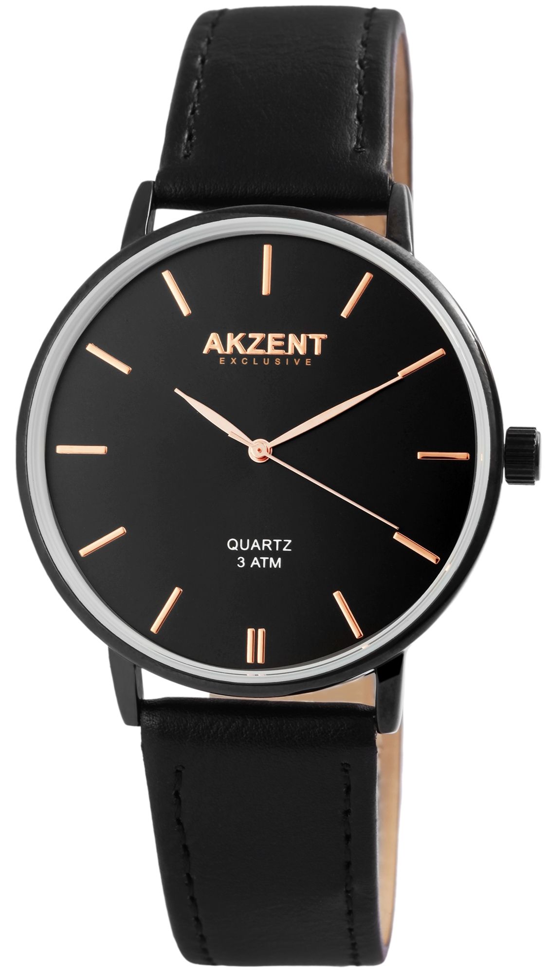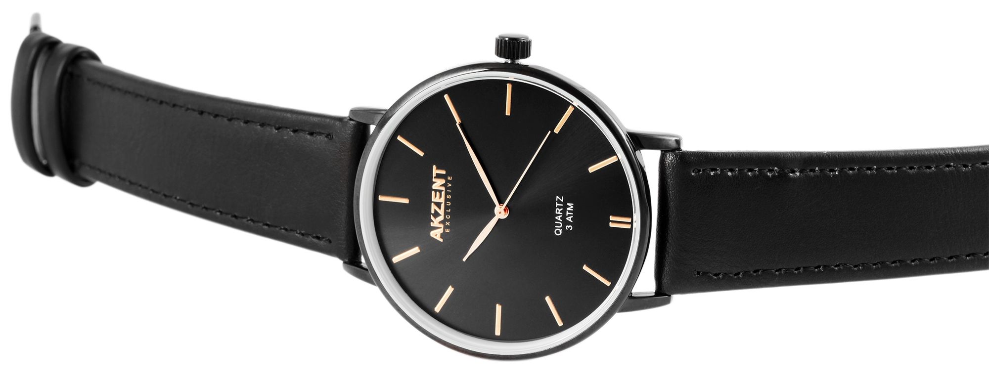 Die analoge 3-Zeiger Herrenarmbanduhr der Marke Akzent Exclusive verfügt über ein hochwertiges Quarzuhrwerk. Das schwarze Lederimitatarmband ist am Anstoß 20 mm breit und lässt sich mit einer schwarzen Dornschließe öffnen und schließen. Die Gesamtlänge der Uhr beträgt 25,5 cm. Das schwarze Metallgehäuse mit Mineralglas hat eine Abmessung von 42 mm im Durchmesser und einer Gehäusehöhe von 8 mm. Der Gehäuseboden ist aus Edelstahl gefertigt und die Uhr hat eine Wasserdichtigkeit von 3 bar. Das Zifferblatt ist ebenfalls schwarz und die Zeiger und Indexe sind roségoldfarben. Sie heben sich dem Zifferblatt optisch hervor und verleihen der Uhr einen besonderen Look. Die Uhr überzeugt mit schlichter Eleganz und ist vielseitig kombinierbar.