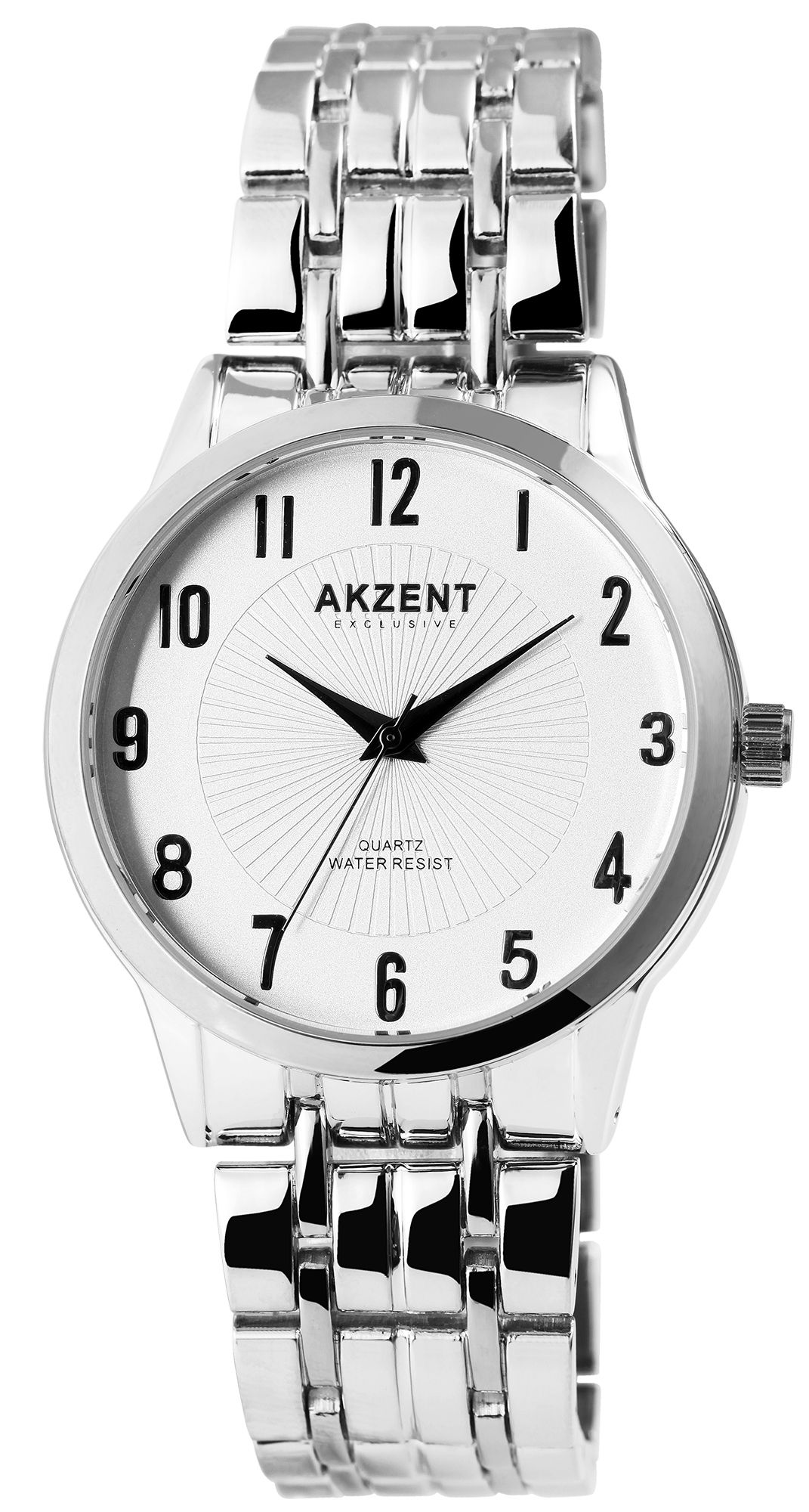 Die analoge 3-Zeiger Herrenarmbanduhr der Marke Akzent Exclusive verfügt über ein hochwertiges Quarzuhrwerk. Das silberfarbene Metallarmband ist am Anstoß 22 mm breit und lässt sich mit einer silberfarbenen Edelstahl-Faltschließe öffnen und schließen. Die Gesamtlänge der Uhr beträgt 22,5 cm. Das silberfarbene Metallgehäuse mit Mineralglas hat eine Abmessung von 42 mm im Durchmesser und einer Gehäusehöhe von 10 mm. Der Gehäuseboden ist aus Edelstahl gefertigt und die Uhr hat eine Wasserdichtigkeit von 3 bar. Ein optisches Highlight ist das weiße Zifferblatt, welches von der Mitte aus nach außen strahlenförmig geriffelt ist. Außerdem sind die Ziffern bei diesem Modell sehr groß, sodass man die Uhrzeit besonders gut ablesen kann. Die Zeiger und Ziffern sind schwarz und passen sich optisch gut dem Gesamtbild der Uhr an.