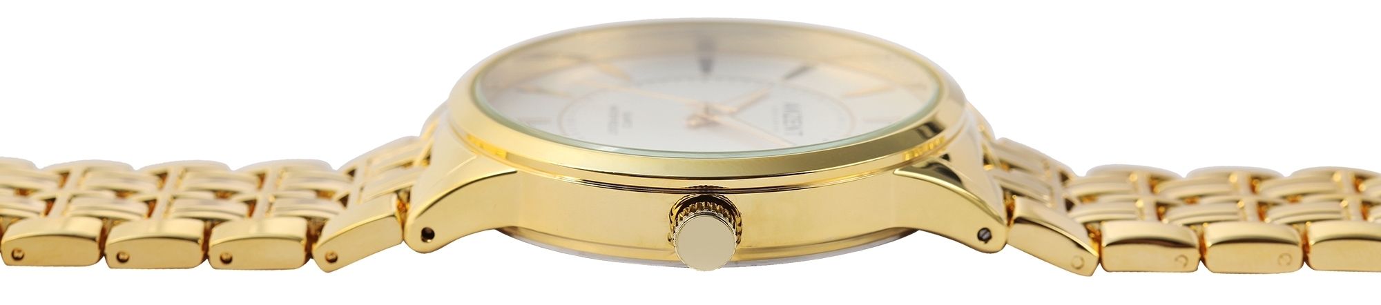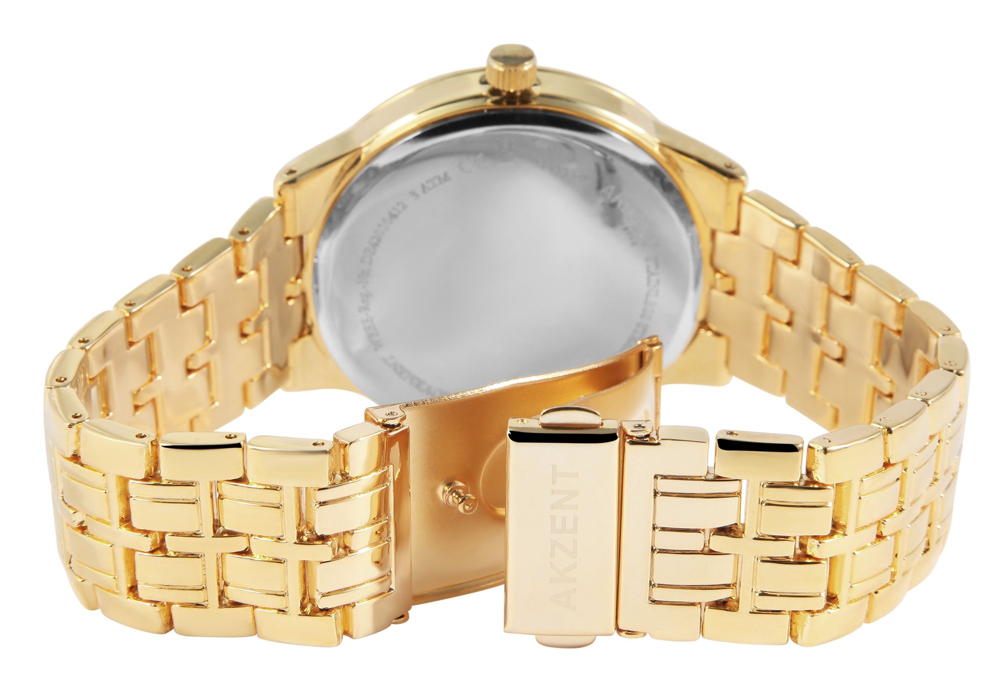 Die analoge 3-Zeiger Herrenarmbanduhr der Marke Akzent Exclusive verfügt über ein hochwertiges Quarzuhrwerk. Das goldfarbene Metallarmband ist am Anstoß 22 mm breit und lässt sich mit einem goldfarbenen Clipverschluss öffnen und schließen. Die Gesamtlänge der Uhr beträgt 21,5 cm. Das goldfarbene Metallgehäuse mit Mineralglas hat eine Abmessung von 42 mm im Durchmesser und einer Gehäusehöhe von 10 mm. Der Gehäuseboden ist aus Edelstahl gefertigt und die Uhr hat eine Wasserdichtigkeit von 3 bar. Ein optisches Highlight ist das silberfarbene Zifferblatt, welches einen abgetrennten Zifferblattring hat, auf dem sich große Strichindexe befinden. Zudem ist der mittlere Kreis des Zifferblatts noch mit kleinen schwarzen Strichindexen versehen, um die Uhrzeit möglichst genau ablesen zu können. Durch die mit Superluminova beschichteten Zeiger lässt sich auch im Dunkeln die Zeit besonders gut ablesen. Die Zeiger und Indexe sind ebenfalls goldfarben und passen sich optisch gut dem Gesamtbild der Uhr an.