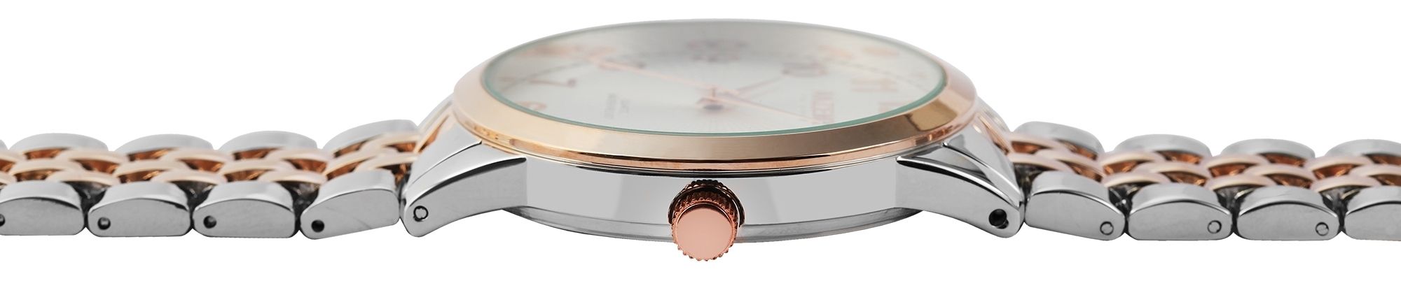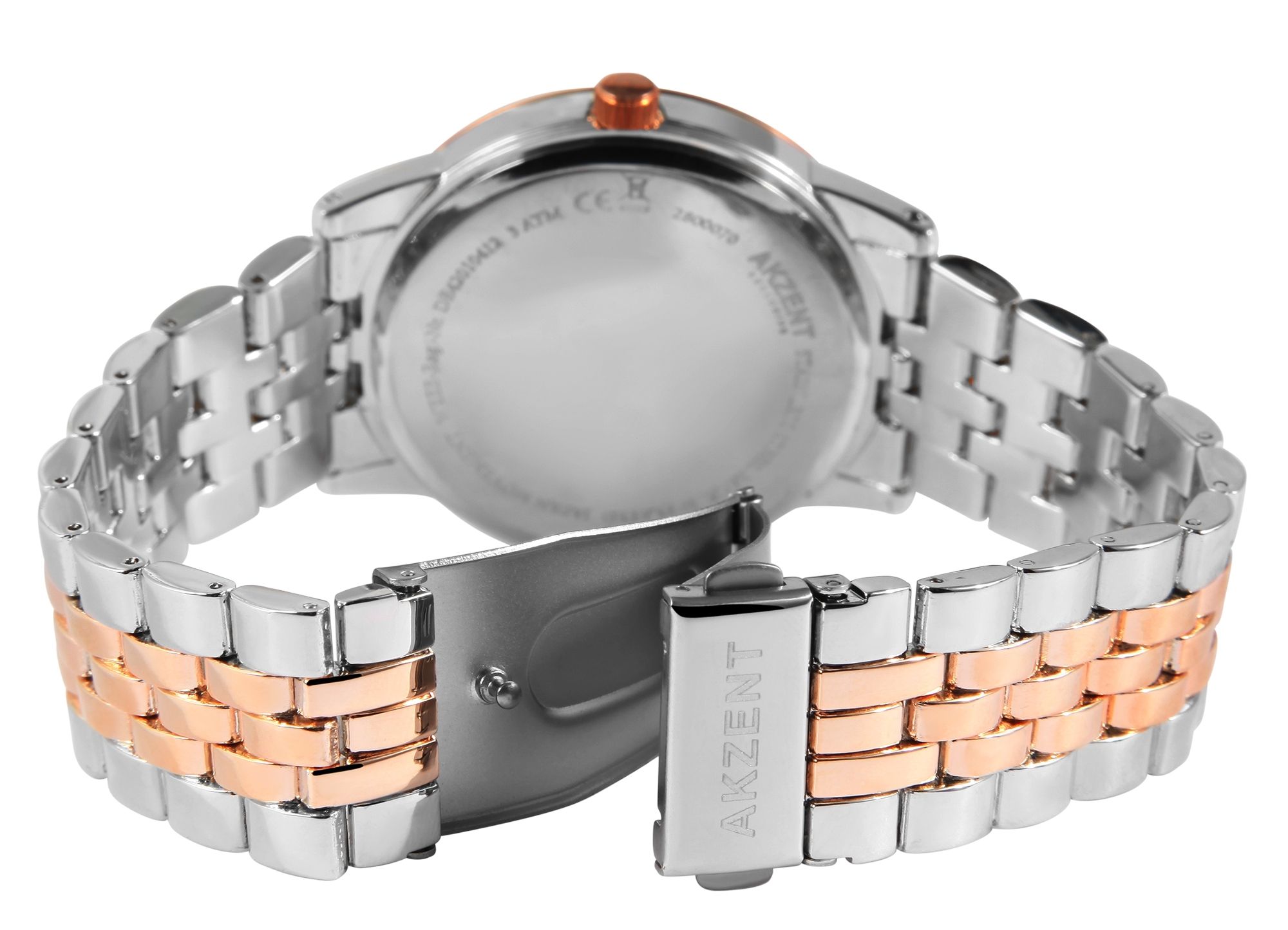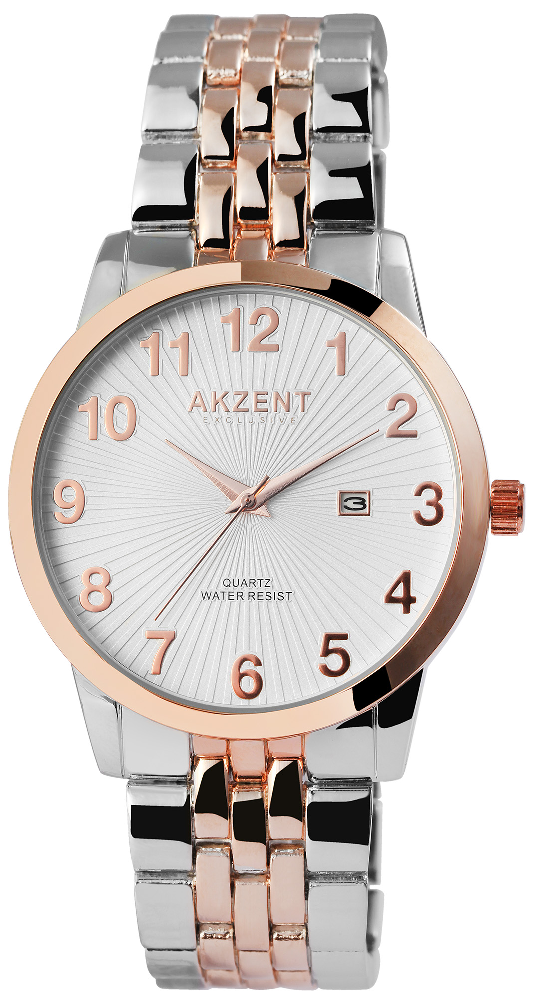 Die analoge 3-Zeiger Herrenarmbanduhr der Marke Akzent Exclusive verfügt über ein hochwertiges Quarzuhrwerk. Das silber- und roségoldfarbene Metallarmband ist am Anstoß 22 mm breit und lässt sich mit einem silberfarbenen Clipverschluss öffnen und schließen. Die Gesamtlänge der Uhr beträgt 22 cm. Das silberfarbene Metallgehäuse mit roségoldfarbener Lünette und Mineralglas hat eine Abmessung von 42 mm im Durchmesser und einer Gehäusehöhe von 9 mm. Der Gehäuseboden ist aus Edelstahl gefertigt und die Uhr hat eine Wasserdichtigkeit von 3 bar. Ein optisches Highlight ist das weiße Zifferblatt, welches von der Mitte aus nach außen strahlenförmig geriffelt ist. Außerdem sind die Ziffern bei diesem Modell sehr groß, sodass man die Uhrzeit besonders gut ablesen kann. Die Zeiger und Ziffern sind roségoldfarben und passen sich optisch gut dem Gesamtbild der Uhr an.
