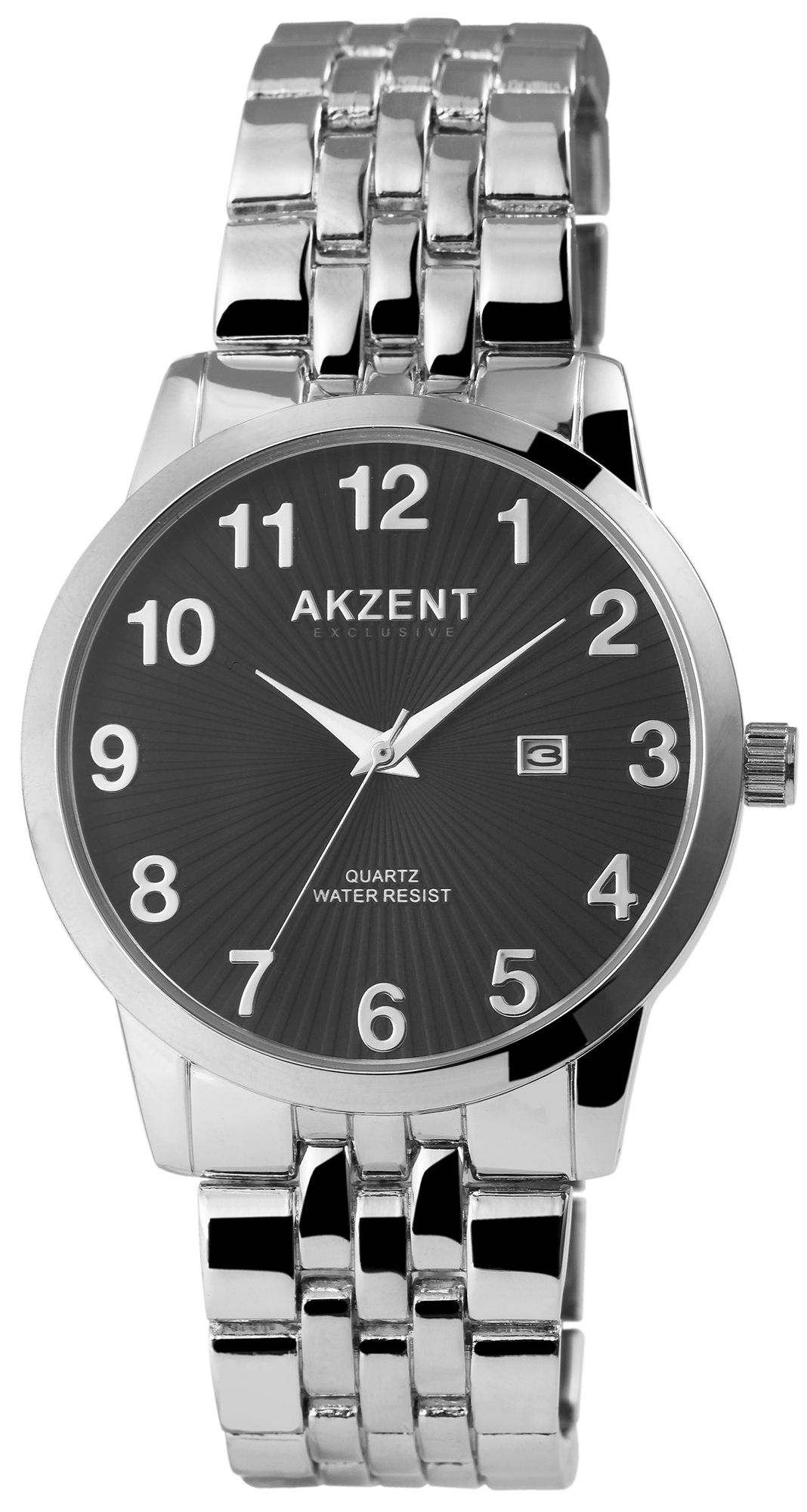 Die analoge 3-Zeiger Herrenarmbanduhr der Marke Akzent Exclusive verfügt über ein hochwertiges Quarzuhrwerk. Das silberfarbene Metallarmband ist am Anstoß 22 mm breit und lässt sich mit einem silberfarbenen Clipverschluss öffnen und schließen. Die Gesamtlänge der Uhr beträgt 22 cm. Das silberfarbene Metallgehäuse mit Mineralglas hat eine Abmessung von 42 mm im Durchmesser und einer Gehäusehöhe von 9 mm. Der Gehäuseboden ist aus Edelstahl gefertigt und die Uhr hat eine Wasserdichtigkeit von 3 bar. Ein optisches Highlight ist das schwarze Zifferblatt, welches von der Mitte aus nach außen strahlenförmig geriffelt ist. Außerdem sind die Ziffern bei diesem Modell sehr groß, sodass man die Uhrzeit besonders gut ablesen kann. Die Zeiger und Ziffern sind ebenfalls silberfarben und passen sich optisch gut dem Gesamtbild der Uhr an.
