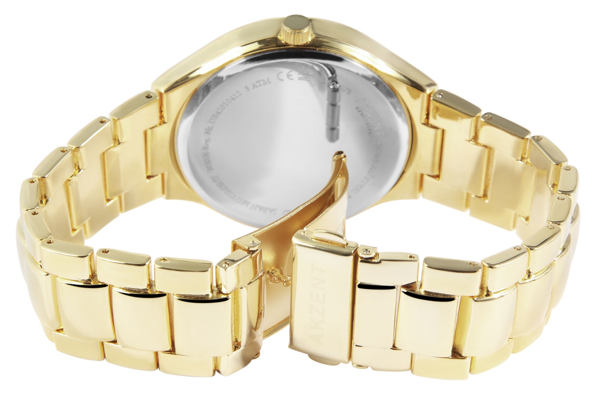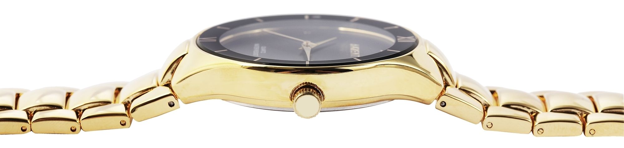 Die analoge 3-Zeiger Herrenarmbanduhr der Marke Akzent Exclusive verfügt über ein hochwertiges Quarzuhrwerk. Das goldfarbene Metallarmband ist am Anstoß 22 mm breit und lässt sich mit einem goldfarbenen Clipverschluss öffnen und schließen. Die Gesamtlänge der Uhr beträgt 22 cm. Das goldfarbene Metallgehäuse mit Mineralglas hat eine Abmessung von 42 mm im Durchmesser und einer Gehäusehöhe von 9 mm. Der Gehäuseboden ist aus Edelstahl gefertigt und die Uhr hat eine Wasserdichtigkeit von 3 bar. Ein optisches Highlight ist der 4 mm breite schwarze Spiegelrand auf dem Glas, der der Uhr einen besonders eleganten Look verleiht. Das Zifferblatt ist schwarz und mit vier goldfarbenen Punktindexen versehen. Die Zeiger sind ebenfalls goldfarben und passen sich optisch gut dem Gesamtbild der Uhr an.