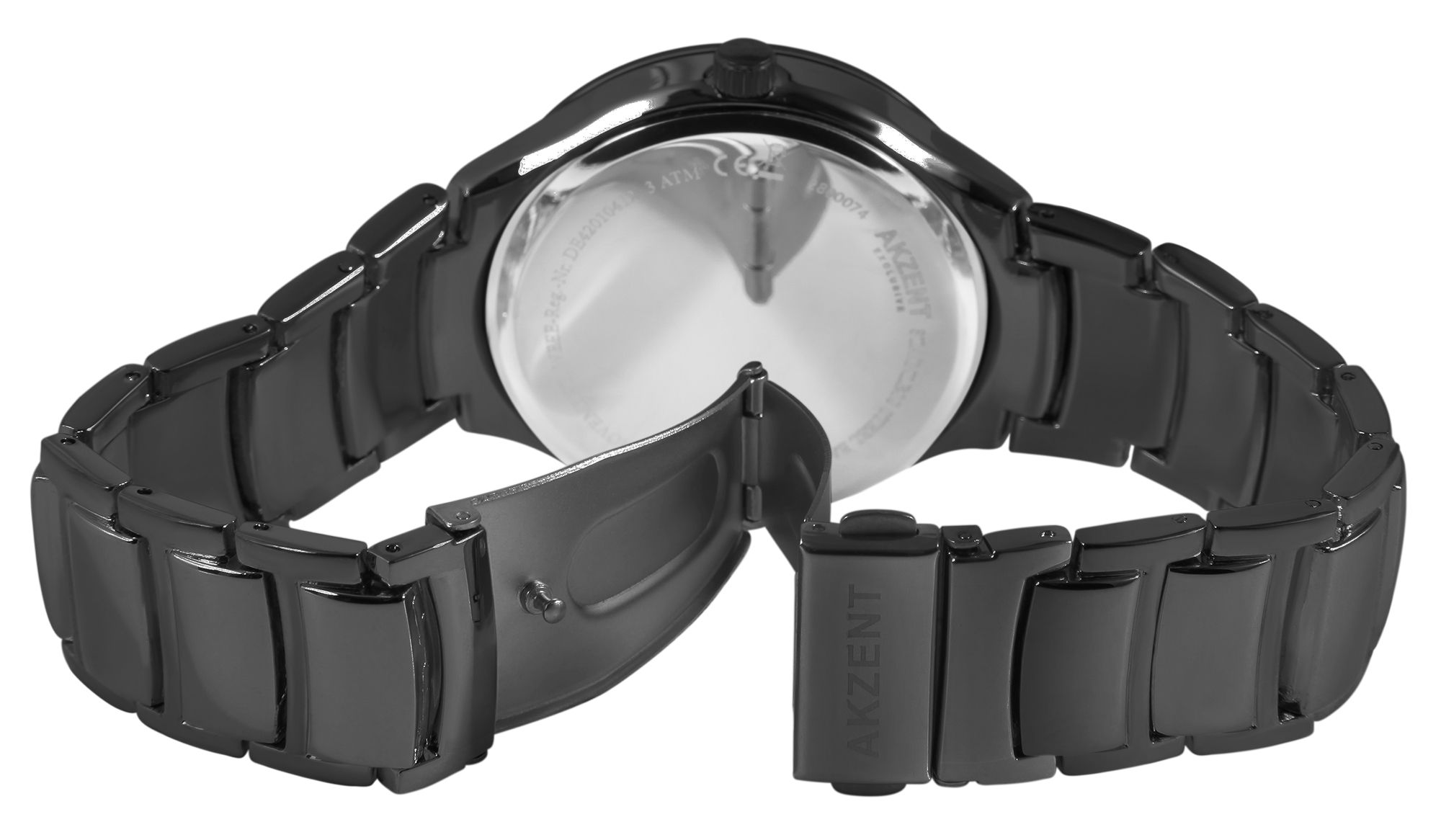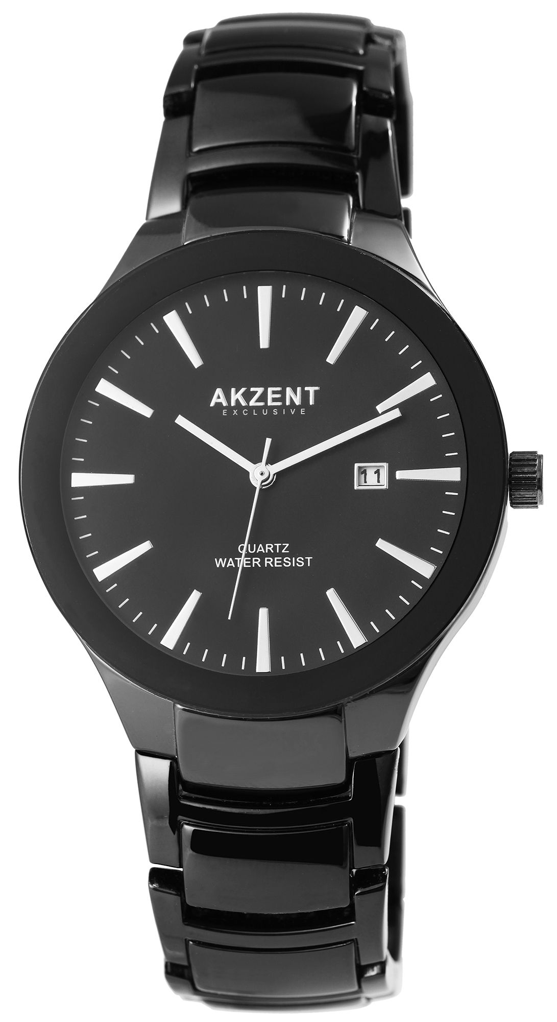Die analoge 3-Zeiger Herrenarmbanduhr der Marke Akzent Exclusive verfügt über ein hochwertiges Quarzuhrwerk. Das schwarze Metallarmband ist am Anstoß 23 mm breit und lässt sich mit einem schwarzen Clipverschluss öffnen und schließen. Die Gesamtlänge der Uhr beträgt 22 cm. Das schwarze Metallgehäuse mit Mineralglas hat eine Abmessung von 42 mm im Durchmesser und einer Gehäusehöhe von 9 mm. Der Gehäuseboden ist aus Edelstahl gefertigt und die Uhr hat eine Wasserdichtigkeit von 3 bar. Ein optisches Highlight ist der 3 mm breite schwarze Spiegelrand auf dem Glas, der der Uhr einen besonders eleganten Look verleiht. Das Zifferblatt ist ebenfalls schwarz und die Zeiger und Ziffern sind silberfarben. Sie heben sich dem Zifferblatt optisch hervor und unterstreichen den eleganten Look der Uhr.