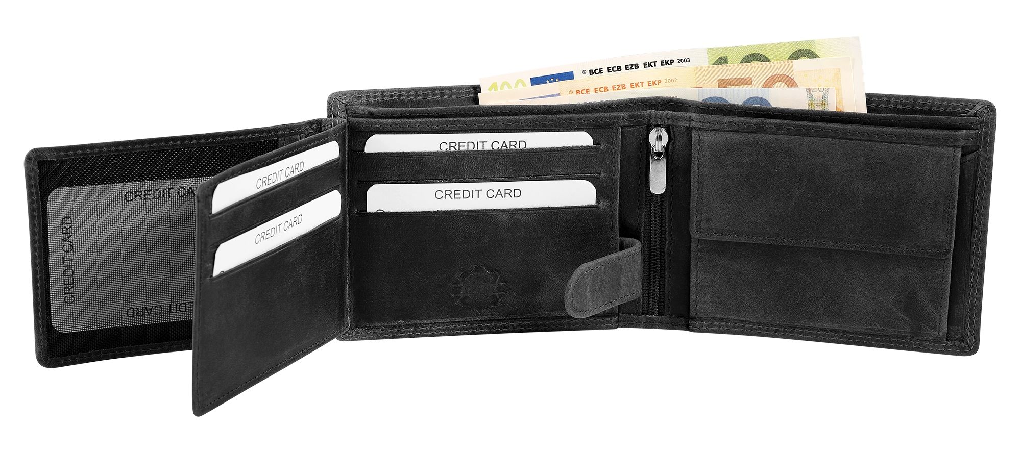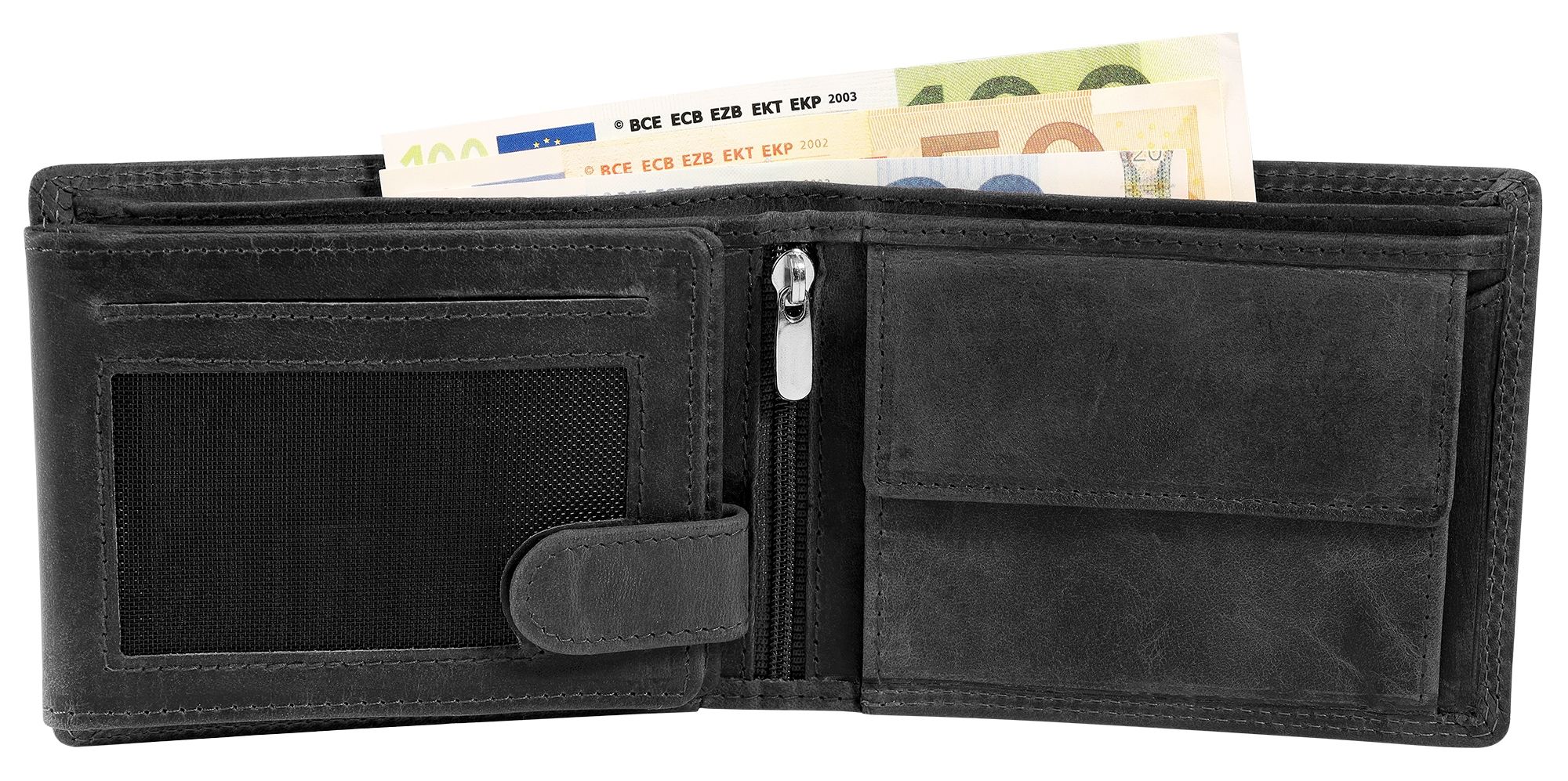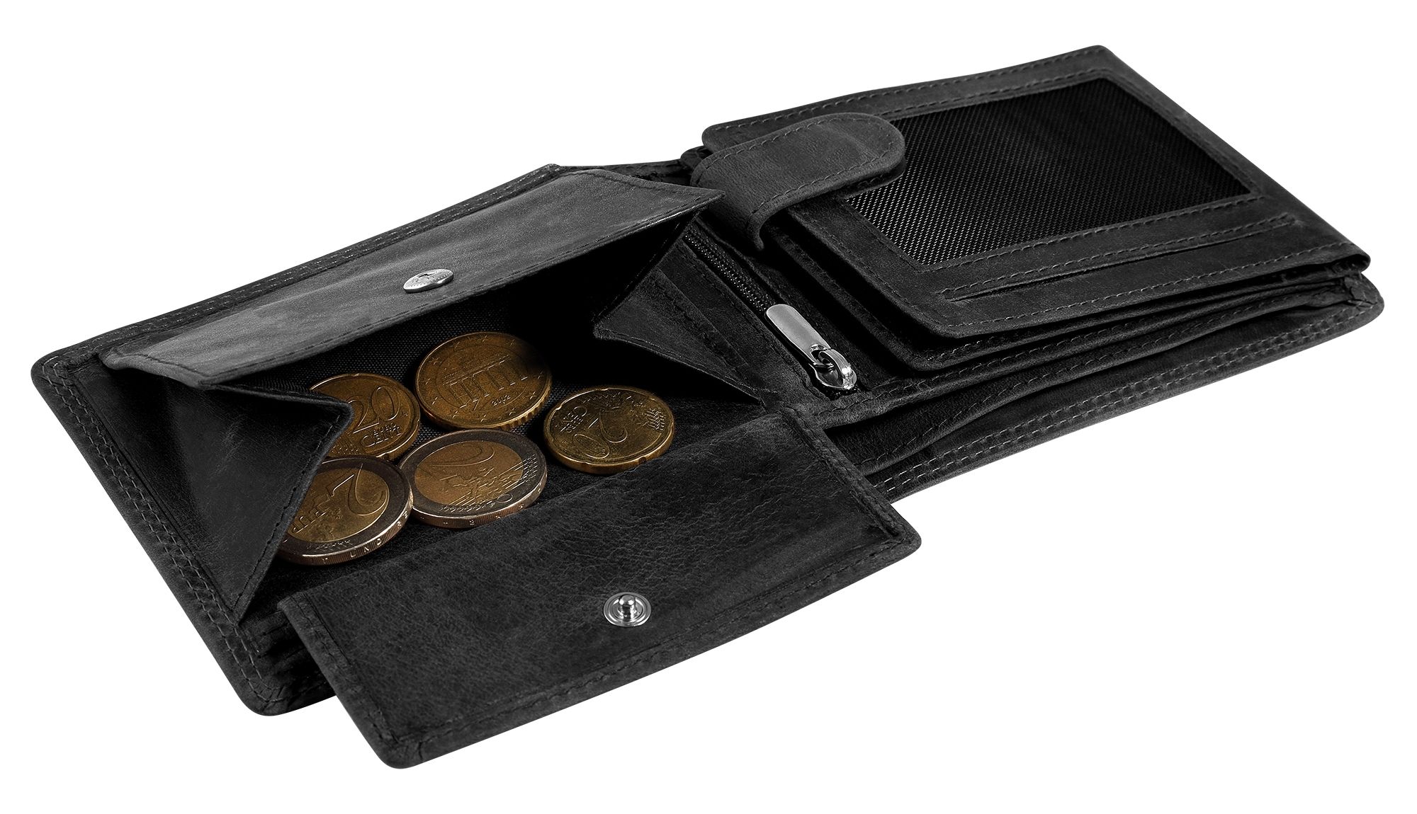 Die Geldbörse der Marke Akzent wurde im Querformat aus Echtleder hergestellt und zeigt sich durch die Prägung in Form eines Totenkopfes im unverkennbarem Design. Die Geldbörse ist ein wahres Platzwunder und bietet viel Stauraum für alle wichtigen Dokumente. Die Doppelnaht im Außen- und Innenbereich sorgt für eine gute Haltbarkeit und Stabilität. Durch die komfortable Einteilung verfügt sie über 6 Kreditkartenfächer, 2 Geldscheinfächer, 1 Münzfach mit Druckknopfverschluss, 1 Reißverschlussfach im inneren Bereich, 2 Einsteckfächer und 3 transparente Ausweisfächer und mittels eines extra Druckknopfverschluss im Innern werden die Karten sicher verwahrt. Die Größe ergibt sich ungefüllt aus einer Länge von 9 cm, einer Breite von 12 cm und einer Stärke von 2 cm. Ein tolles Accessoire mit optimaler Größe für den täglichen Gebrauch.