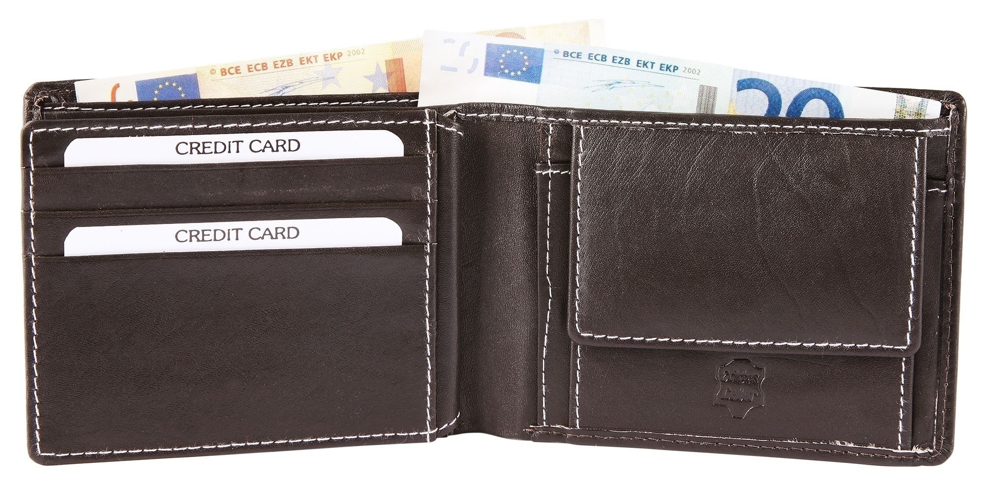 Akzent Herren Geldbörse aus Echtleder. Die Querformat-Geldbörse ist 12 cm breit und 9 cm hoch. Die Farbe ist Dunkelbraun. Sie verfügt über 2 Geldscheinfächer, ein Kleingeldfach, 5 Kreditkartenfächer, ein transparentes Kreditkartenfach und ein transparentes Ausweisfach.
