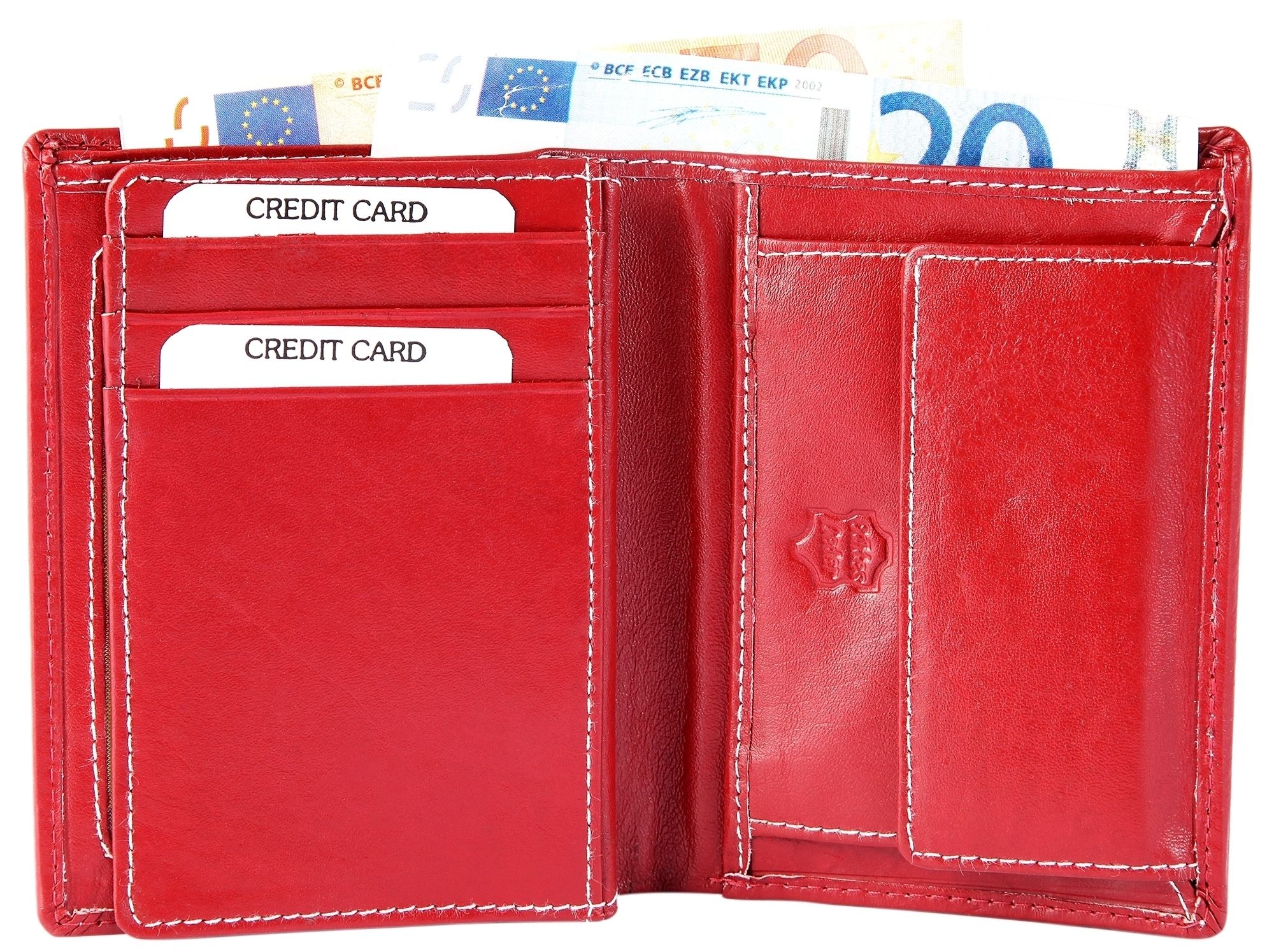 Akzent Herren Geldbörse aus Echtleder. Die Hochformat-Geldbörse ist 10 cm breit und 12 cm hoch. Die Farbe ist Rot. Sie verfügt über 2 Geldscheinfächer, ein Kleingeldfach, 6 Kreditkartenfächer, ein transparentes Kreditkartenfach und ein transparentes Ausweisfach.